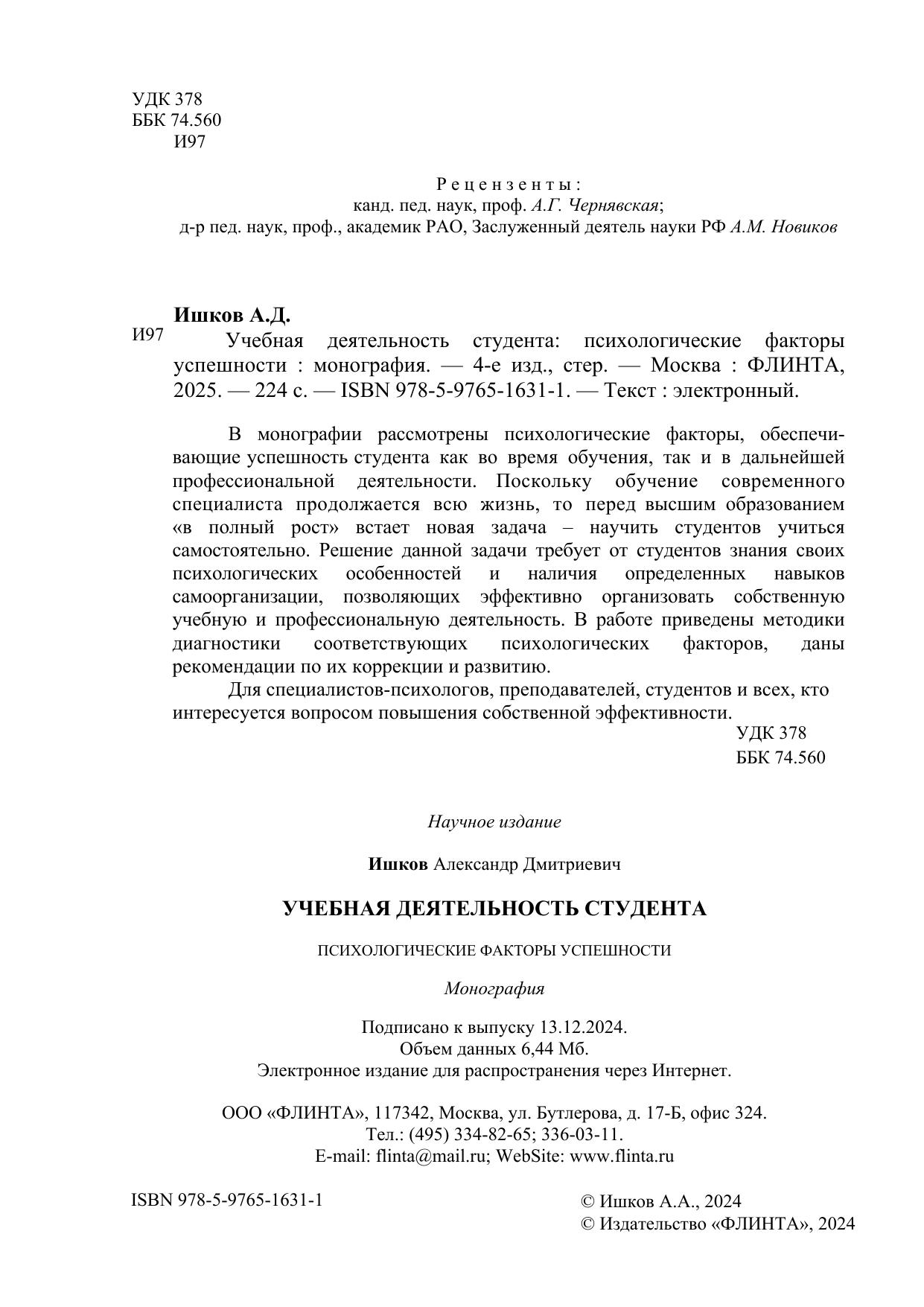 В монографии рассмотрены психологические факторы, обеспечивающие успешность студента как во время обучения, так и в дальнейшей профессиональной деятельности. Поскольку обучение современного специалиста продолжается всю жизнь, то перед высшим образованием «в полный рост» встает новая задача – научить студентов учиться самостоятельно. Решение данной задачи требует от студентов знания своих психологических особенностей и наличия определенных навыков самоорганизации, позволяющих эффективно организовать собственную учебную и профессиональную деятельность. В работе приведены методики диагностики соответствующих психологических факторов, даны рекомендации по их коррекции и развитию. Для специалистов-психологов, преподавателей, студентов и всех, кто интересуется вопросом повышения собственной эффективности.