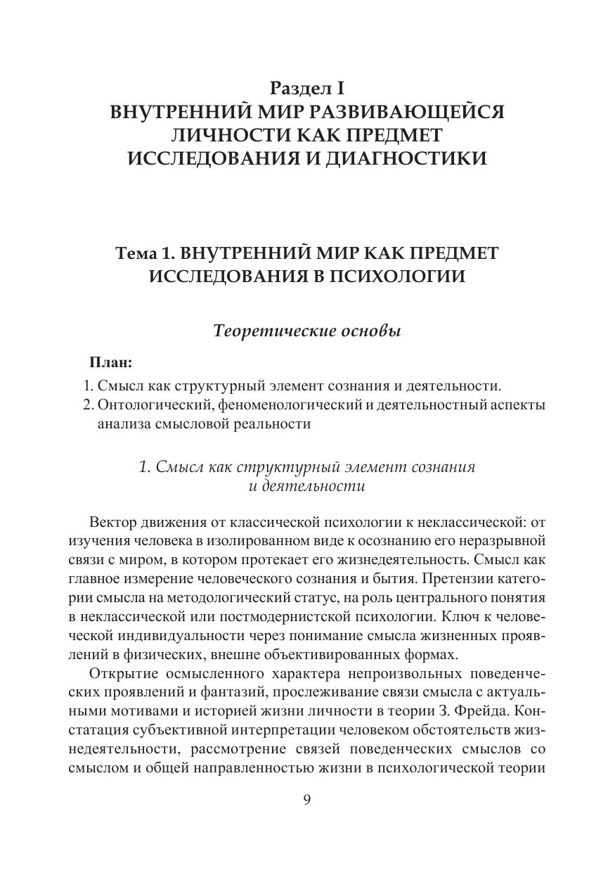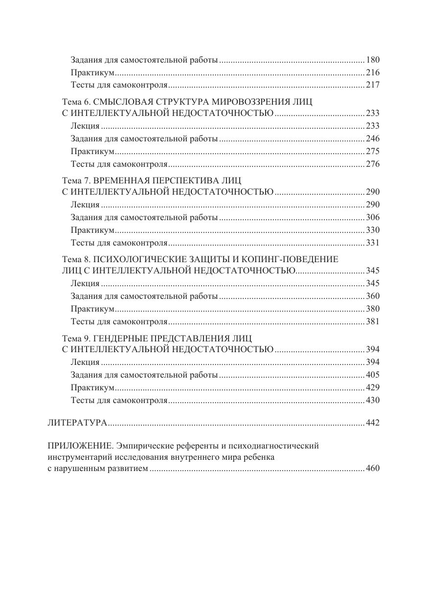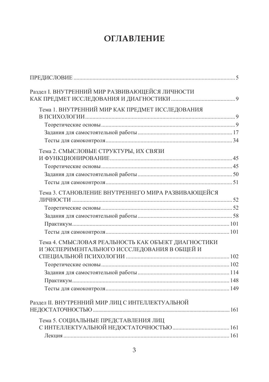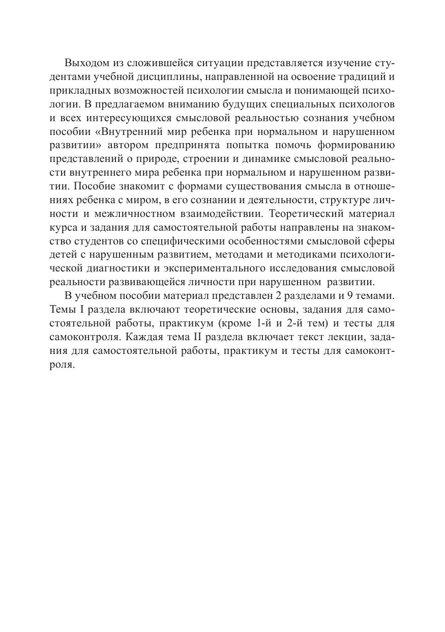 Пособие знакомит с формами существования смысла в отношениях ребенка с миром, в его сознании и деятельности, структуре личности и межличностном взаимодействии. Теоретический материал курса и задания для самостоятельной работы направлены на знакомство студентов со специфическими особенностями смысловой сферы детей с нарушенным развитием, методами и методиками психологической диагностики и экспериментального исследования смысловой реальности развивающейся личности при нормальном и нарушенном развитии. Пособие содержит лекции и планы семинарских занятий, дополнительные теоретические материалы и задания для самостоятельной работы, тестовые задания для самоконтроля, перечень рекомендуемой литературы. Материал курса «Внутренний мир развивающейся личности при нормальном и нарушенном развитии» представлен 9 темами, объединенными в 2 раздела. Каждая тема включает содержание лекции, задания для самостоятельной работы, практикум и тесты для самоконтроля. Для студентов, магистрантов и преподавателей высших учебных заведений, интересующихся современными тенденциями развития специальной психологии и, в частности, психологии лиц с интеллектуальными нарушениями.
