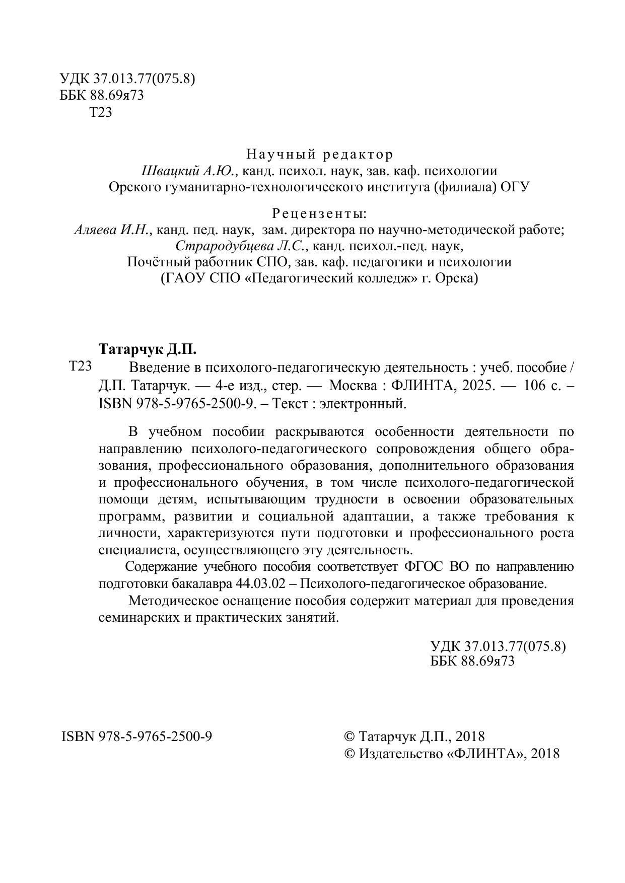 В учебном пособии раскрываются особенности деятельности по направлению психолого-педагогического сопровождения общего обра-зования, профессионального образования, дополнительного образования и профессионального обучения, в том числе психолого-педагогической помощи детям, испытывающим трудности в освоении образовательных программ, развитии и социальной адаптации, а также требования к личности, характеризуются пути подготовки и профессионального роста специалиста, осуществляющего эту деятельность. Содержание учебного пособия соответствует ФГОС ВО по направлению подготовки бакалавра 44.03.02 – Психолого-педагогическое образование. Методическое оснащение пособия содержит материал для проведения семинарских и практических занятий.