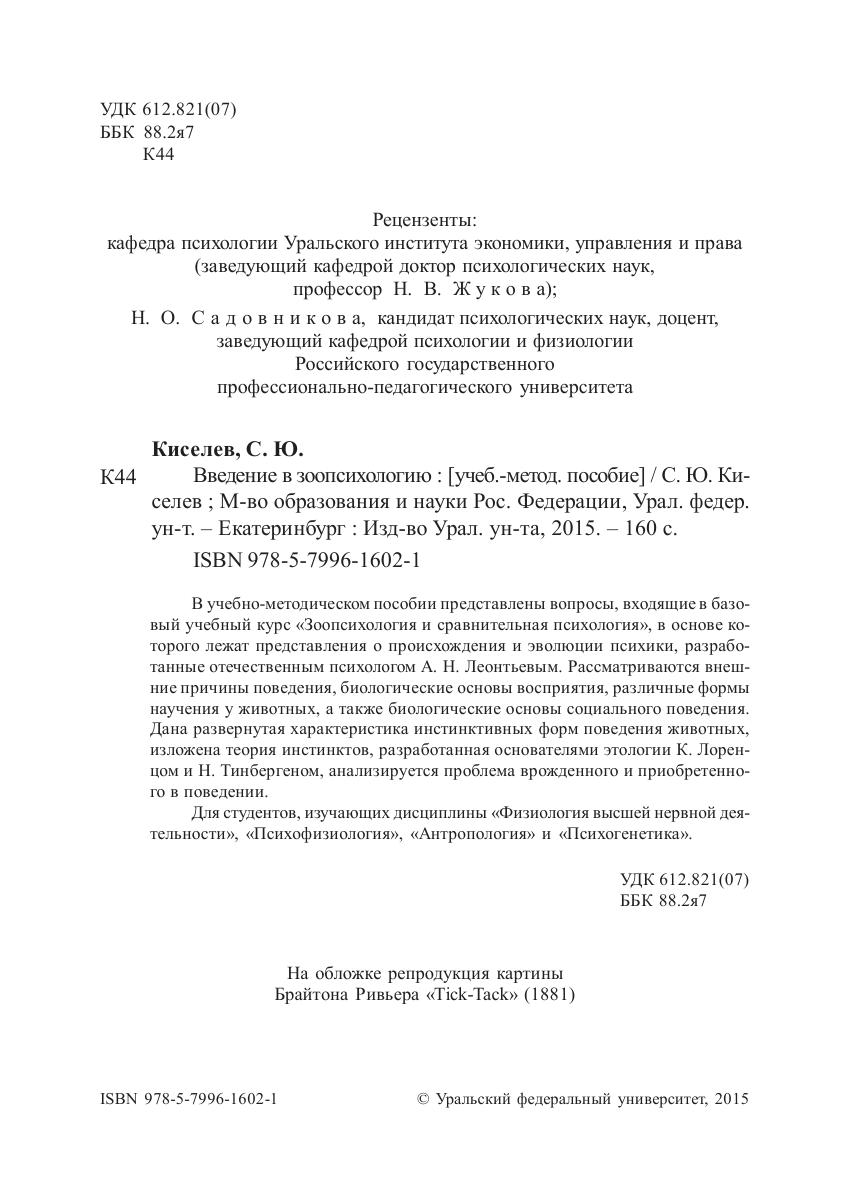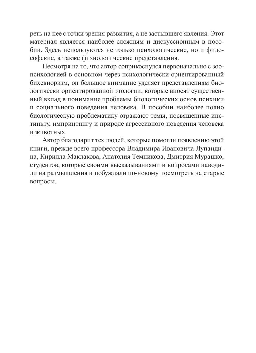 В учебно-методическом пособии представлены вопросы, входящие в базовый учебный курс «Зоопсихология и сравнительная психология», в основе которого лежат представления о происхождения и эволюции психики, разработанные отечественным психологом А. Н. Леонтьевым. Рассматриваются внешние причины поведения, биологические основы восприятия, различные формы научения у животных, а также биологические основы социального поведения. Дана развернутая характеристика инстинктивных форм поведения животных, изложена теория инстинктов, разработанная основателями этологии К. Лоренцом и Н. Тинбергеном, анализируется проблема врожденного и приобретенного в поведении. Для студентов, изучающих дисциплины «Физиология высшей нервной деятельности», «Психофизиология», «Антропология» и «Психогенетика».