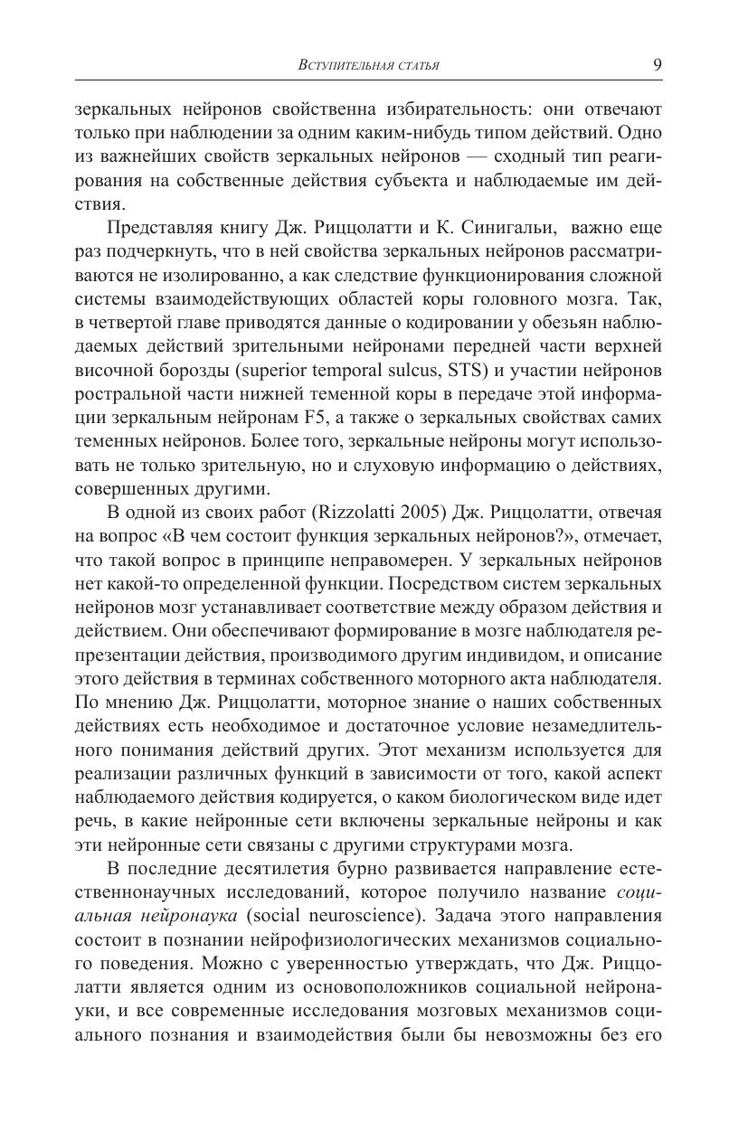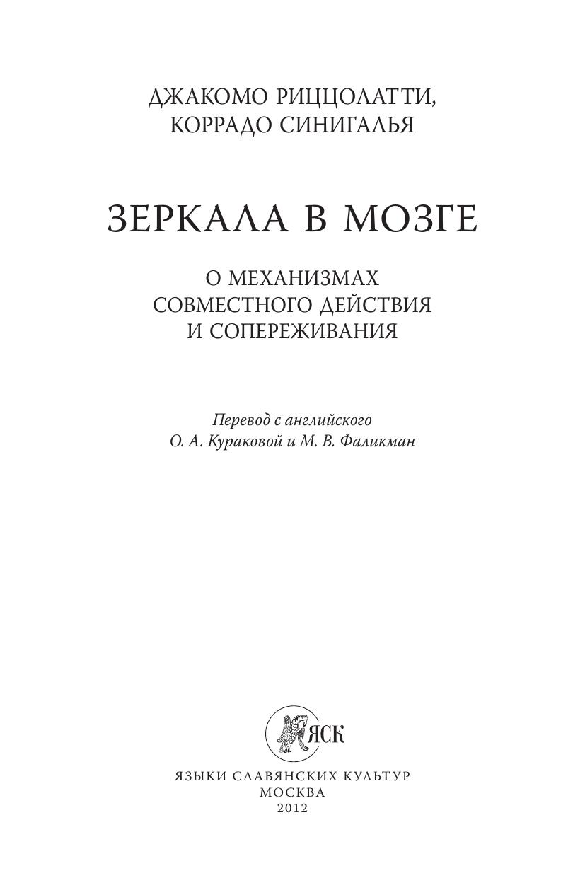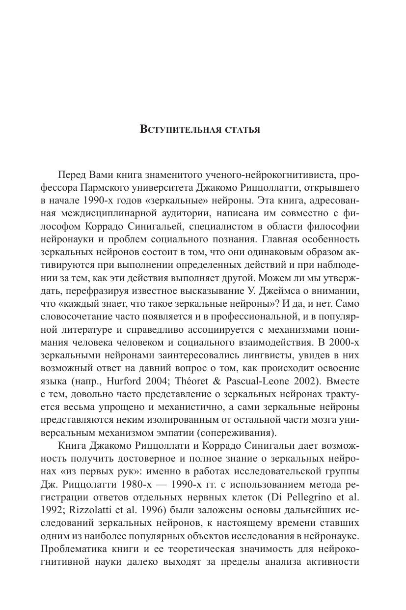 Книга нейрофизиолога Джакомо Риццолатти, написанная им в соавторстве с философом Коррадо Синигальей, посвящена проблеме, в изучении которой Риццолатти по праву считается одним из ведущих мировых специалистов. Это проблема так называемых «зеркальных нейронов» в головном мозге человека, играющих особую роль как в реализации простейших подражательных двигательных актов, так и в социальном познании и поведении человека. В книге читатель найдет сведения о новейших исследованиях мозговых механизмов, которые стоят за пониманием целенаправленных действий другого человека, освоением языка, распознаванием эмоций, сопереживанием и другими процессами, протекание которых неразрывно связано с работой системы зеркальных нейронов. Книга адресована специалистам в разных областях когнитивной науки: нейробиологам, лингвистам, психологам, философам, антропологам, а также всем читателям, интересующимся современными когнитивными исследованиями, в том числе в рамках одной из новых исследовательских областей, получившей название «социальная нейронаука».