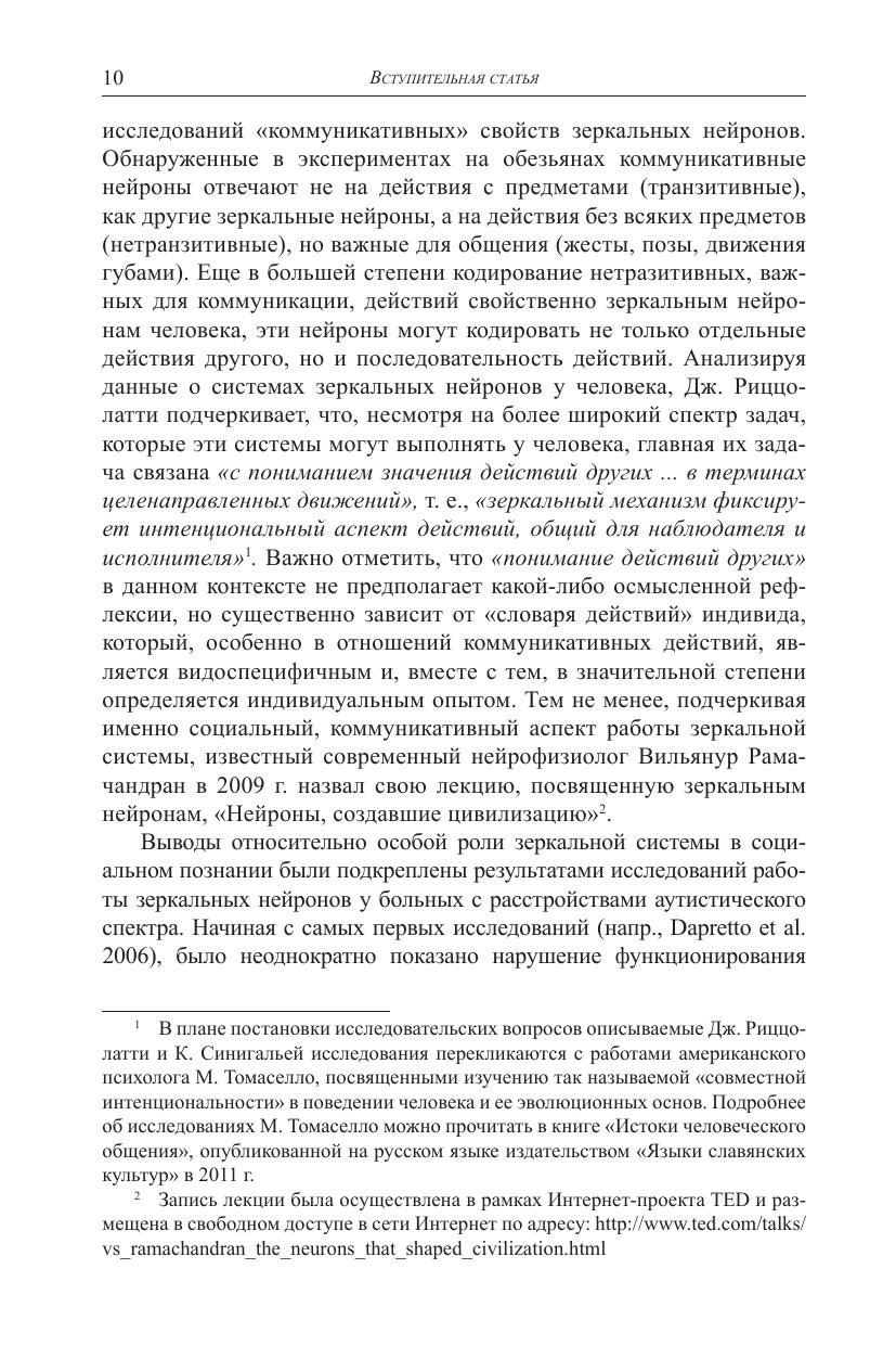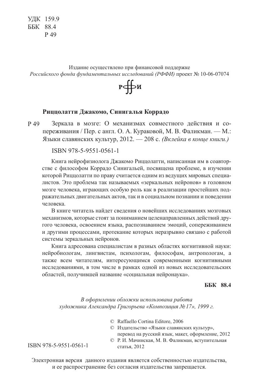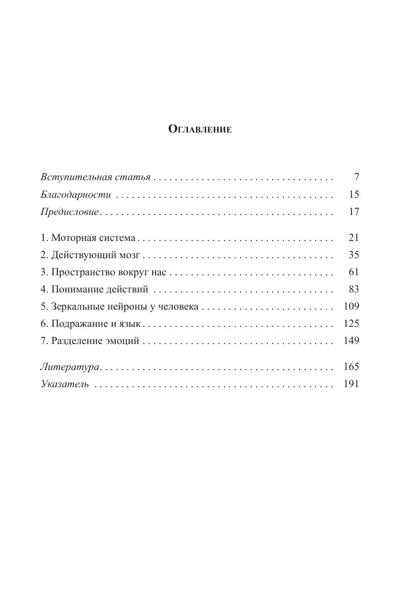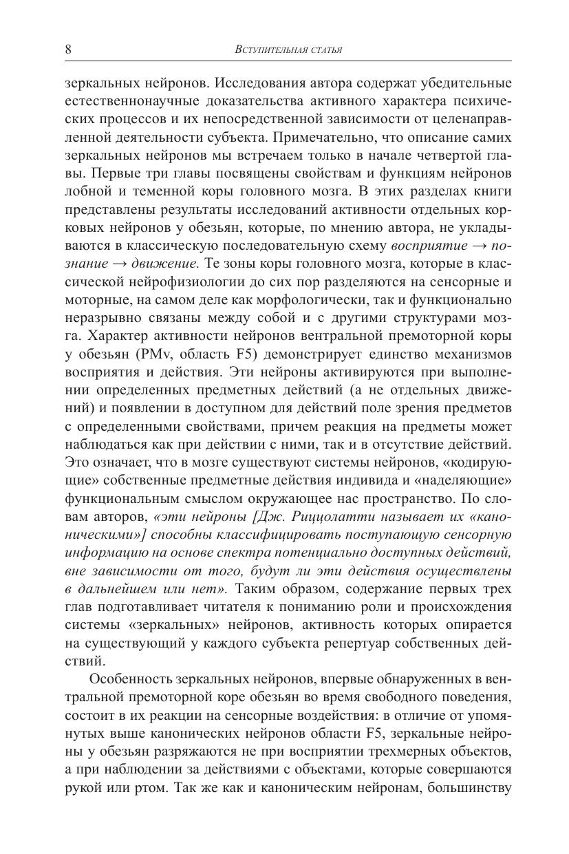 Книга нейрофизиолога Джакомо Риццолатти, написанная им в соавторстве с философом Коррадо Синигальей, посвящена проблеме, в изучении которой Риццолатти по праву считается одним из ведущих мировых специалистов. Это проблема так называемых «зеркальных нейронов» в головном мозге человека, играющих особую роль как в реализации простейших подражательных двигательных актов, так и в социальном познании и поведении человека. В книге читатель найдет сведения о новейших исследованиях мозговых механизмов, которые стоят за пониманием целенаправленных действий другого человека, освоением языка, распознаванием эмоций, сопереживанием и другими процессами, протекание которых неразрывно связано с работой системы зеркальных нейронов. Книга адресована специалистам в разных областях когнитивной науки: нейробиологам, лингвистам, психологам, философам, антропологам, а также всем читателям, интересующимся современными когнитивными исследованиями, в том числе в рамках одной из новых исследовательских областей, получившей название «социальная нейронаука».