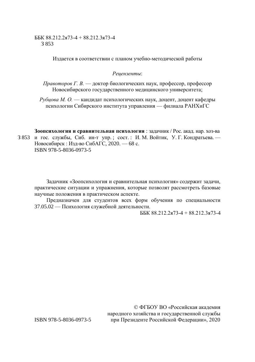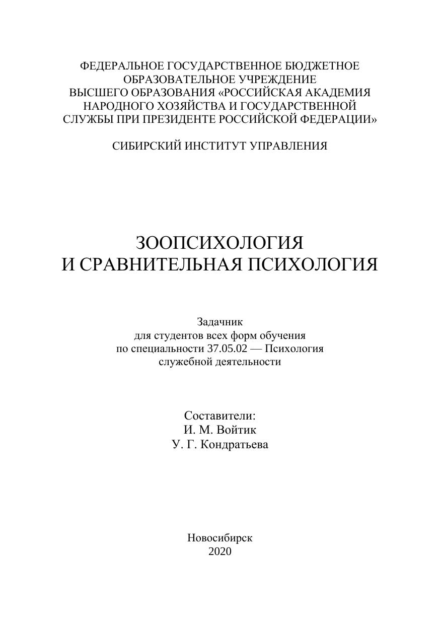 Задачник «Зоопсихология и сравнительная психология» содержит задачи, практические ситуации и упражнения, которые позволят рассмотреть базовые научные положения в практическом аспекте. Предназначен для студентов всех форм обучения по специальности 37.05.02 — Психология служебной деятельности.