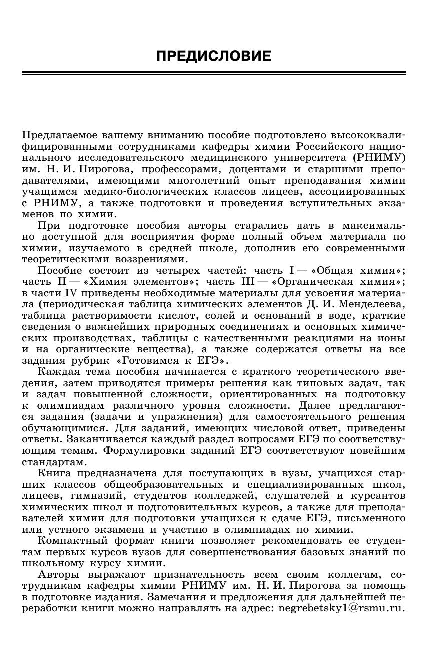 В пособии, подготовленном сотрудниками кафедры химии РНИМУ им. Н. И. Пирогова, ведущего медицинского вуза страны, рассмотрены все разделы школьного курса химии, необходимые для его успешного освоения и последующей сдачи в экзаменационном формате (ЕГЭ и др.). Каждый из разделов пособия состоит из краткого теоретического введения, типовых задач, задач повышенной сложности (олимпиадный уровень) и примеров их решения. Пособие также содержит типовые вопросы ЕГЭ по соответствующим темам для самостоятельной проработки материала. Книга ориентирована на учащихся старших классов общеобразовательных и специализированных школ, лицеев, гимназий, поступающих в вузы, студентов колледжей, слушателей химических школ и подготовительных курсов, а также преподавателей химии для подготовки учащихся к сдаче ЕГЭ и участию в олимпиадах по химии.