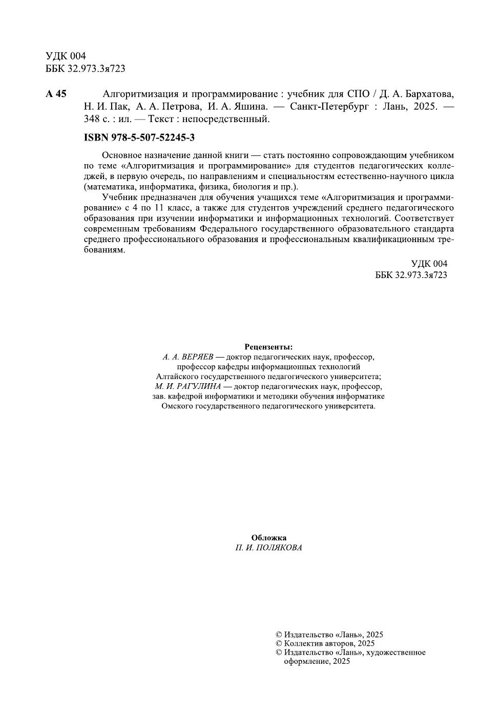 Основное назначение данной книги — стать постоянно сопровождающим учебником по теме «Алгоритмизация и программирование» для студентов педагогических колледжей, в первую очередь, по направлениям и специальностям естественно-научного цикла (математика, информатика, физика, биология и пр.). Учебник предназначен для обучения учащихся теме «Алгоритмизация и программирование» с 4 по 11 класс, а также для студентов учреждений среднего педагогического образования при изучении информатики и информационных технологий. Соответствует современным требованиям Федерального государственного образовательного стандарта среднего профессионального образования и профессиональным квалификационным требованиям.