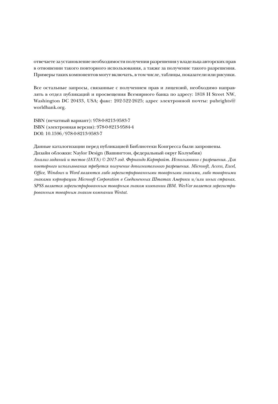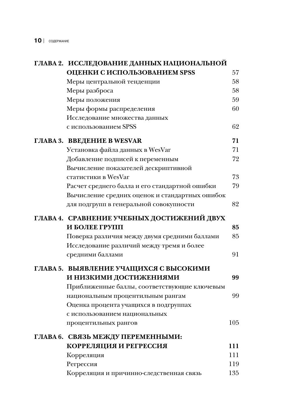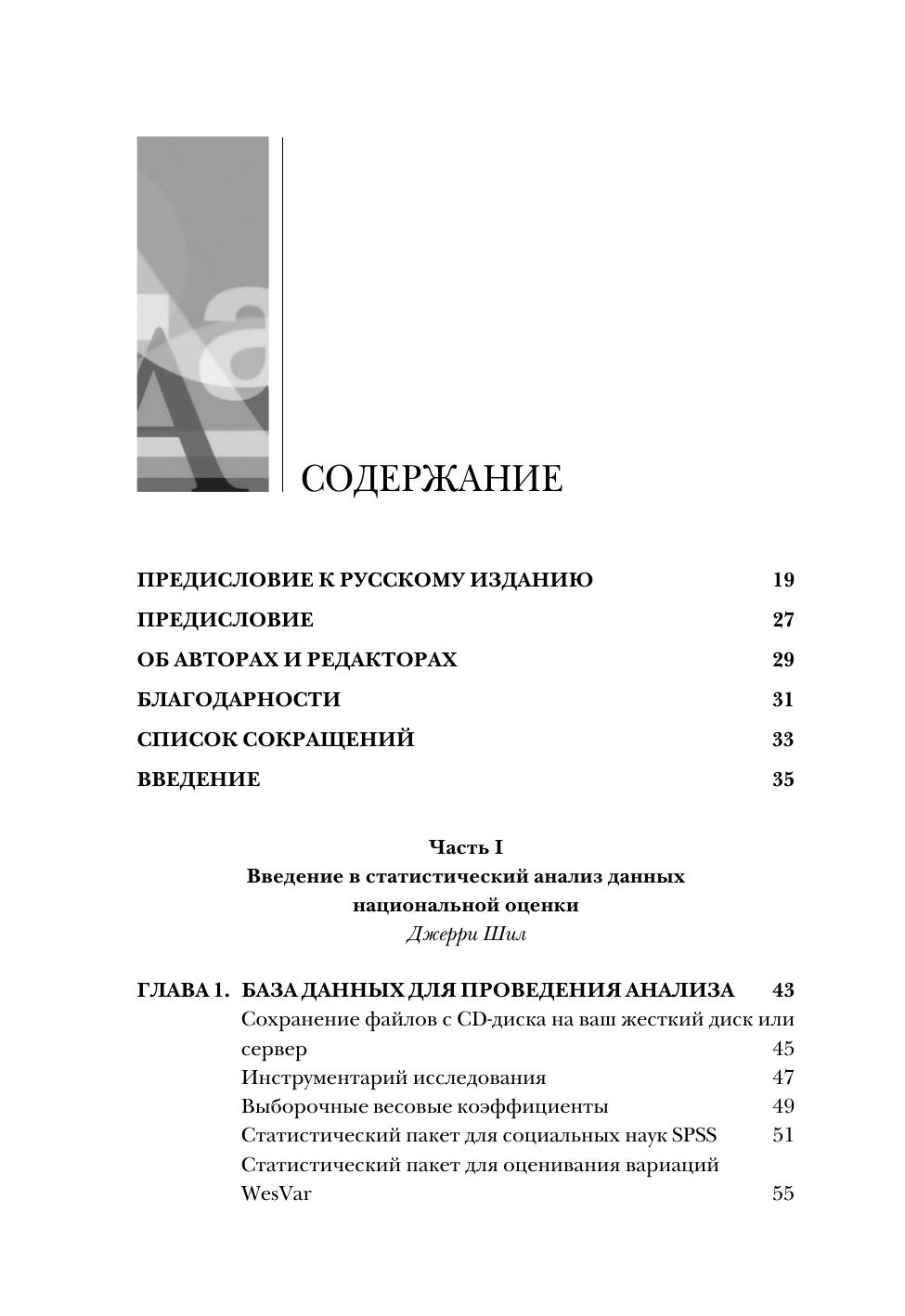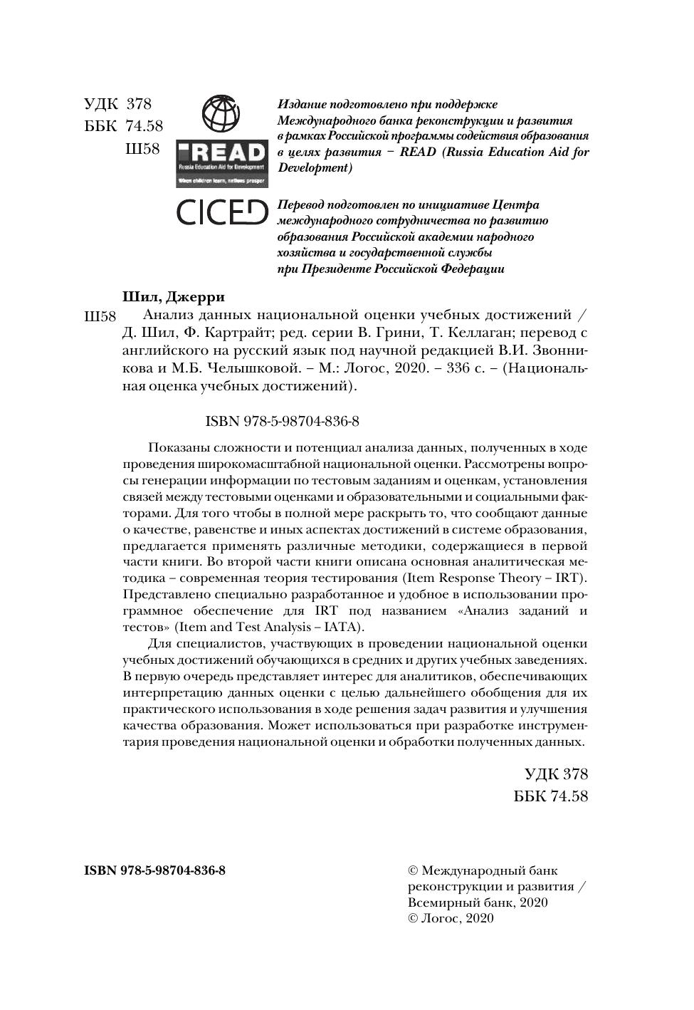 Показаны сложности и потенциал анализа данных, полученных в ходе проведения широкомасштабной национальной оценки. Рассмотрены вопросы генерации информации по тестовым заданиям и оценкам, установления связей между тестовыми оценками и образовательными и социальными факторами. Для того чтобы в полной мере раскрыть то, что сообщают данные о качестве, равенстве и иных аспектах достижений в системе образования, предлагается применять различные методики, содержащиеся в первой части книги. Во второй части книги описана основная аналитическая методика - современная теория тестирования (Item Response Theory - IRT). Представлено специально разработанное и удобное в использовании программное обеспечение для IRT под названием «Анализ заданий и тестов» (Item and Test Analysis - IATA). Для специалистов, участвующих в проведении национальной оценки учебных достижений обучающихся в средних и других учебных заведениях. В первую очередь представляет интерес для аналитиков, обеспечивающих интерпретацию данных оценки с целью дальнейшего обобщения для их практического использования в ходе решения задач развития и улучшения качества образования. Может использоваться при разработке инструментария проведения национальной оценки и обработки полученных данных.
