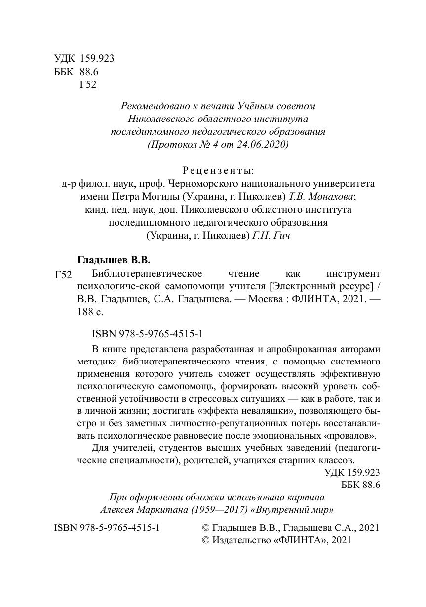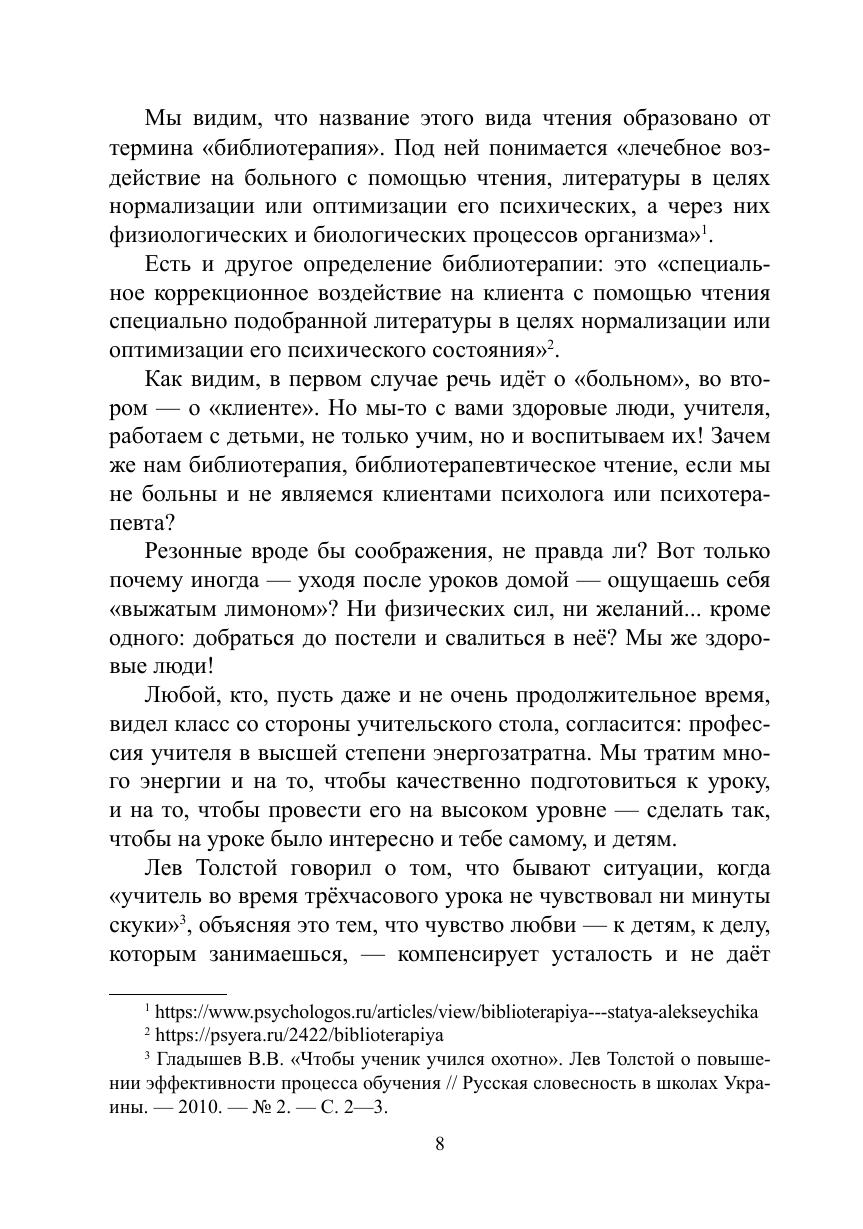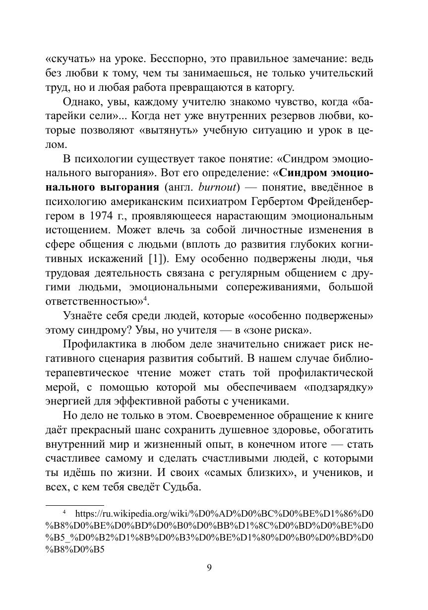 В книге представлена разработанная и апробированная авторами методика библиотерапевтического чтения, с помощью системного применения которого учитель сможет осуществлять эффективную психологическую самопомощь, формировать высокий уровень собственной устойчивости в стрессовых ситуациях — как в работе, так и в личной жизни; достигать «эффекта неваляшки», позволяющего быстро и без заметных личностно-репутационных потерь восстанавливать психологическое равновесие после эмоциональных «провалов».