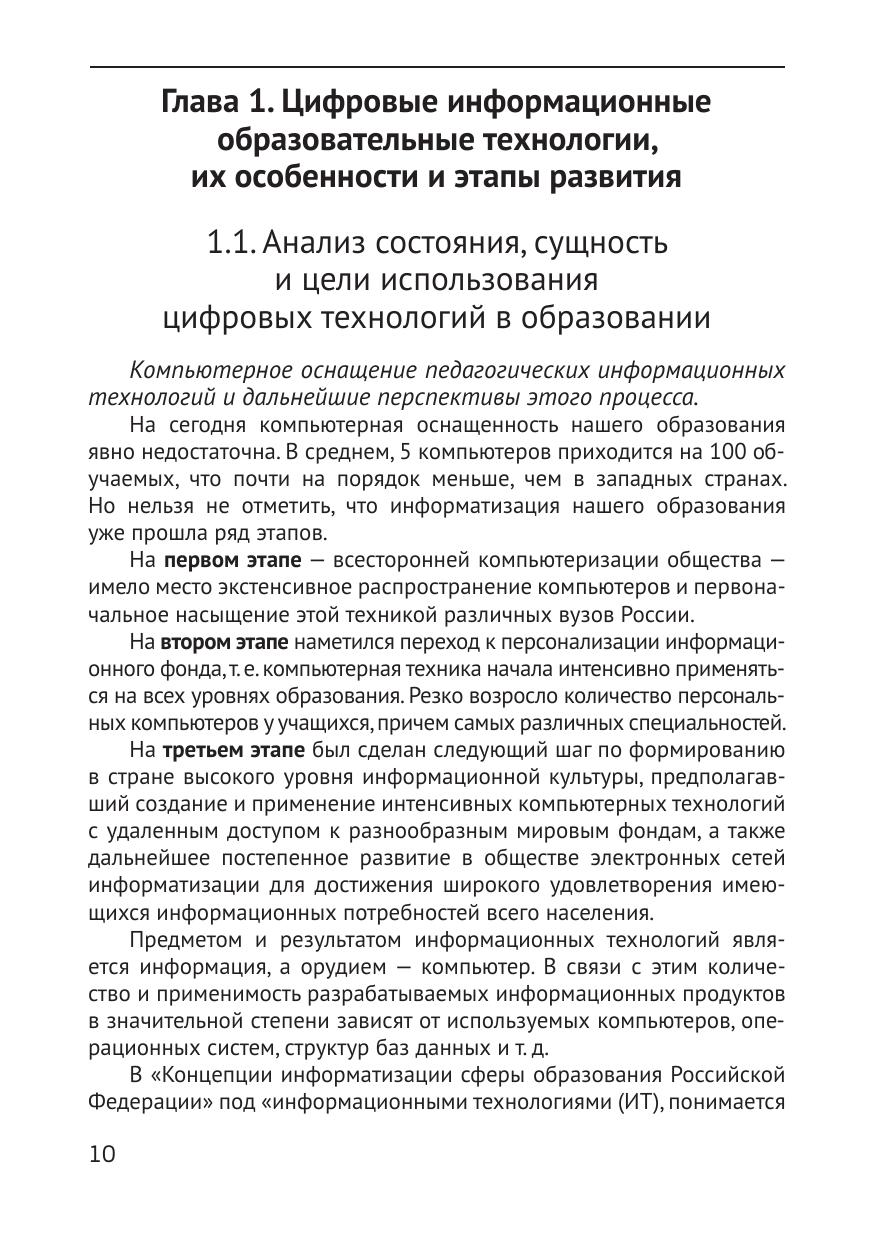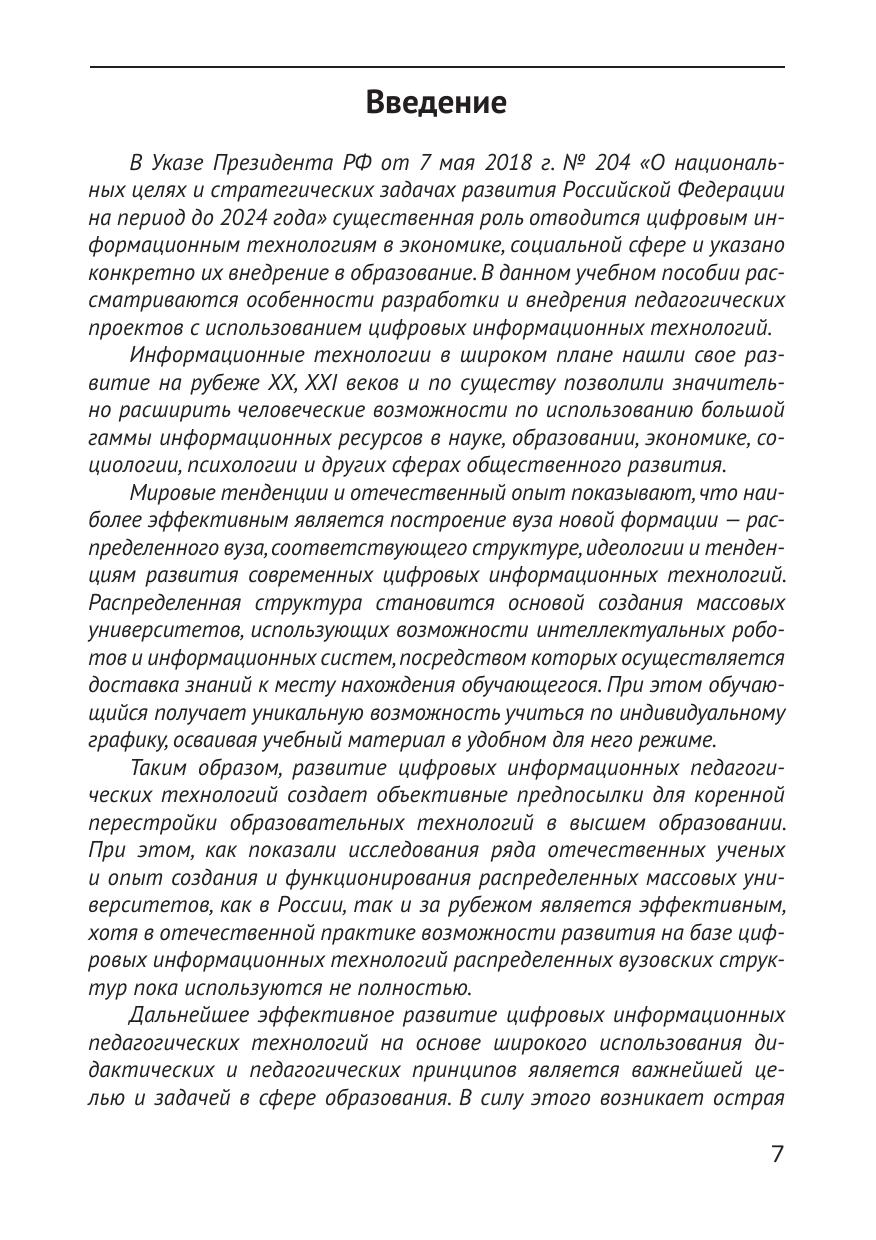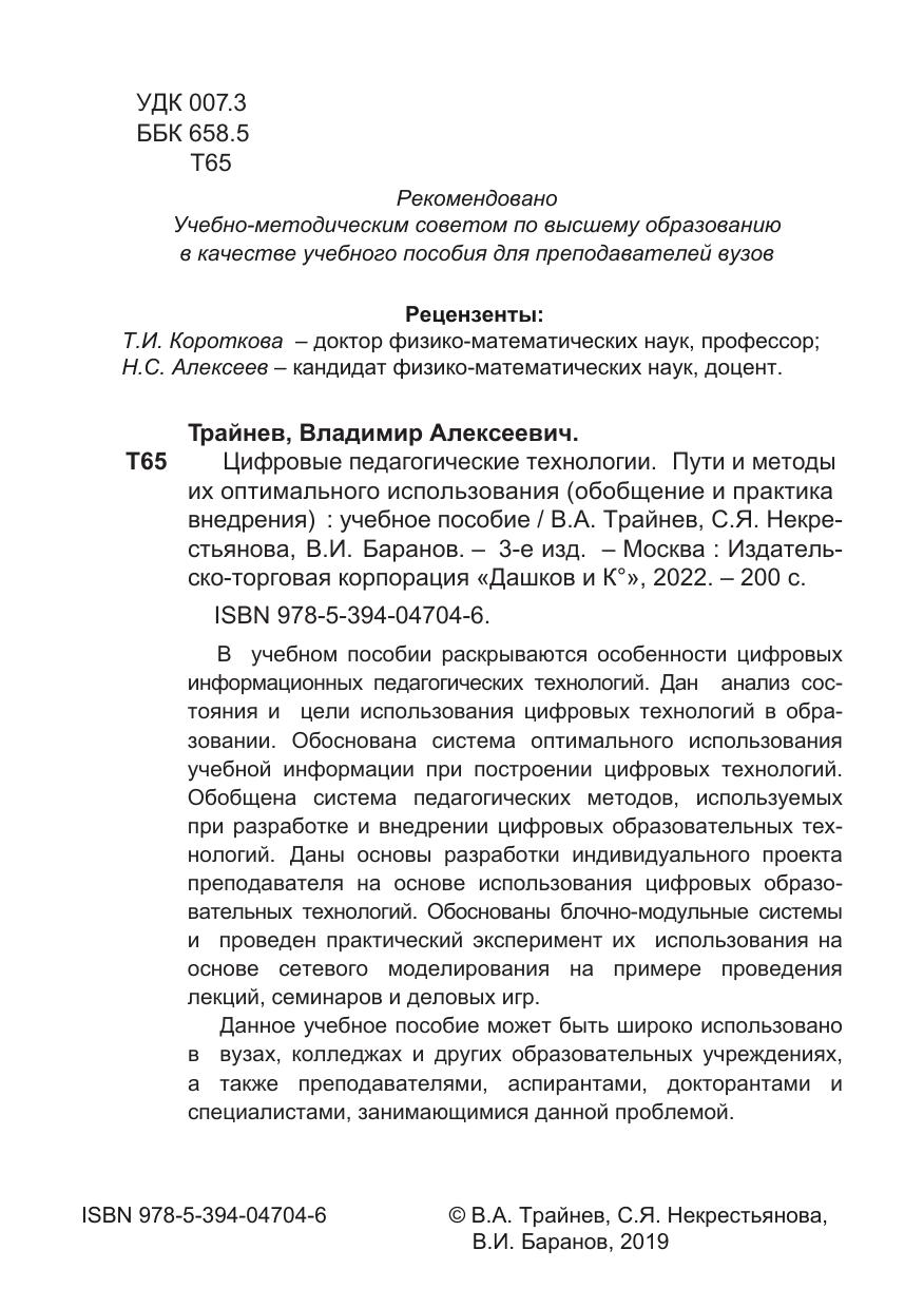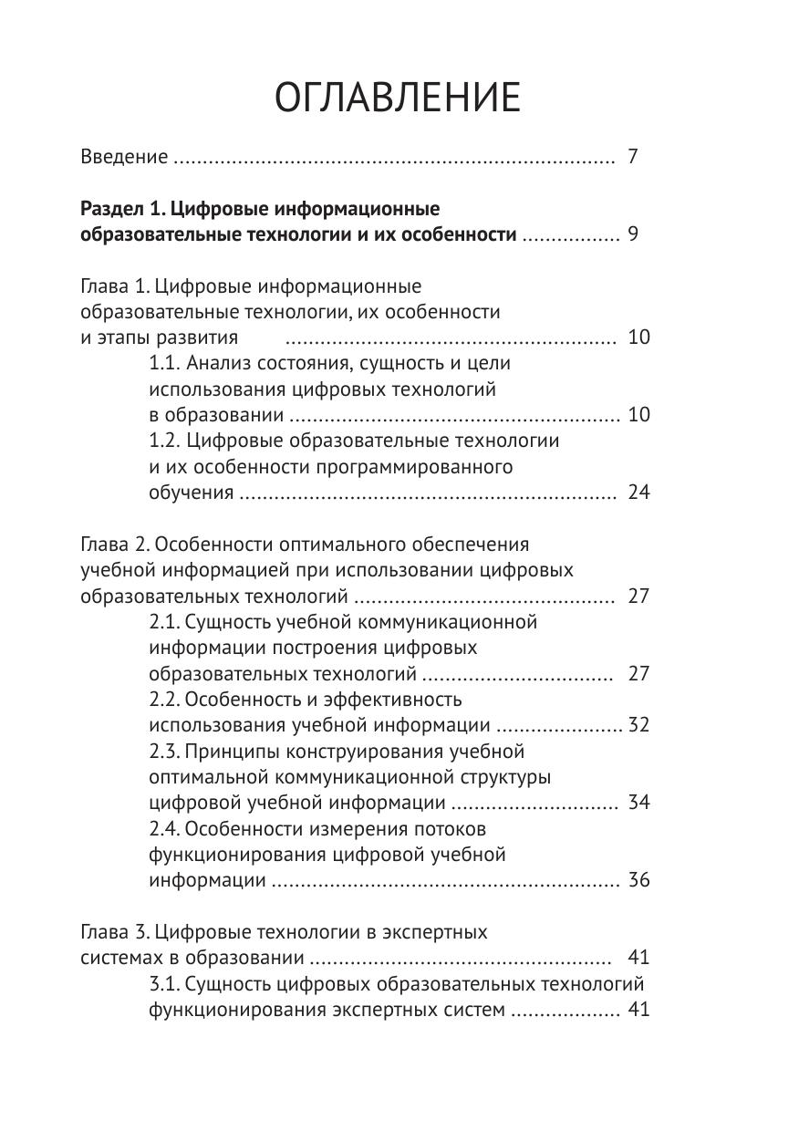 В учебном пособии раскрываются особенности цифровых информационных педагогических технологий. Дан анализ сос- тояния и цели использования цифровых технологий в образовании. Обоснована система оптимального использования учебной информации при построении цифровых технологий. Обобщена система педагогических методов, используемых при разработке и внедрении цифровых образовательных технологий. Даны основы разработки индивидуального проекта преподавателя на основе использования цифровых образовательных технологий. Обоснованы блочно-модульные системы и проведен практический эксперимент их использования на основе сетевого моделирования на примере проведения лекций, семинаров и деловых игр.