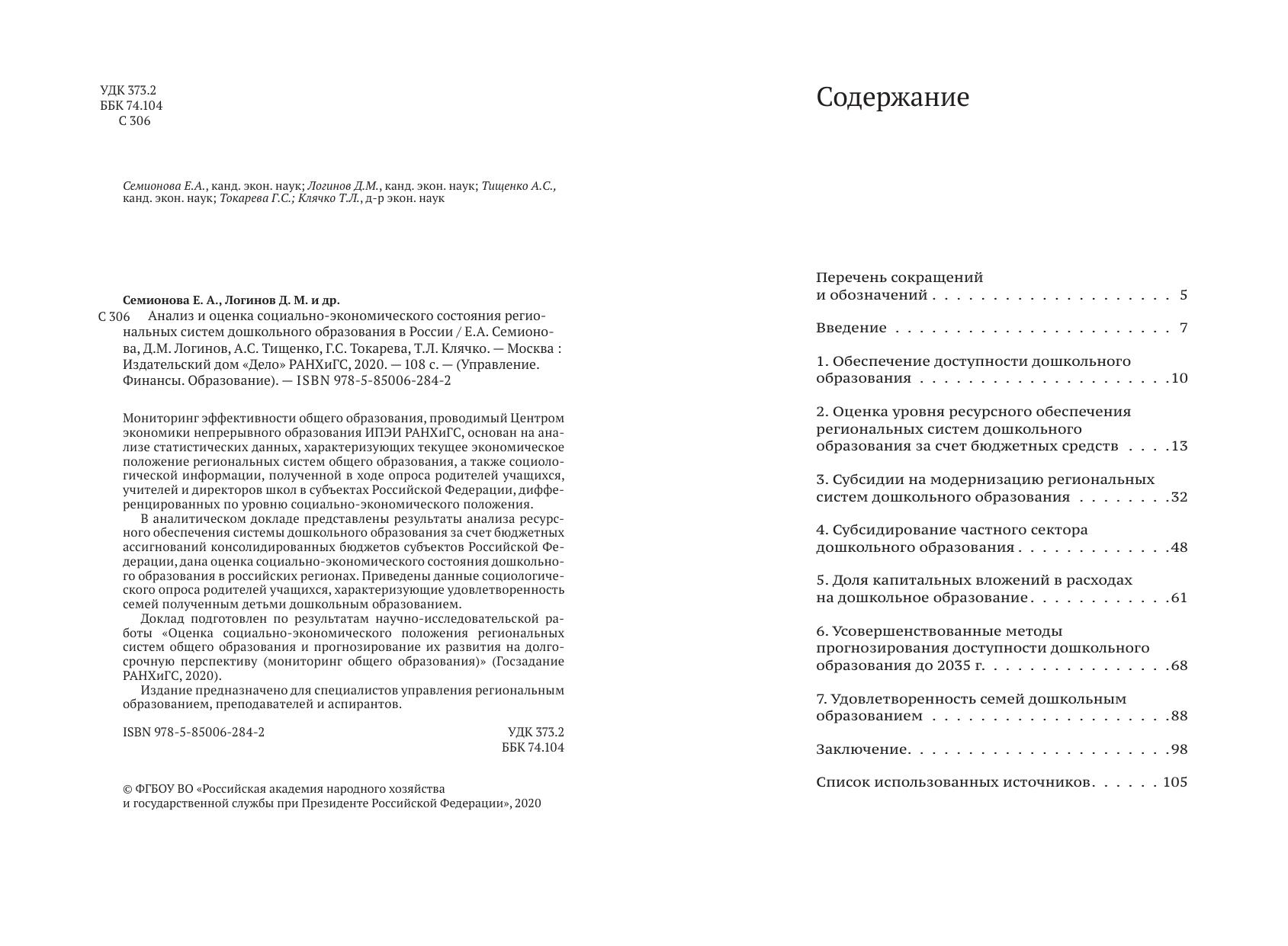В аналитическом докладе представлены результаты анализа ресурсного обеспечения системы дошкольного образования за счет бюджетных ассигнований консолидированных бюджетов субъектов Российской Федерации, дана оценка социально-экономического состояния дошкольного образования в российских регионах. Приведены данные социологического опроса родителей учащихся, характеризующие удовлетворенность семей полученным детьми дошкольным образованием.