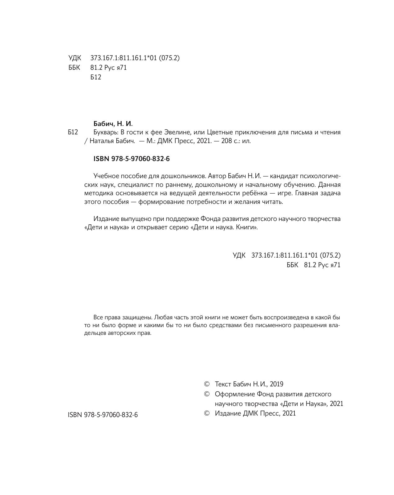 Учебное пособие для дошкольников. Автор Бабич Н. И. — кандидат психологических наук, специалист по раннему, дошкольному и начальному обучению. Данная методика основывается на ведущей деятельности ребенка — игре. Главная задача этого пособия — формирование потребности и желания читать.