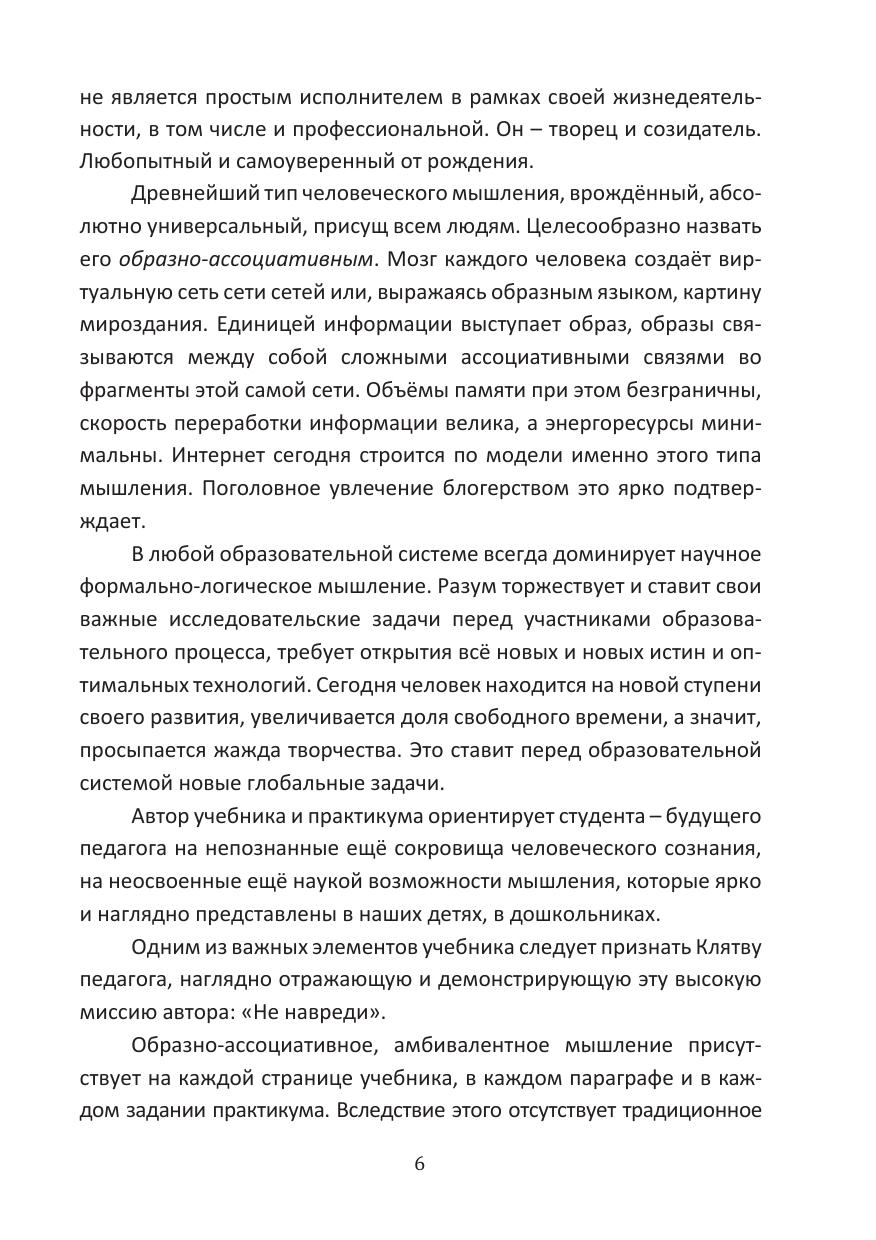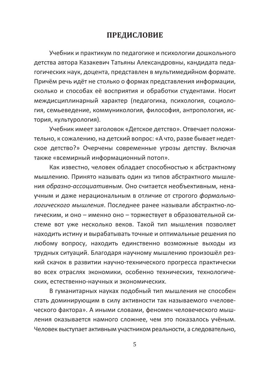 В учебнике и практикуме комплексно и системно исследован феномен детства. Автор ориентирует будущих педагогов на непознанные ещё сокровища человеческого сознания, на неосвоенные ещё наукой возможности мышления, которые ярко и наглядно представлены в детях-дошкольниках.