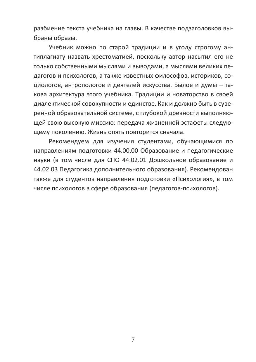 Для студентов вузов, обучающихся по направлению подготовки 44.00.00 Образование и педагогические науки, для студентов СПО, обучающихся по специальностям 44.02.01 Дошкольное образование и 44.02.03 Педагогика дополнительного образования. Рекомендован также для студентов направления подготовки 37.03.01 Психология, в том числе будущим психологам в сфере образования (педагог-психолог).