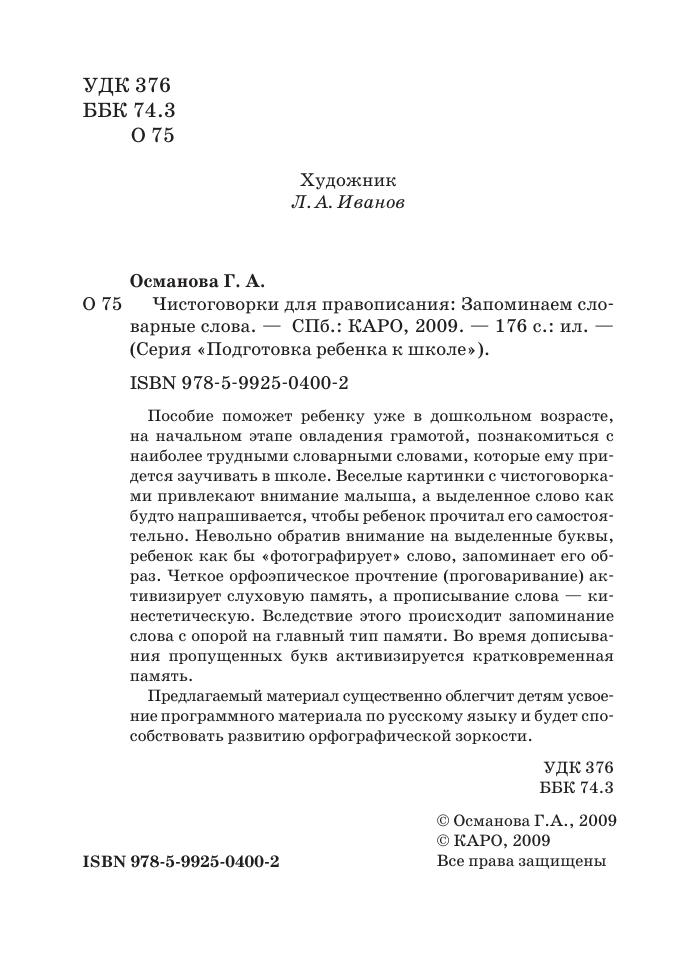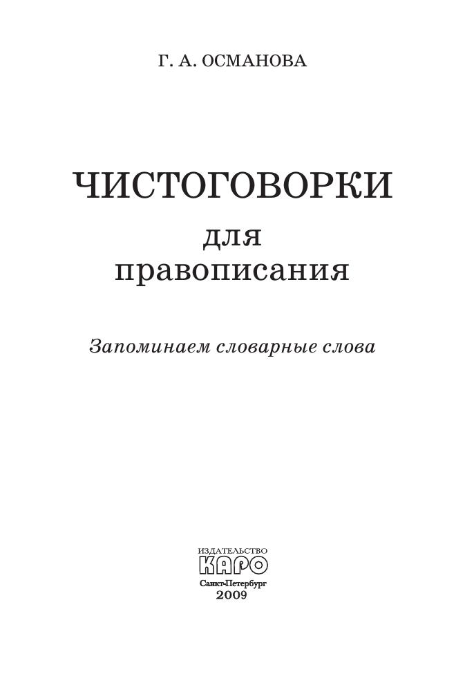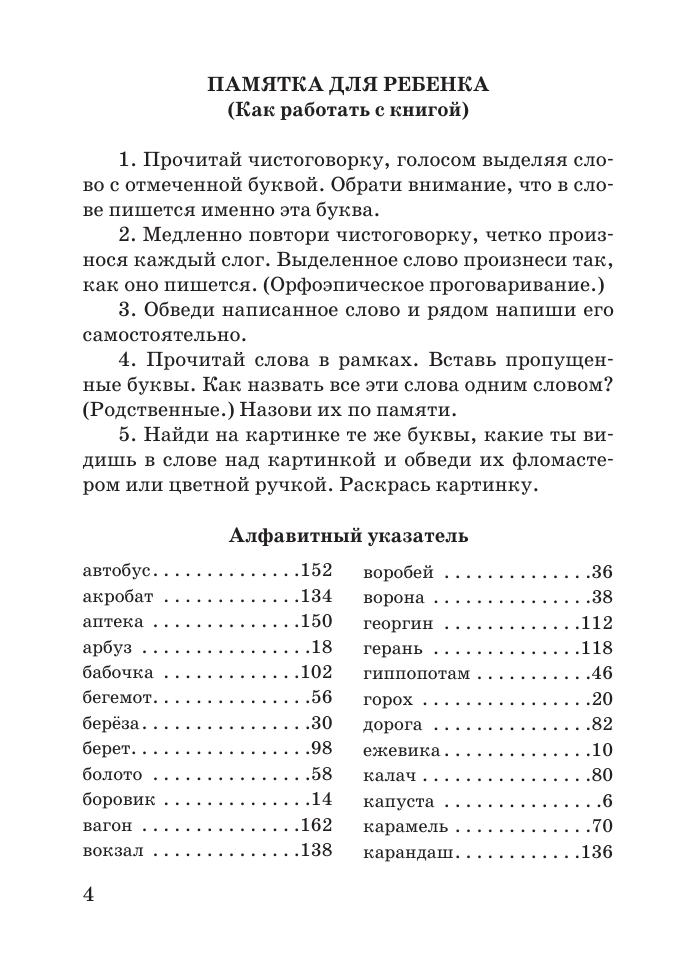Пособие поможет ребенку уже в дошкольном возрасте, на начальном этапе овладения грамотой, познакомиться с наиболее трудными словарными словами, которые ему придется заучивать в школе. Веселые картинки с чистоговорками привлекают внимание малыша, а выделенное слово как будто напрашивается, чтобы ребенок прочитал его самостоятельно. Невольно обратив внимание на выделенные буквы, ребенок как бы «фотографирует» слово, запоминает его образ. Четкое орфоэпическое прочтение (проговаривание) активизирует слуховую память, а прописывание слова — кинестетическую. Вследствие этого происходит запоминание слова с опорой на главный тип памяти. Во время дописывания пропущенных букв активизируется кратковременная память. Предлагаемый материал существенно облегчит детям усвоение программного материала по русскому языку и будет способствовать развитию орфографической зоркости.