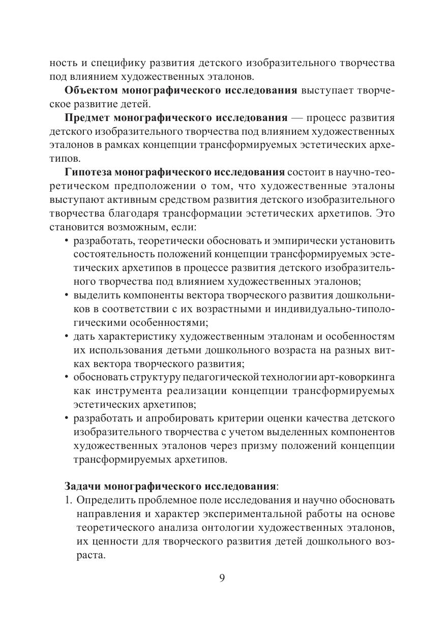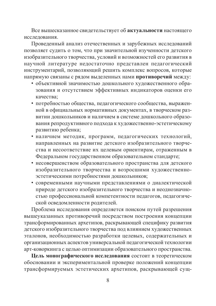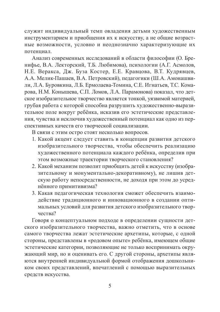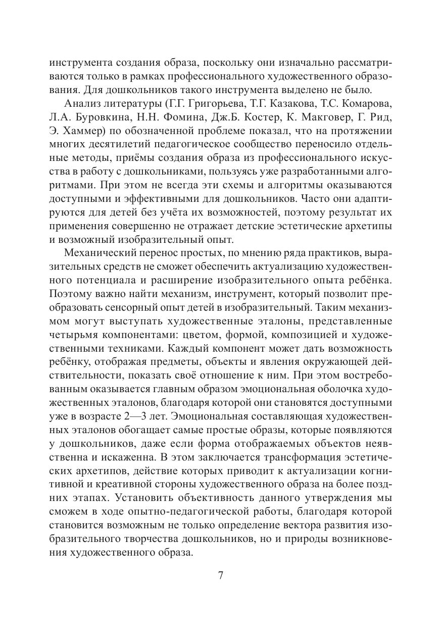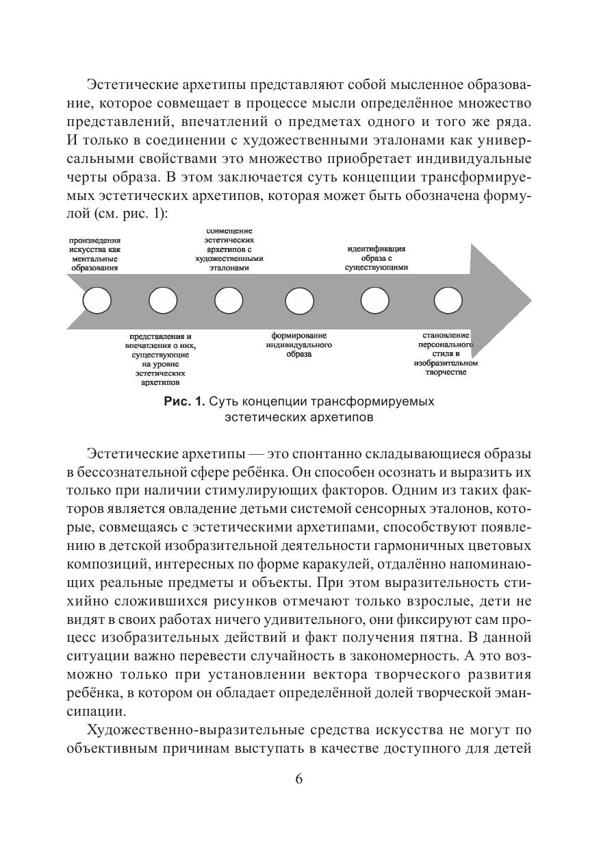 Монография посвящена изучению проблемы развития детского изобразительного творчества. В монографии представлена концепция трансформируемых эстетических архетипов, которая объясняет природу детского изобразительного творчества, факторы возникновения у детей дошкольного возраста художественного образа. В монографии подробно описана педагогическая технология арт-коворкинга, благодаря которой становится возможным актуализировать художественный потенциал детей. Центральной в монографии является тема определения значения и места художественных эталонов в системе художественного образования дошкольников. Проведен глубокий анализ, позволивший установить связь между эстетическими архетипами, художественными эталонами и детским изобразительным творчеством.