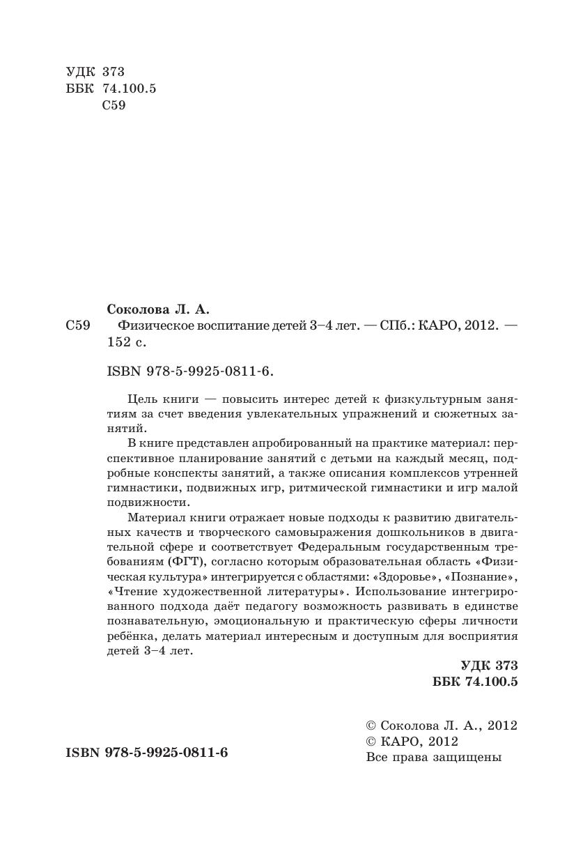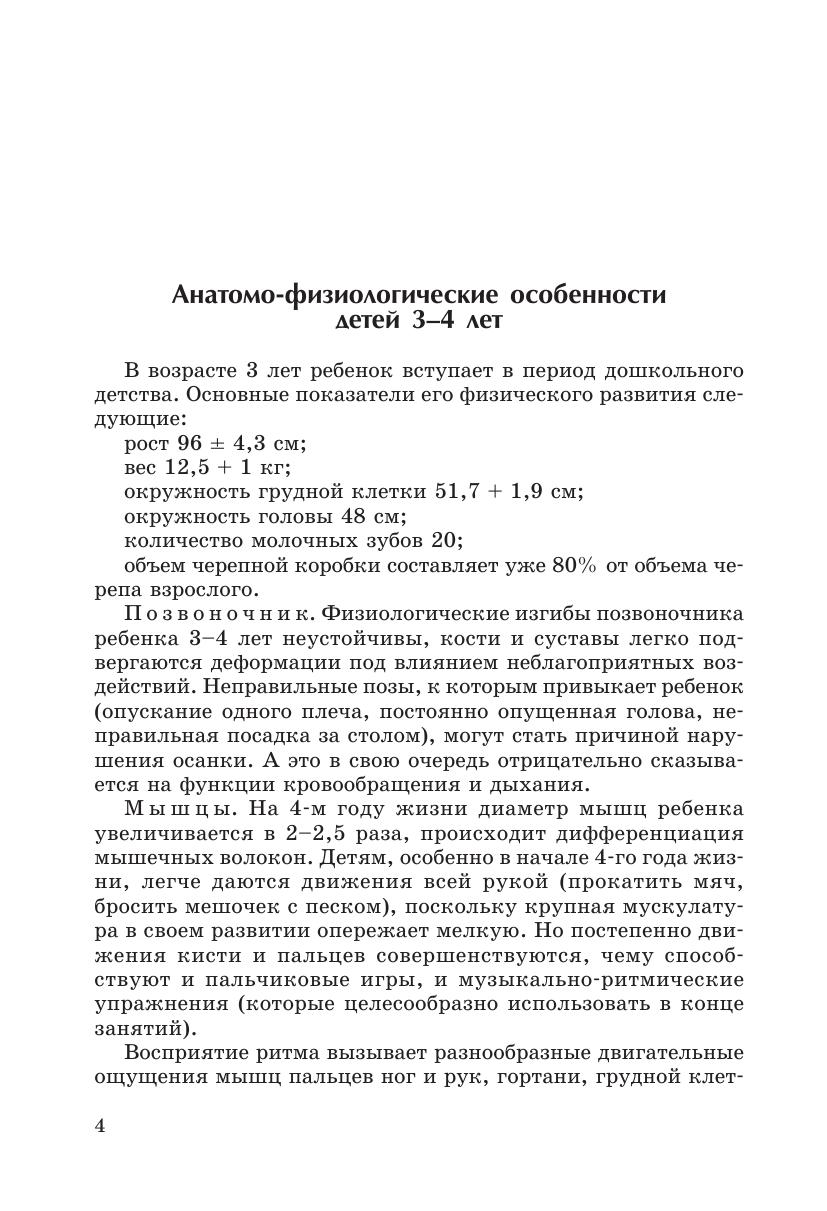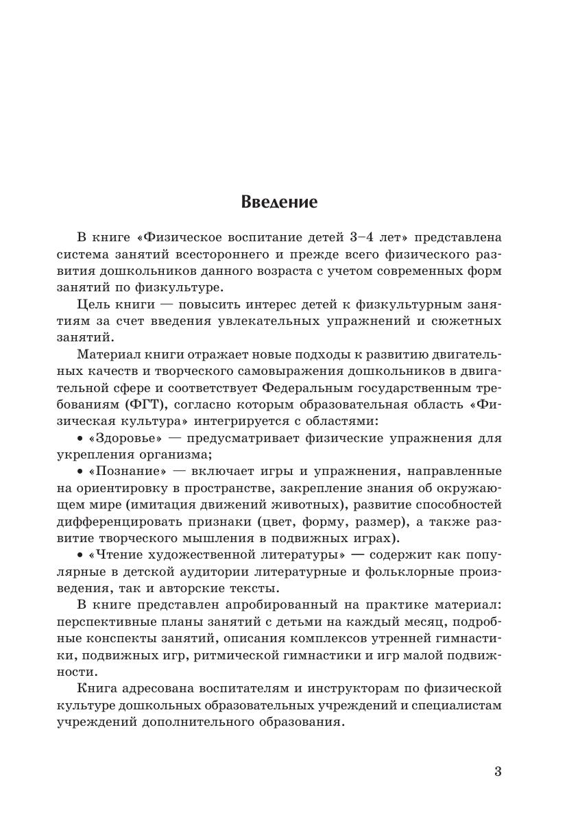 Цель книги — повысить интерес детей к физкультурным занятиям за счет введения увлекательных упражнений и сюжетных занятий. В книге представлен апробированный на практике материал: перспективное планирование занятий с детьми на каждый месяц, подробные конспекты занятий, а также описания комплексов утренней гимнастики, подвижных игр, ритмической гимнастики и игр малой подвижности. Материал книги отражает новые подходы к развитию двигательных качеств и творческого самовыражения дошкольников в двигательной сфере и соответствует Федеральным государственным требованиям (ФГТ), согласно которым образовательная область «Физическая культура» интегрируется с областями: «Здоровье», «Познание», «Чтение художественной литературы». Использование интегрированного подхода даёт педагогу возможность развивать в единстве познавательную, эмоциональную и практическую сферы личности ребёнка, делать материал интересным и доступным для восприятия детей 3–4 лет.
