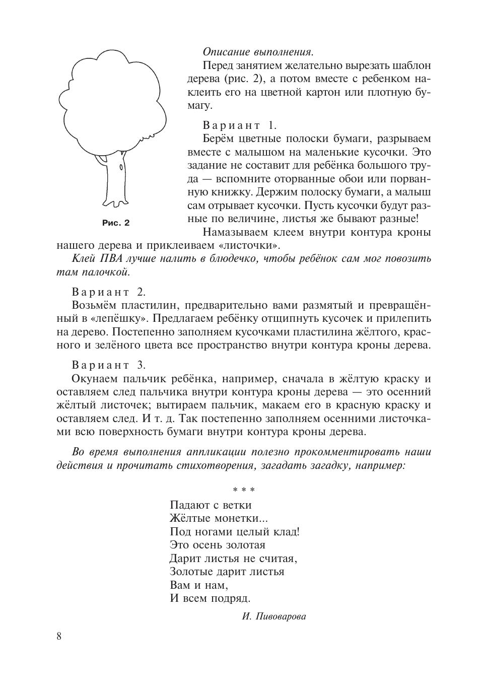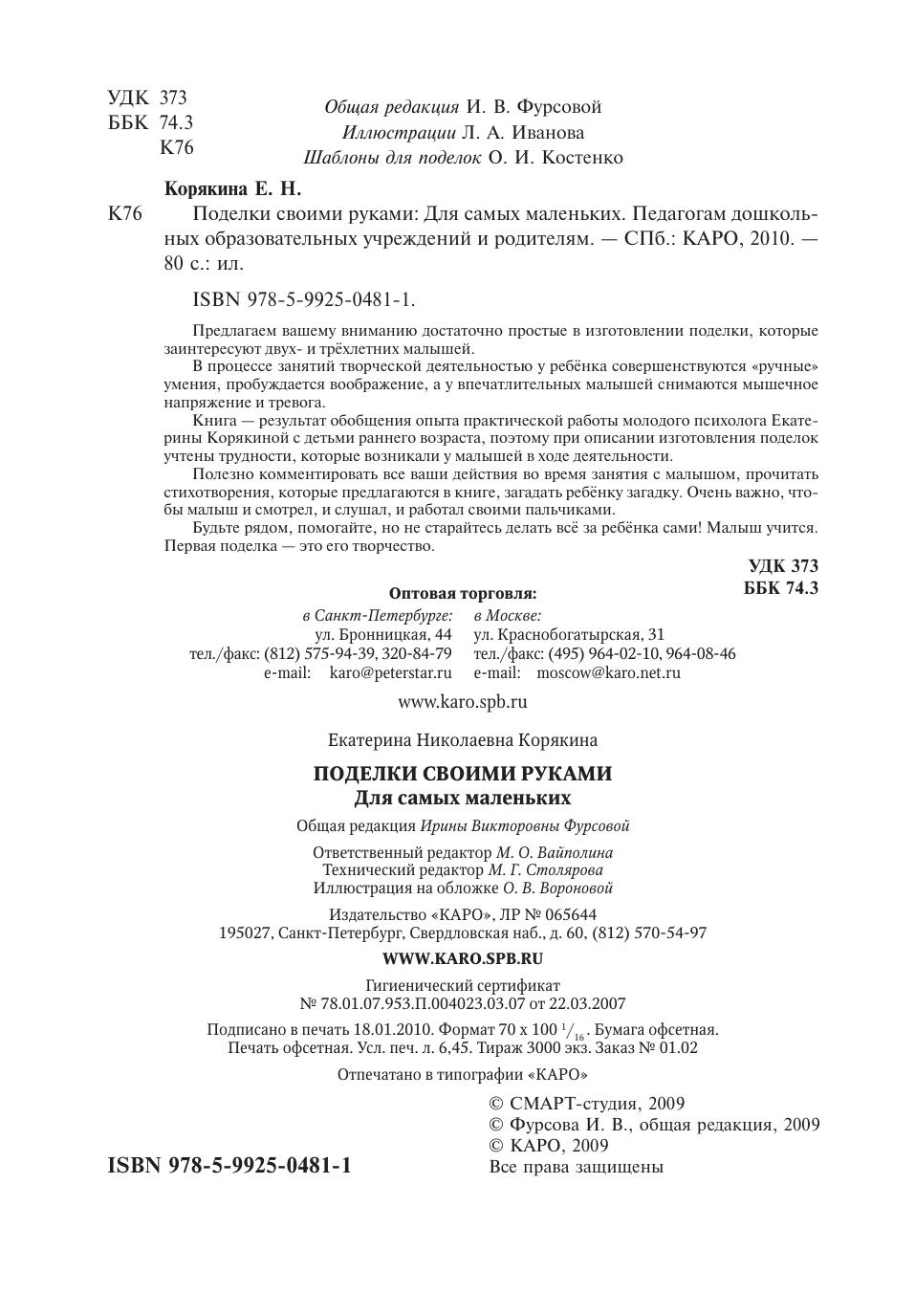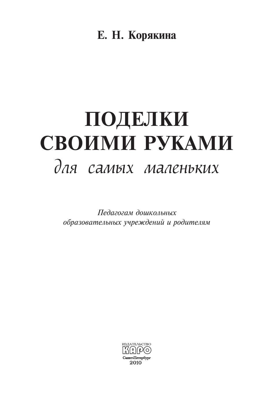 Предлагаем вашему вниманию достаточно простые в изготовлении поделки, которые заинтересуют двух- и трёхлетних малышей. В процессе занятий творческой деятельностью у ребёнка совершенствуются «ручные» умения, пробуждается воображение, а у впечатлительных малышей снимаются мышечное напряжение и тревога. Книга — результат обобщения опыта практической работы молодого психолога Екатерины Корякиной с детьми раннего возраста, поэтому при описании изготовления поделок учтены трудности, которые возникали у малышей в ходе деятельности. Полезно комментировать все ваши действия во время занятия с малышом, прочитать стихотворения, которые предлагаются в книге, загадать ребёнку загадку. Очень важно, чтобы малыш и смотрел, и слушал, и работал своими пальчиками. Будьте рядом, помогайте, но не старайтесь делать всё за ребёнка сами! Mалыш учится. Первая поделка — это его творчество.