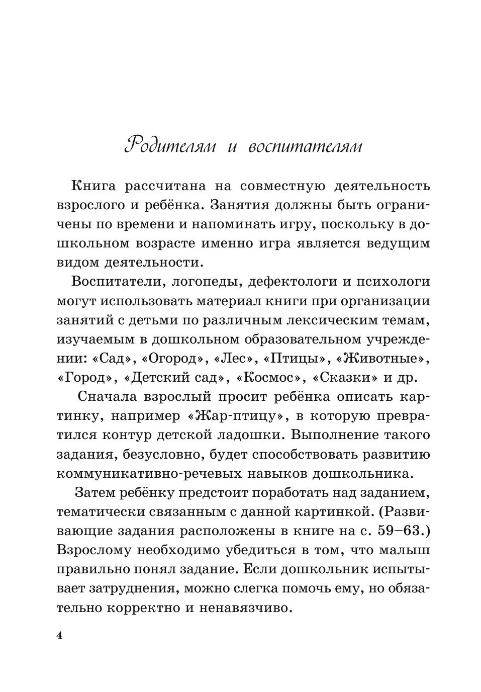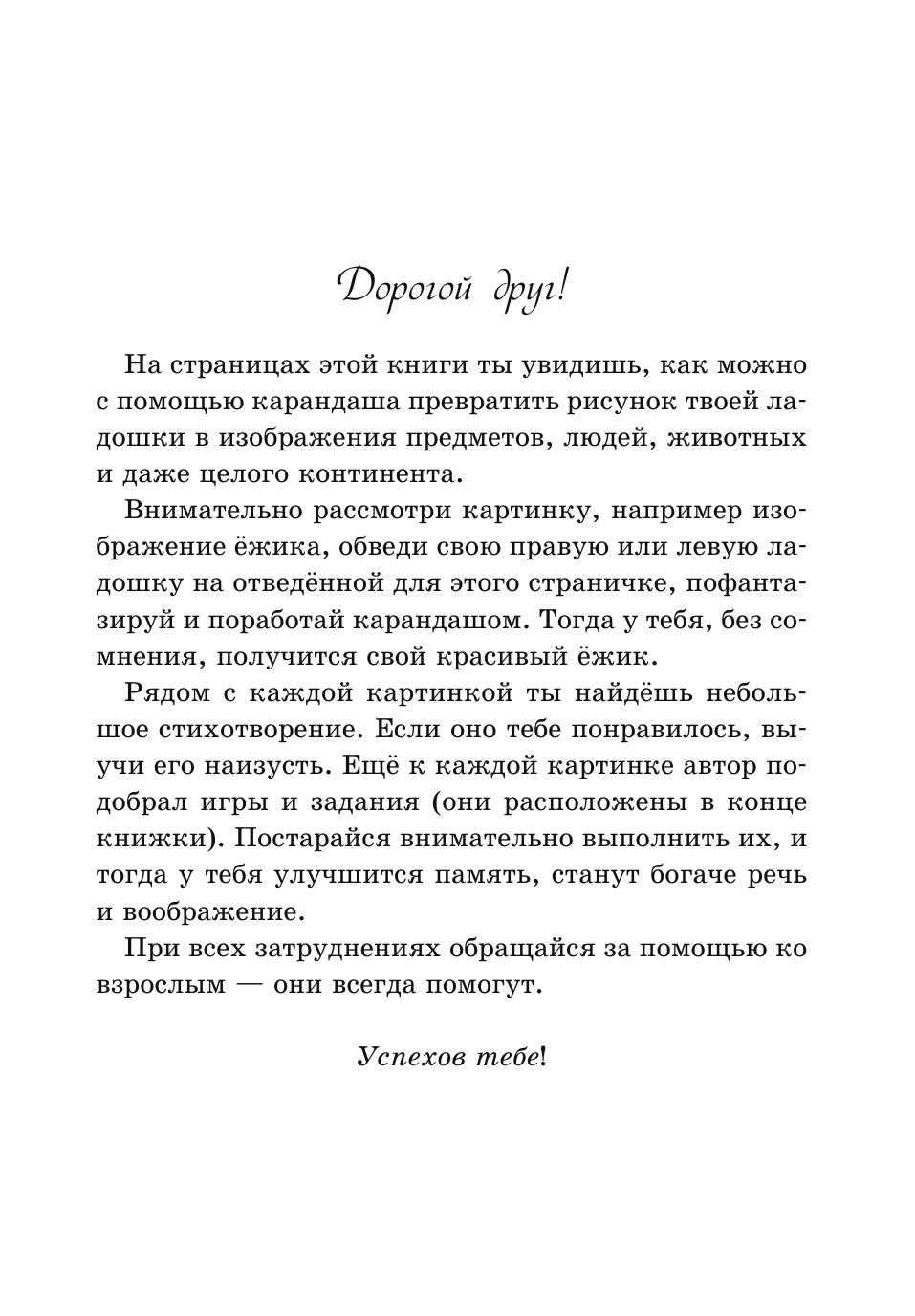 Книга рассчитана на совместную деятельность взрослого и ребёнка. Малыш раскрашивает рисунок ладошки, превращённой в изображения предметов, людей, животных, сказочных героев и даже целого континента, а затем обводит ладошку, рисует по образцу или придумывает свою картинку по данной теме. К каждому рисунку автор сочинил стихотворение и подобрал дополнительные задания (они помещены в конце книги). В процессе игры, рассказа по картинке и рисования, при заучивании стихов и выполнении заданий у ребёнка развиваются память и мышление коммуникативно-речевые и изобразительные навыки. Воспитатели, логопеды, дефектологи и психологи смогут использовать материал книги при организации занятий с детьми по лексическим темам, изучаемым в дошкольном образовательном учреждении.