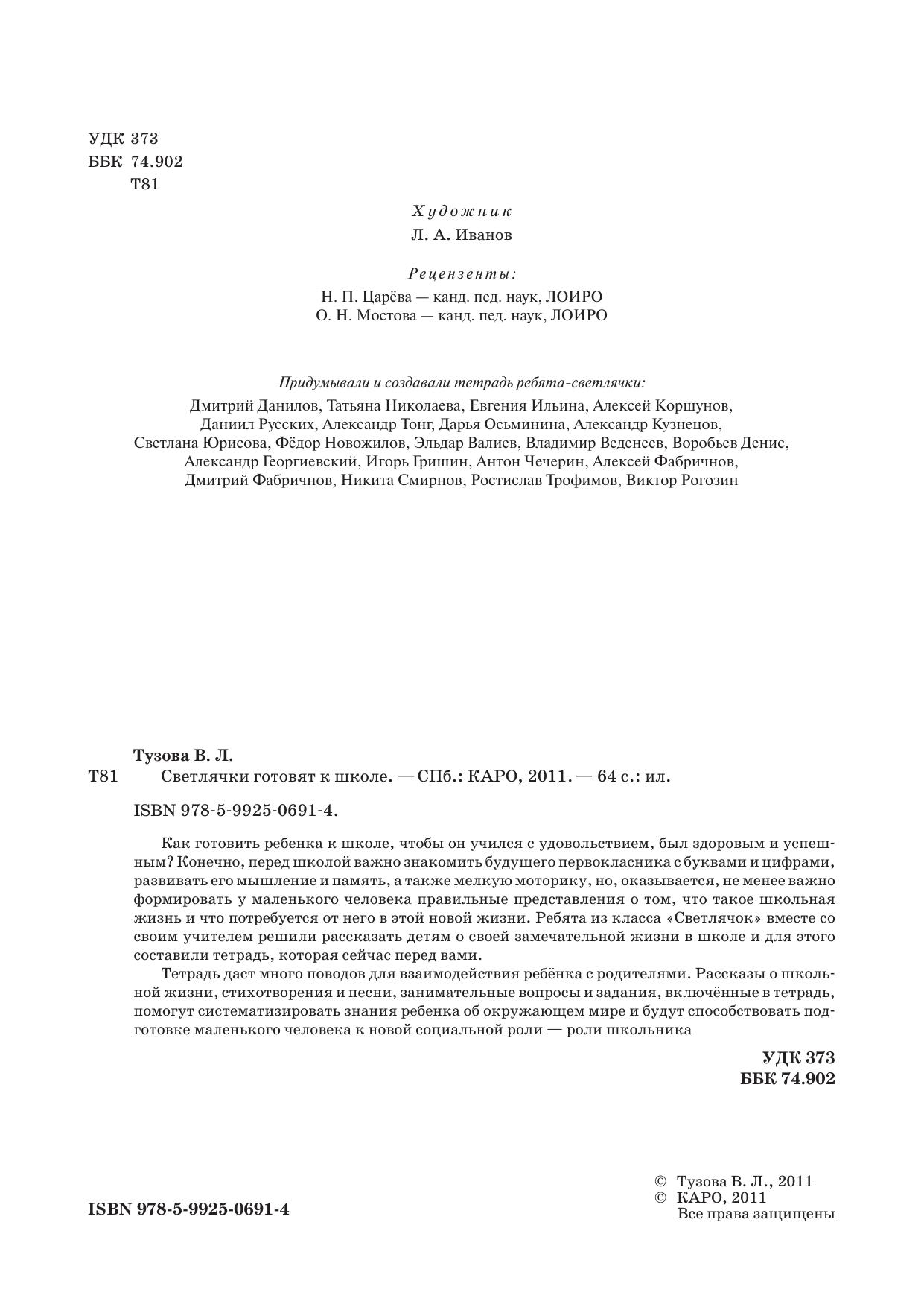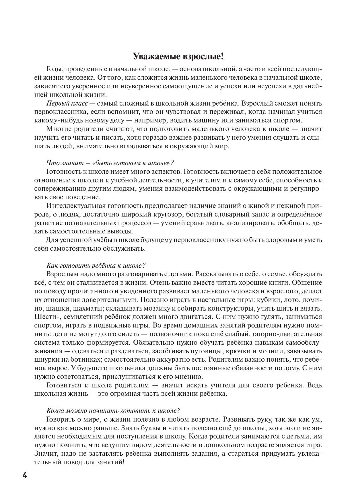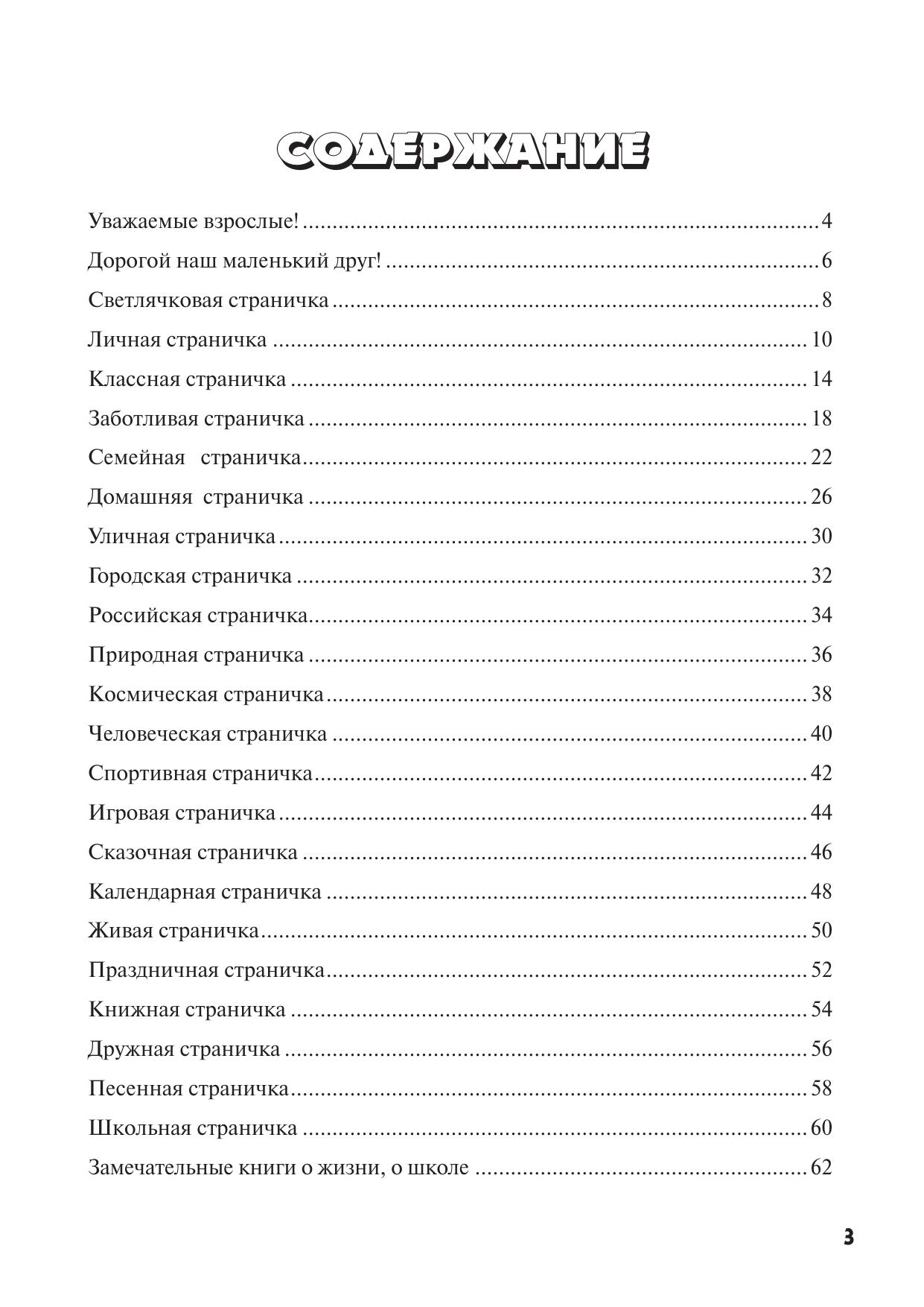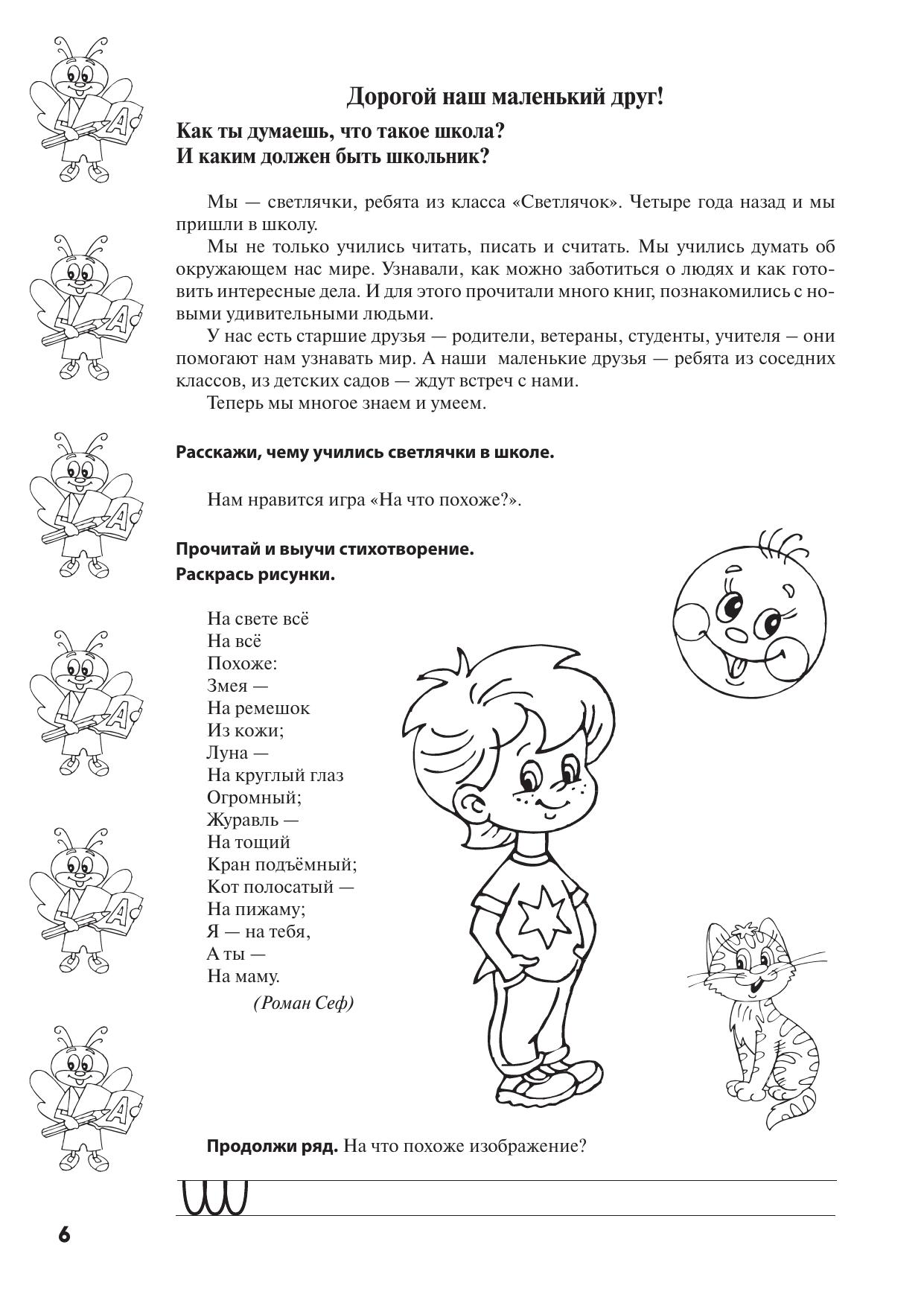 Как готовить ребенка к школе, чтобы он учился с удовольствием, был здоровым и успешным? Конечно, перед школой важно знакомить будущего первокласника с буквами и цифрами, развивать его мышление и память, а также мелкую моторику, но, оказывается, не менее важно формировать у маленького человека правильные представления о том, что такое школьная жизнь и что потребуется от него в этой новой жизни. Ребята из класса «Светлячок» вместе со своим учителем решили рассказать детям о своей замечательной жизни в школе и для этого составили тетрадь, которая сейчас перед вами. Тетрадь даст много поводов для взаимодействия ребёнка с родителями. Рассказы о школьной жизни, стихотворения и песни, занимательные вопросы и задания, включённые в тетрадь, помогут систематизировать знания ребенка об окружающем мире и будут способствовать подготовке маленького человека к новой социальной роли — роли школьника.