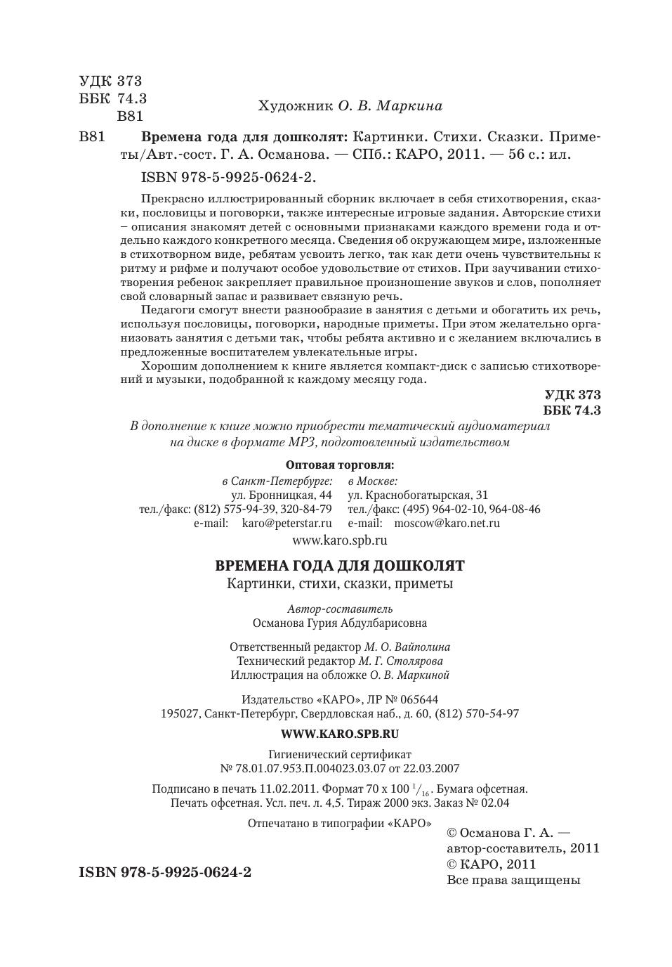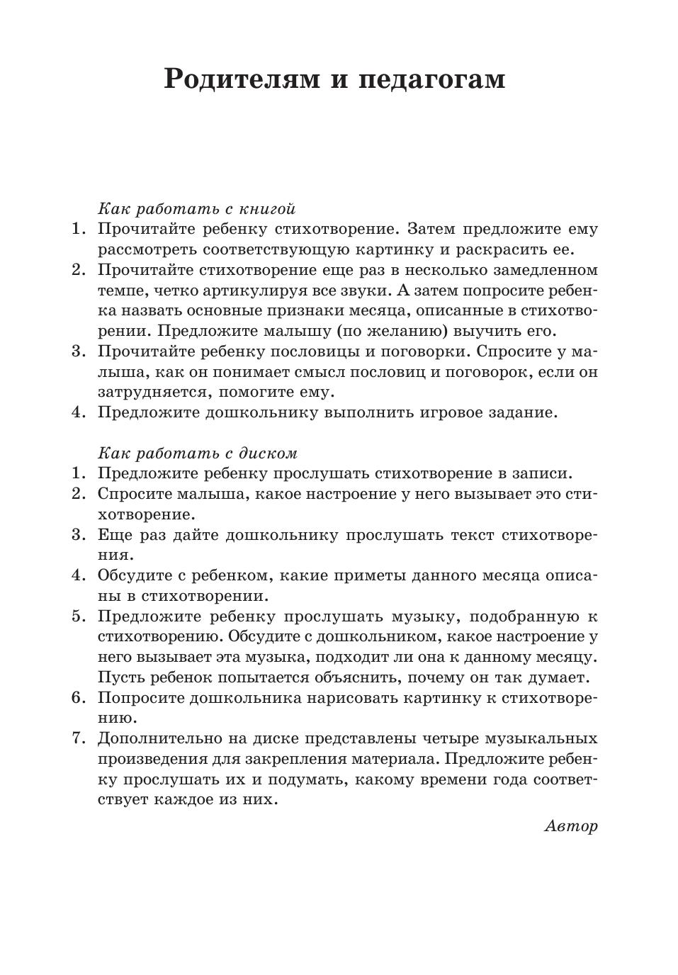 Прекрасно иллюстрированный сборник включает в себя стихотворения, сказки, пословицы и поговорки, также интересные игровые задания. Авторские стихи — описания знакомят детей с основными признаками каждого времени года и отдельно каждого конкретного месяца. Сведения об окружающем мире, изложенные в стихотворном виде, ребятам усвоить легко, так как дети очень чувствительны к ритму и рифме и получают особое удовольствие от стихов. При заучивании стихотворения ребенок закрепляет правильное произношение звуков и слов, пополняет свой словарный запас и развивает связную речь. Педагоги смогут внести разнообразие в занятия с детьми и обогатить их речь, используя пословицы, поговорки, народные приметы. При этом желательно организовать занятия с детьми так, чтобы ребята активно и с желанием включались в предложенные воспитателем увлекательные игры. Хорошим дополнением к книге является компакт-диск с записью стихотворений и музыки, подобранной к каждому месяцу года.