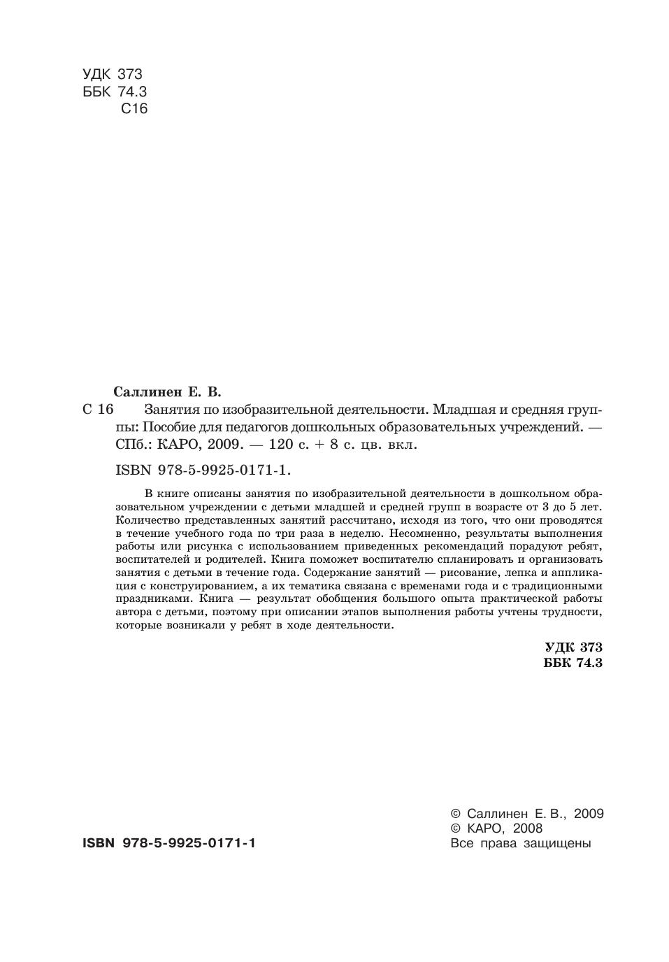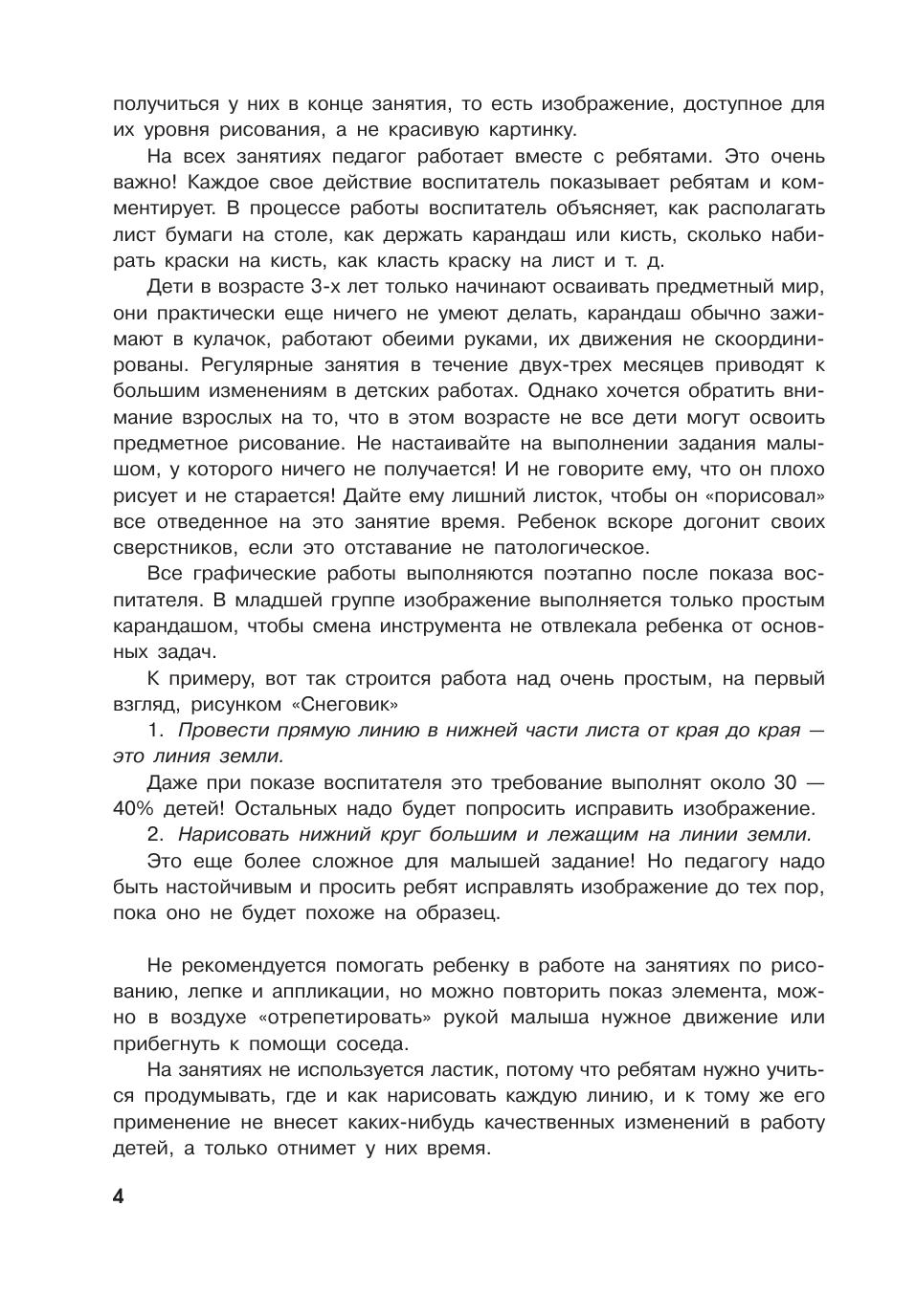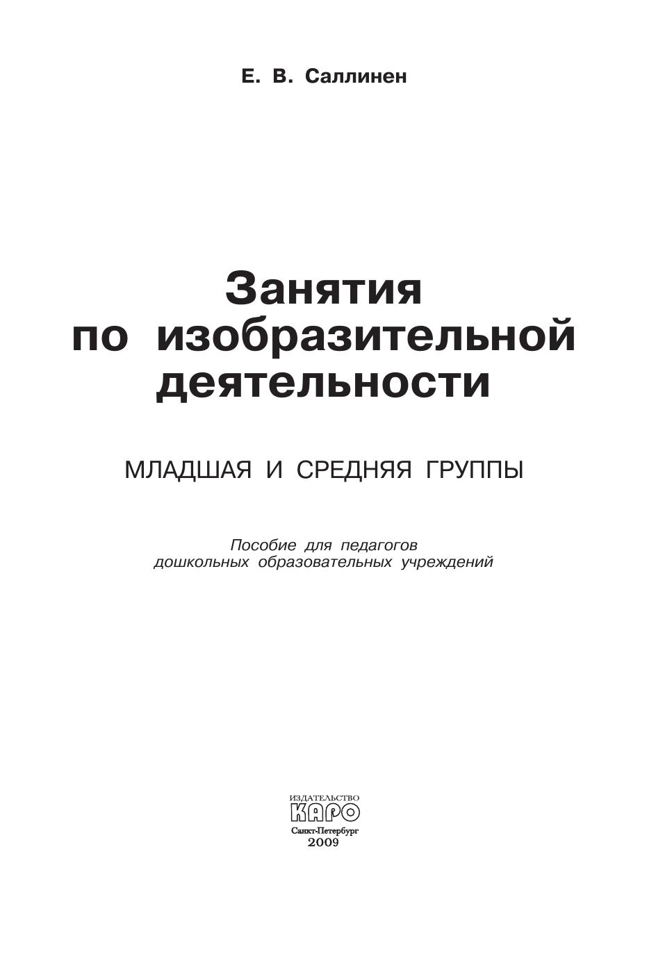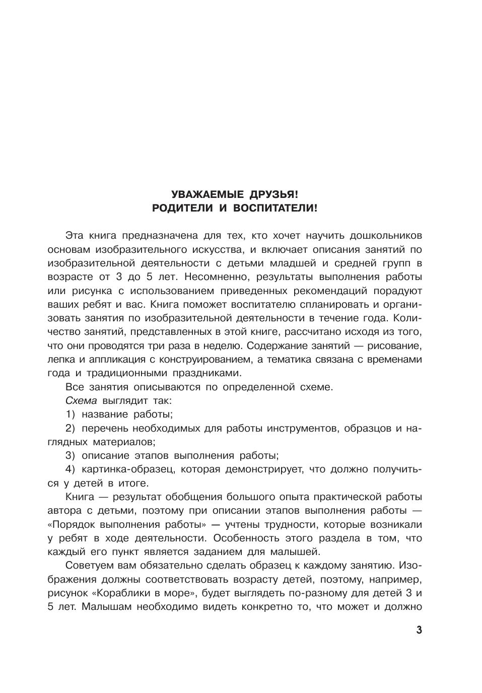 В книге описаны занятия по изобразительной деятельности в дошкольном образовательном учреждении с детьми младшей и средней групп в возрасте от 3 до 5 лет. Количество представленных занятий рассчитано, исходя из того, что они проводятся в течение учебного года по три раза в неделю. Несомненно, результаты выполнения работы или рисунка с использованием приведенных рекомендаций порадуют ребят, воспитателей и родителей. Книга поможет воспитателю спланировать и организовать занятия с детьми в течение года. Содержание занятий — рисование, лепка и аппликация с конструированием, а их тематика связана с временами года и с традиционными праздниками. Книга — результат обобщения большого опыта практической работы автора с детьми, поэтому при описании этапов выполнения работы учтены трудности, которые возникали у ребят в ходе деятельности.