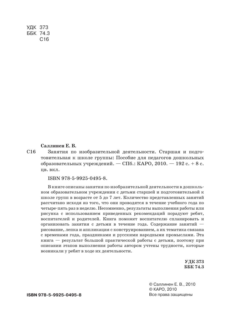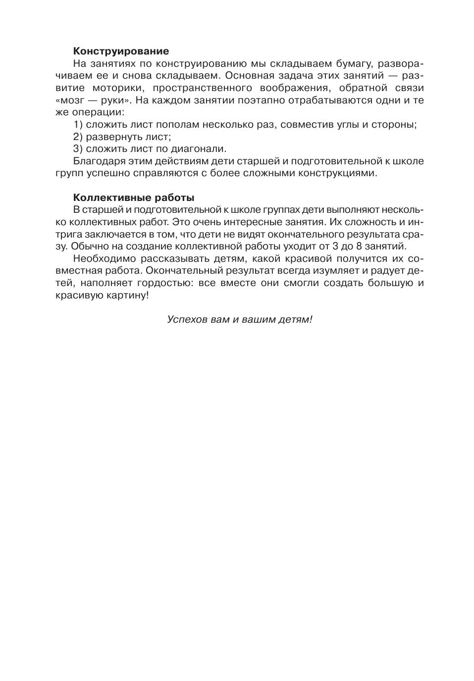 В книге описаны занятия по изобразительной деятельности в дошкольном образовательном учреждении с детьми старшей и подготовительной к школе групп в возрасте от 5 до 7 лет. Количество представленных занятий рассчитано исходя из того, что они проводятся в течение учебного года по четыре-пять раз в неделю. Несомненно, результаты выполнения работы или рисунка с использованием приведенных рекомендаций порадуют ребят, воспитателей и родителей. Книга поможет воспитателю спланировать и организовать занятия с детьми в течение года. Содержание занятий — рисование, лепка и аппликация с конструированием, а их тематика связана с временами года, праздниками и русскими народными промыслами. Эта книга — результат большой практической работы с детьми, поэтому при описании этапов выполнения работы автором учтены трудности, которые возникали у ребят в ходе их деятельности.