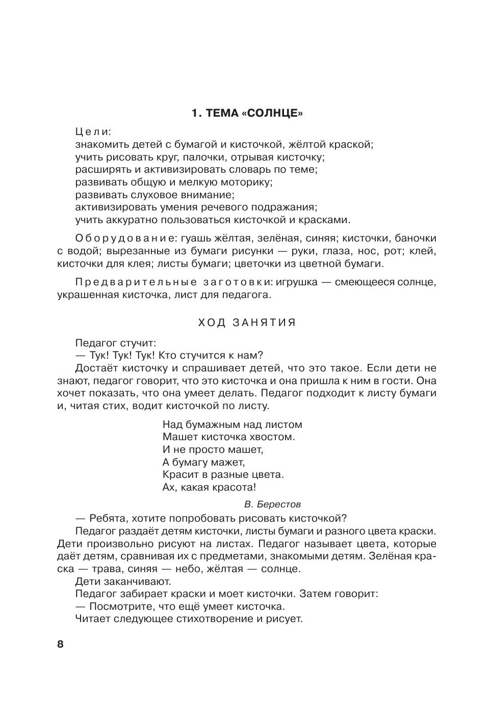 Главной задачей педагога на занятии является не только обучение умению рисовать (лепить, делать аппликацию), но и развитие речи и общения, поэтому автор включает в описание занятий тексты стихотворений, песенок и потешек, которые спо-
