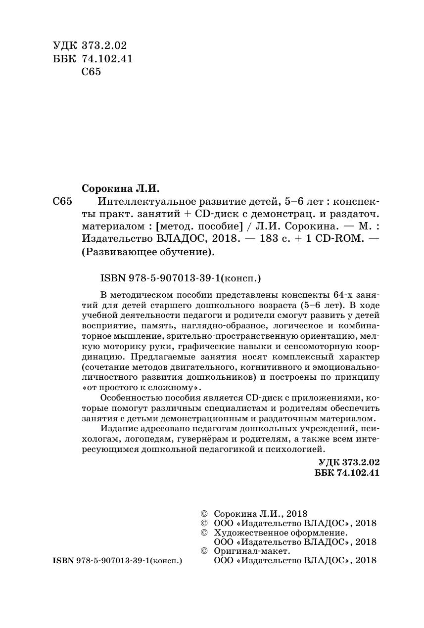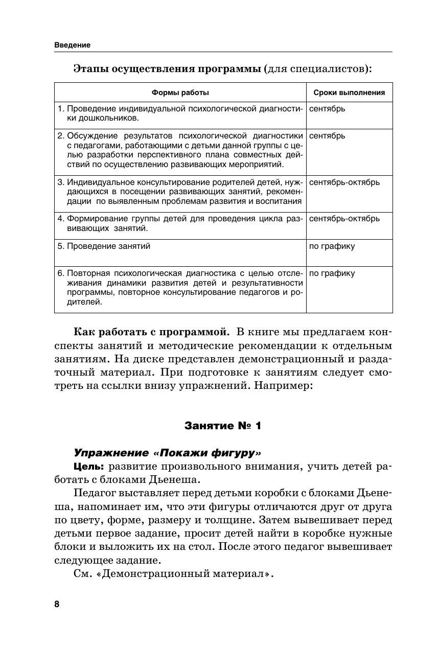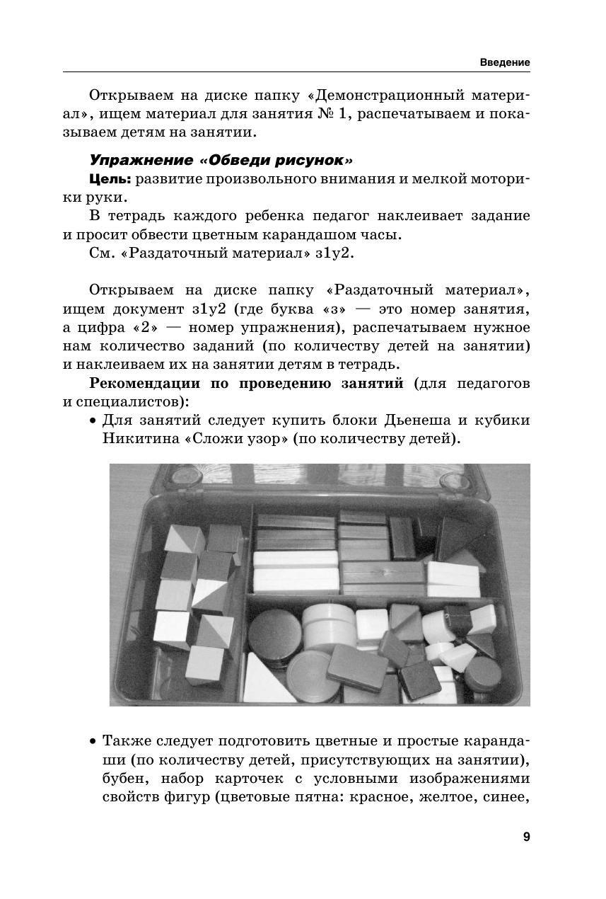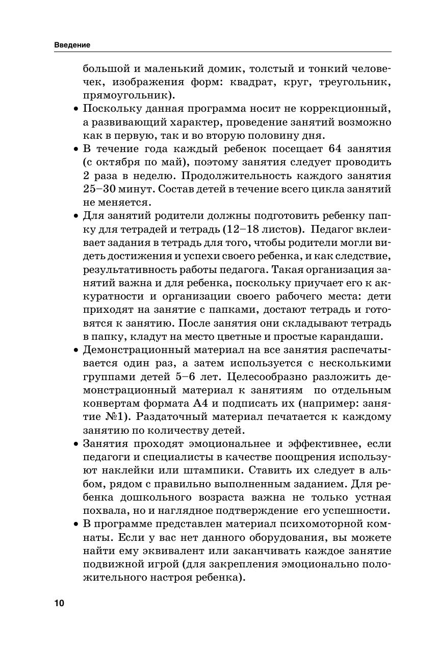 В методическом пособии представлены конспекты 64-х занятий для детей старшего дошкольного возраста (5–6 лет). В ходе учебной деятельности педагоги и родители смогут развить у детей восприятие, память, наглядно-образное, логическое и комбинаторное мышление, зрительно-пространственную ориентацию, мелкую моторику руки, графические навыки и сенсомоторную координацию. Предлагаемые занятия носят комплексный характер (сочетание методов двигательного, когнитивного и эмоциональноличностного развития дошкольников) и построены по принципу «от простого к сложному». Особенностью пособия является CD-диск с приложениями, которые помогут различным специалистам и родителям обеспечить занятия с детьми демонстрационным и раздаточным материалом. Издание адресовано педагогам дошкольных учреждений, психологам, логопедам, гувернёрам и родителям, а также всем интересующимся дошкольной педагогикой и психологией.
