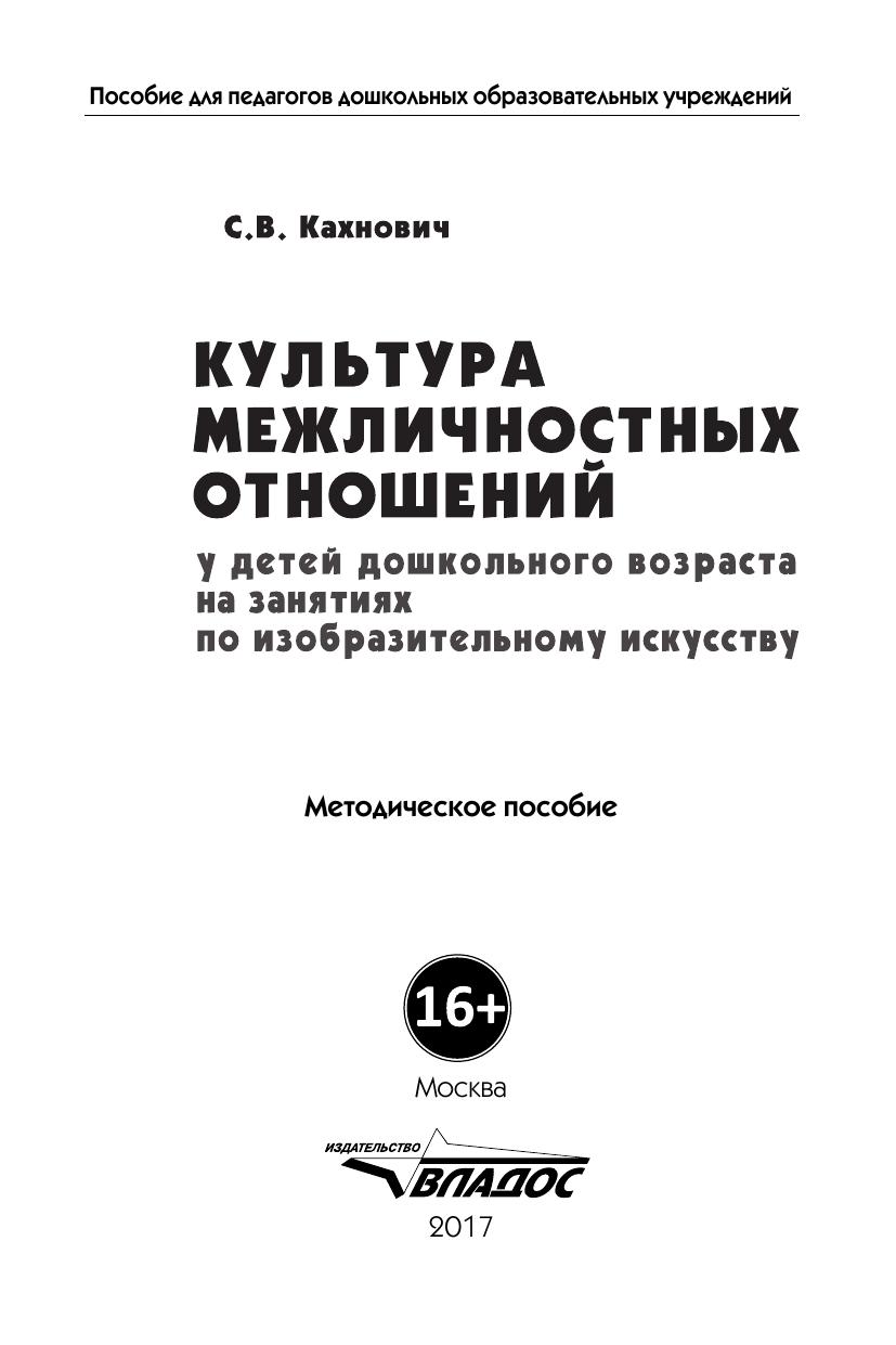 В пособии рассматривается методика актуализации нравственного потенциала личности средствами изобразительного искусства в период дошкольного детства, а также психолого-педагогические условия общего социокультурного и нравственного развития детей раннего и дошкольного возраста. Представлены конспекты занятий по изобразительному искусству, направленные на формирование культуры межличностных отношений у детей дошкольного возраста.