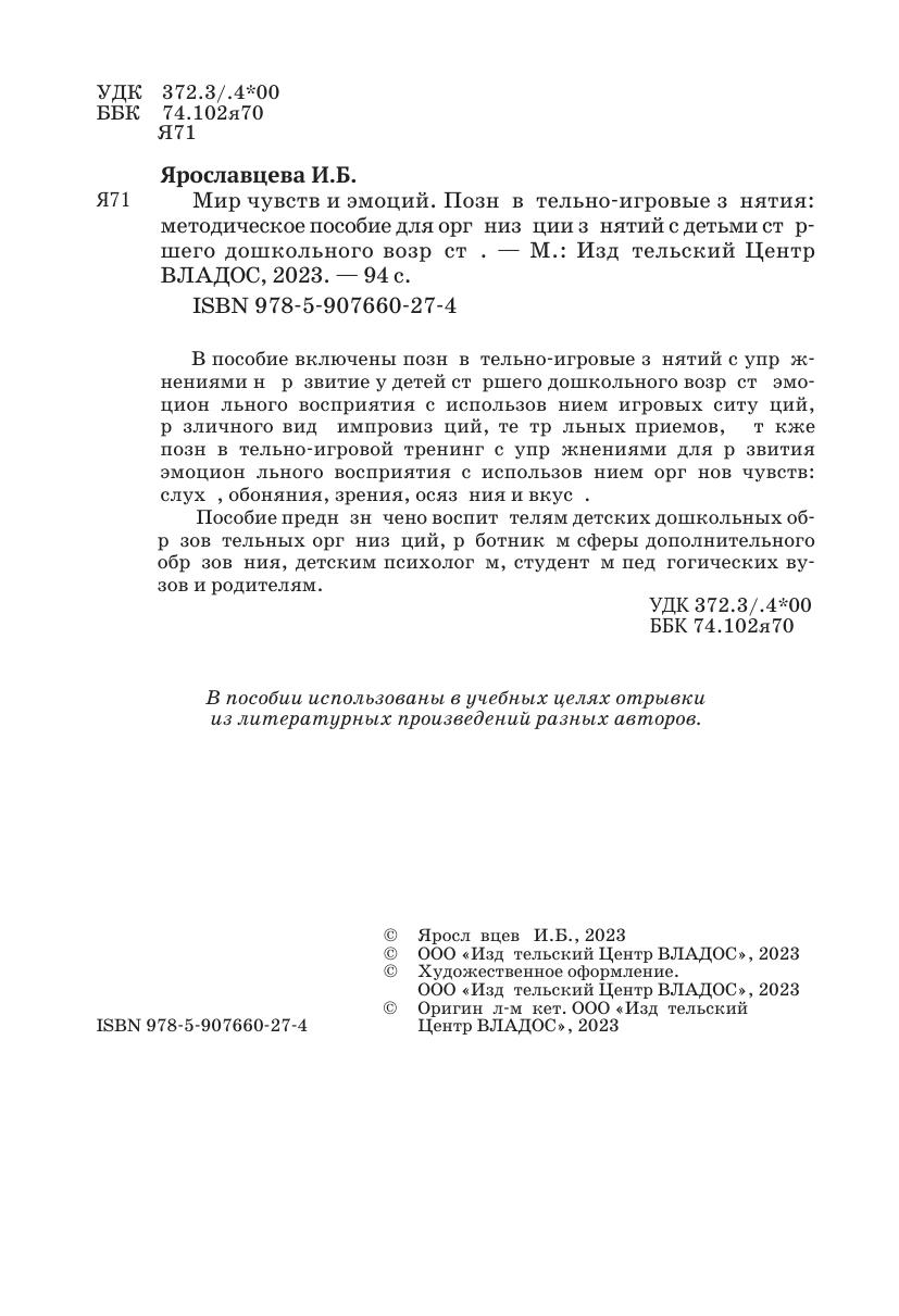 В пособие включены познавательно -игровые занятия с упражнениями на развитие у детей старшего дошкольного возраста эмоционального восприятия с использованием игровых ситуаций, различного вида импровизаций, театральных приемов, а также познавательно -игровой тренинг с упражнениями для развития эмоционального восприятия с использованием органов чувств: слуха, обоняния, зрения, осязания и вкуса. Пособие предназначено воспитателям детских дошкольных образовательных организаций, работникам сферы дополнительного образования, детским психологам, студентам педагогических вузов и родителям.