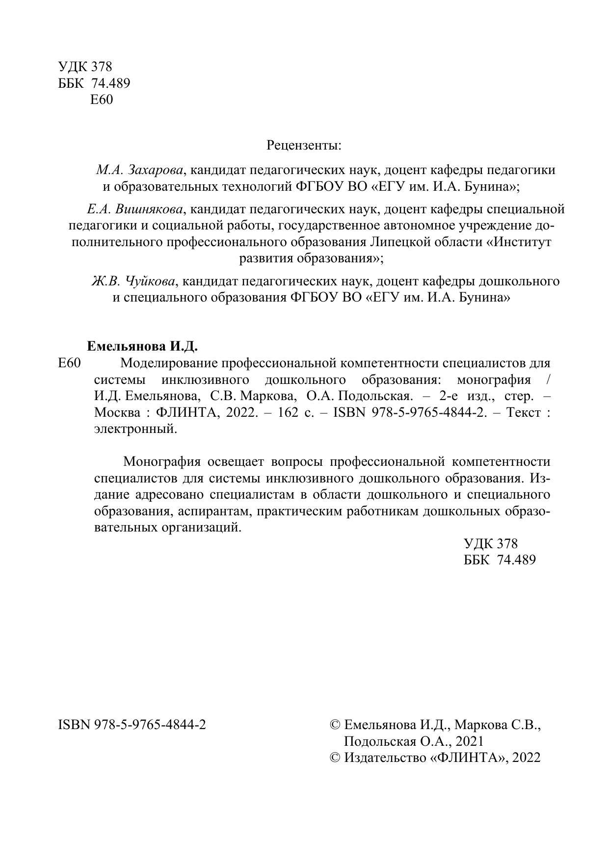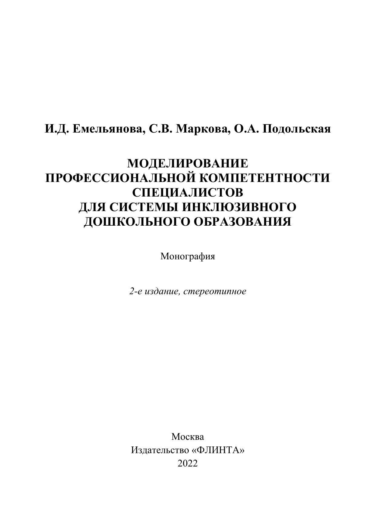 Монография освещает вопросы профессиональной компетентности специалистов для системы инклюзивного дошкольного образования. Издание адресовано специалистам в области дошкольного и специального образования, аспирантам, практическим работникам дошкольных образовательных организаций.
