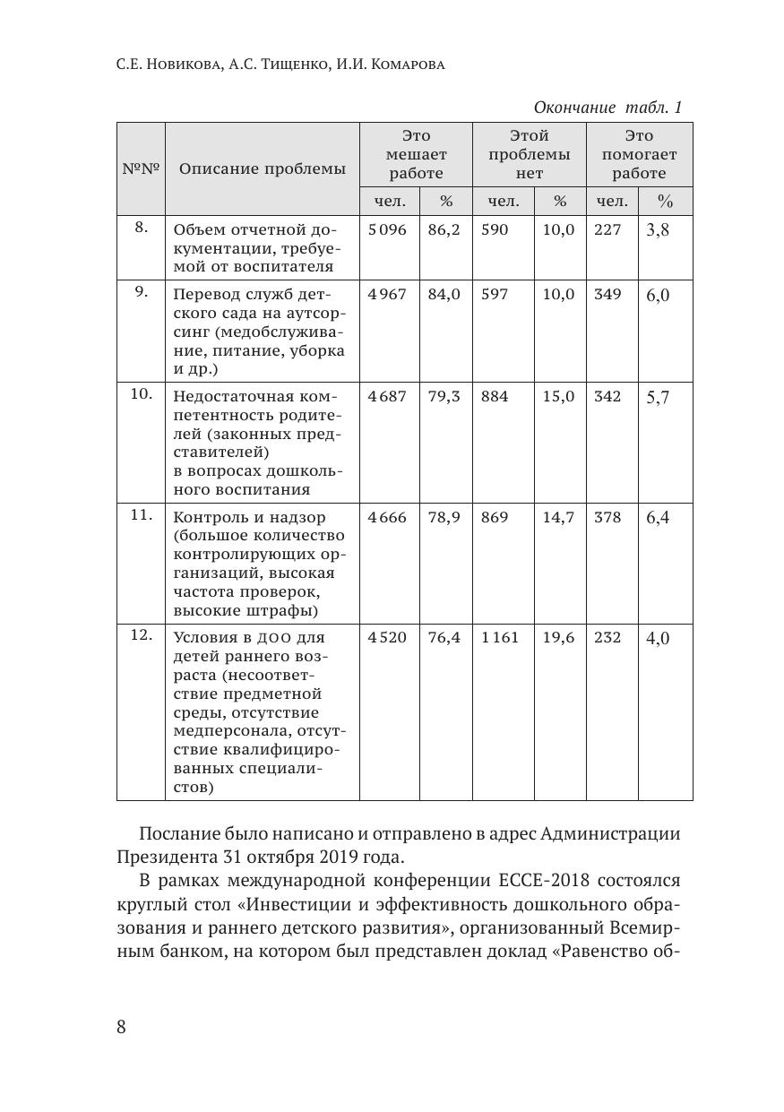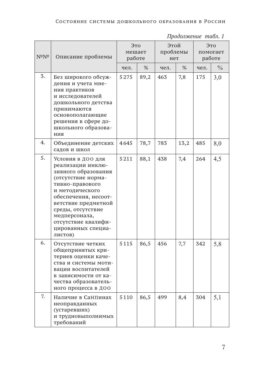 В ходе исследования были собраны данные относительно широкого круга проблем и аспектов функционирования ДОО: переполненность групп, недостаточная профессиональная подготовка для надлежащей работы в ДОО, несоответствие предметно-развивающей среды потребностям для реализации образовательных программ и необходимость в дополнительных расходах на ее обеспечение, отсутствие условий для детей раннего возраста, для реализации инклюзивного образования, наличие существенной нагрузки по формированию отчетности о деятельности дошкольной образовательной организации и др.