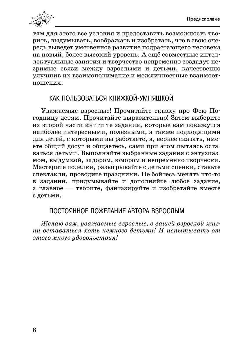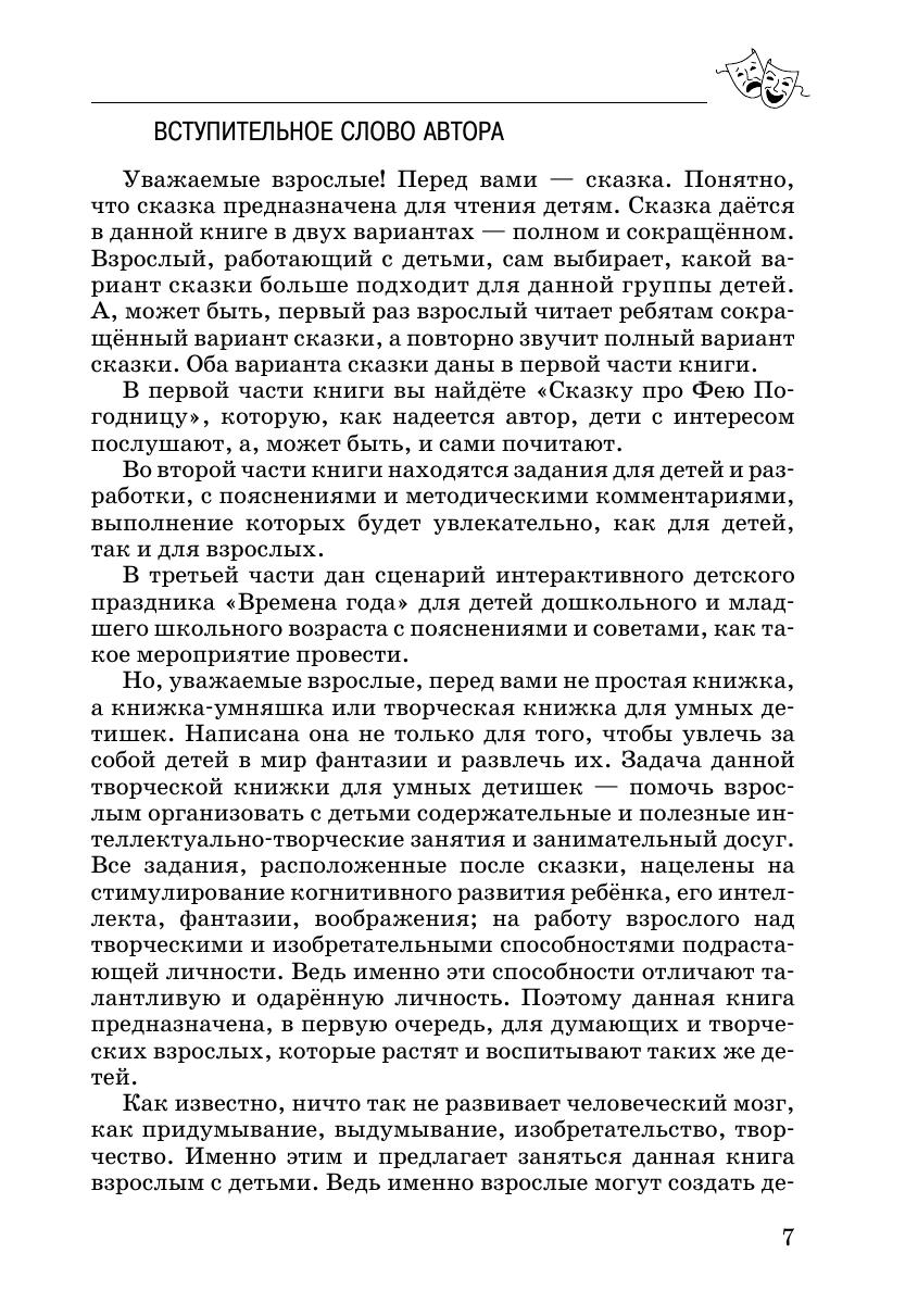 В пособие включены сказка про Фею Погодницу, а также различные задания детям дошкольного и младшего школьного возраста к этой сказке и творческие проекты, которые можно осуществлять совместно с детьми. Задания разделены на три части: 1) задания на развитие речи, 2) задания на придумывание и развитие воображения, 3) задания по рисованию сказочных образов. В творческие проекты включены занятия по организации поделок сказочных персонажей, которые дети должны смастерить своими руками, используя различные материалы. В заключительной части пособия дан сценарий интерактивного праздника «Времена года». Пособие адресовано воспитателям детских дошкольных образовательных организаций, педагогам дополнительного образования детей.
