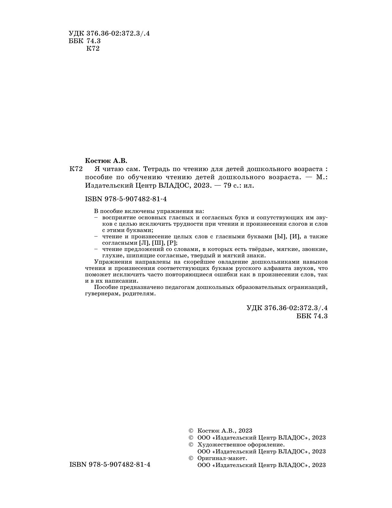 В пособие включены упражнения на: – восприятие основных гласных и согласных букв и сопутствующих им звуков с целью исключить трудности при чтении и произнесении слогов и слов с этими буквами; – чтение и произнесение целых слов с гласными буквами [Ы], [И], а также согласными [Л], [Ш], [Р]; – чтение предложений со словами, в которых есть твёрдые, мягкие, звонкие, глухие, шипящие согласные, твердый и мягкий знаки. Упражнения направлены на скорейшее овладение дошкольниками навыков чтения и произнесения соответствующих буквам русского алфавита звуков, что поможет исключить часто повторяющиеся ошибки как в произнесении слов, так и в их написании. Пособие предназначено педагогам дошкольных образовательных организаций, гувернерам, родителям.