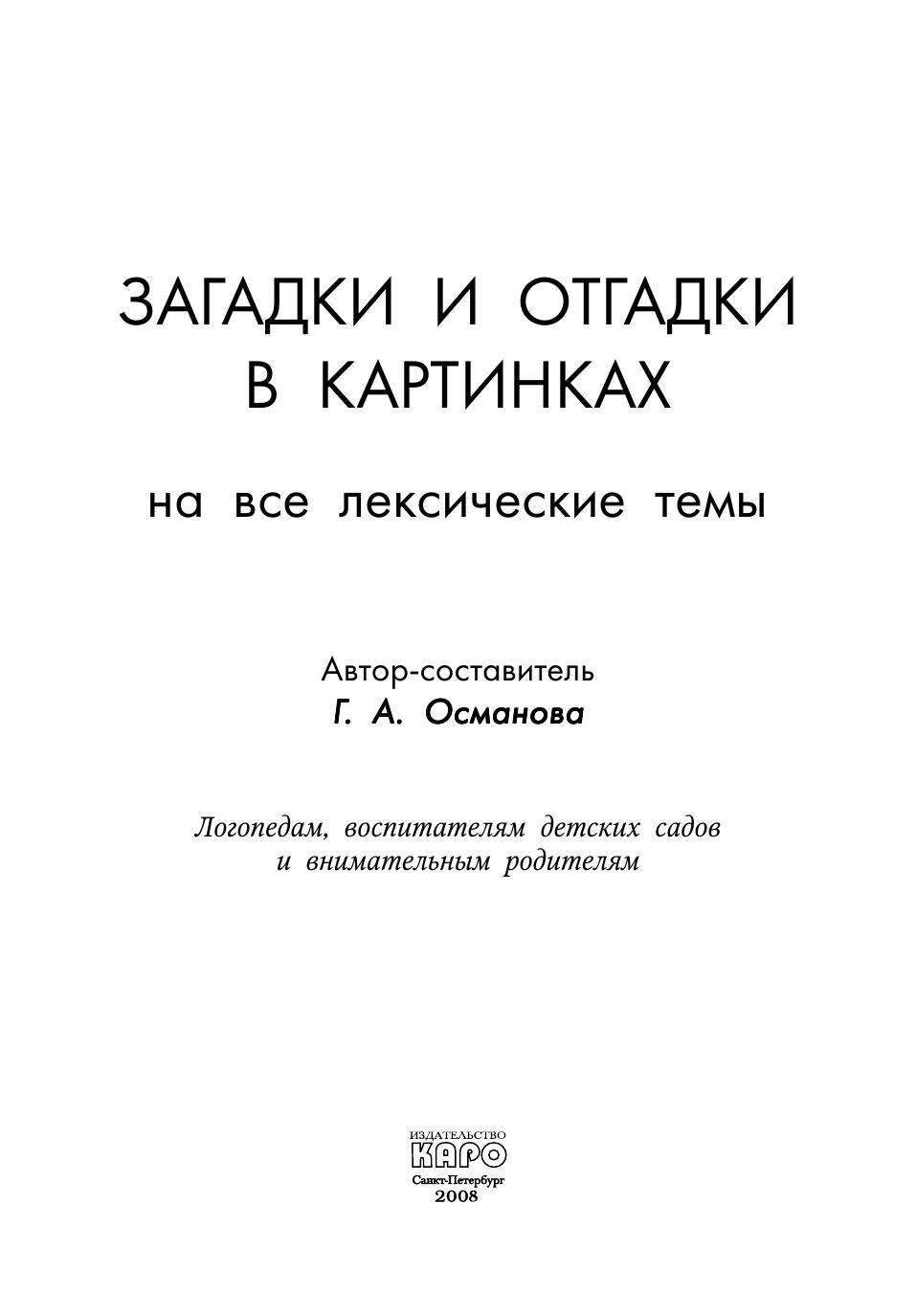 В книге собраны загадки по всем лексическим темам, изучаемым в детском саду. Педагоги, используя загадки в своей работе с дошкольниками, развивают у них неречевые психические функции, лежащие в основе грамотного письма, и таким образом способствуют подготовке детей к школе.