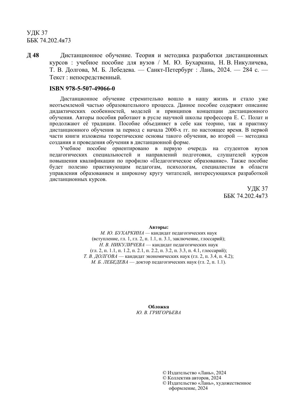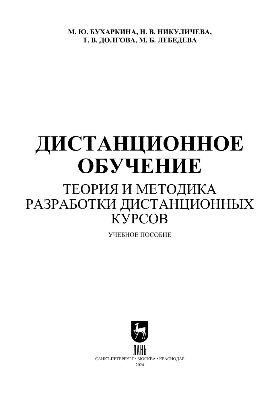 Дистанционное обучение стремительно вошло в нашу жизнь и стало уже неотъемлемой частью образовательного процесса. Данное пособие содержит описание дидактических особенностей, моделей и принципов концепции дистанционного обучения. Авторы пособия работают в русле научной школы профессора Е. С. Полат и продолжают её традиции. Пособие объединяет в себе как теорию, так и практику дистанционного обучения за период с начала 2000-х гг. по настоящее время. В первой части книги изложены теоретические основы такого обучения, во второй — методика создания и проведения обучения в дистанционной форме. Учебное пособие ориентировано в первую очередь на студентов вузов педагогических специальностей и направлений подготовки, слушателей курсов повышения квалификации по профилю «Педагогическое образование». Также пособие будет полезно практикующим педагогам, психологам, специалистам в области управления образованием и широкому кругу читателей, интересующихся разработкой дистанционных курсов.