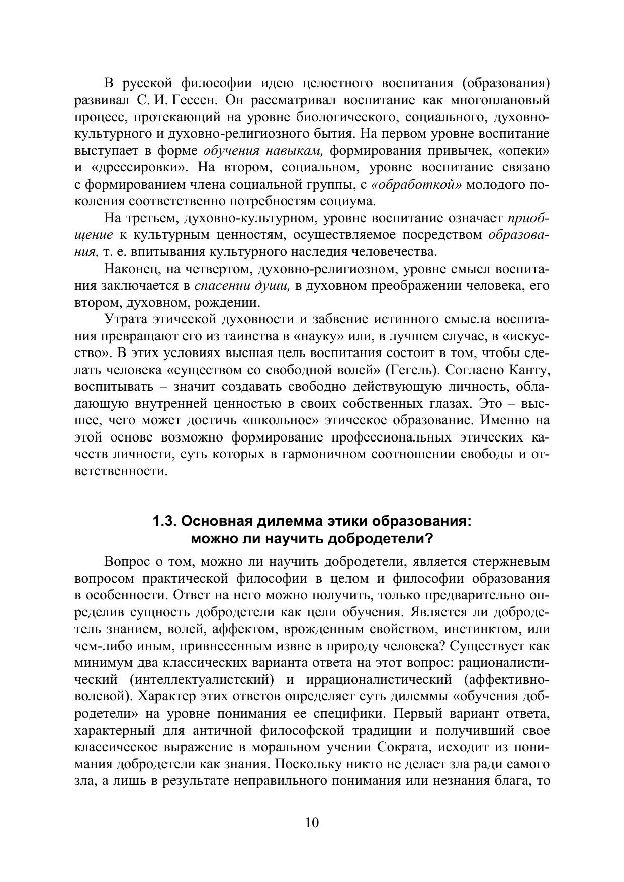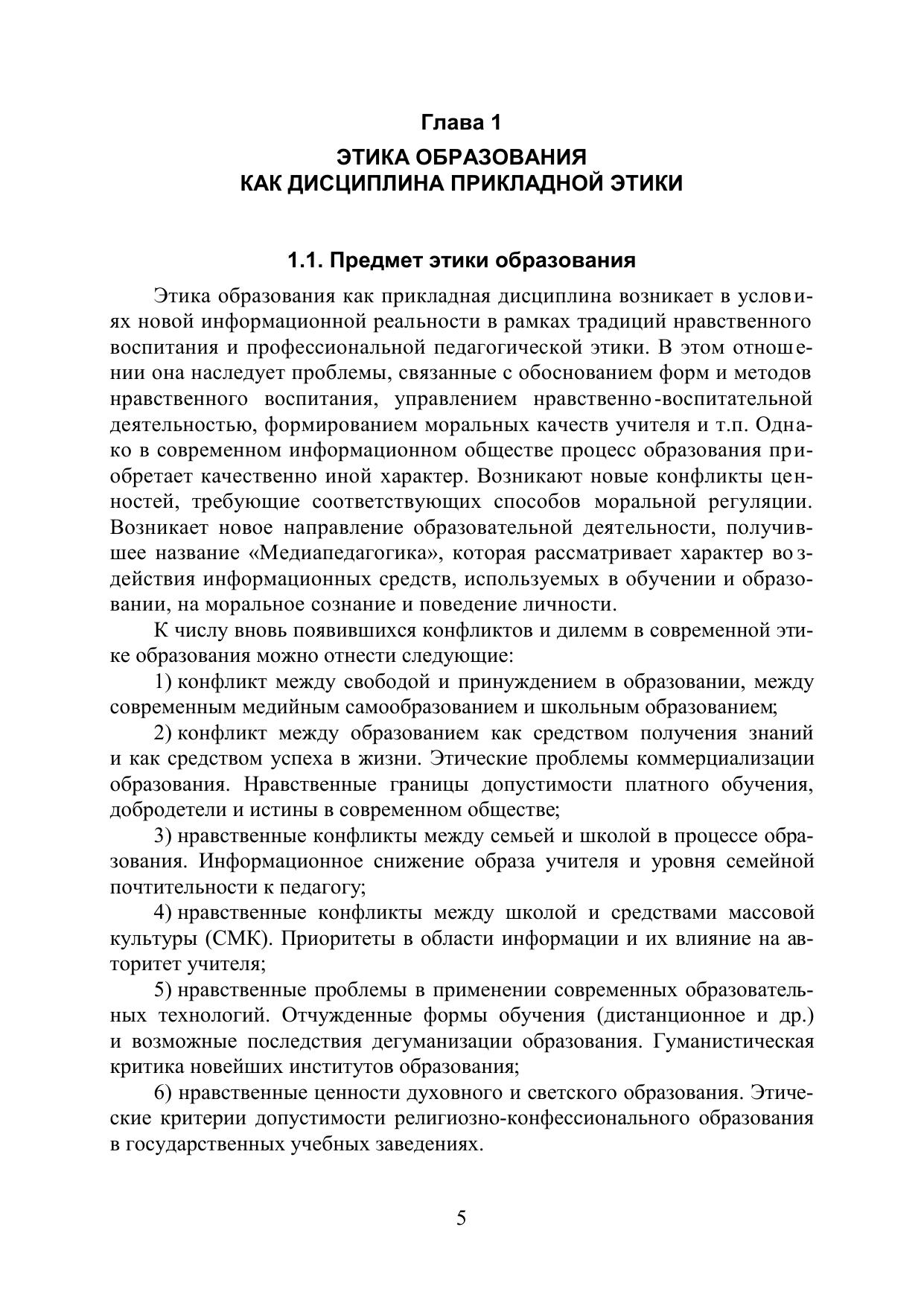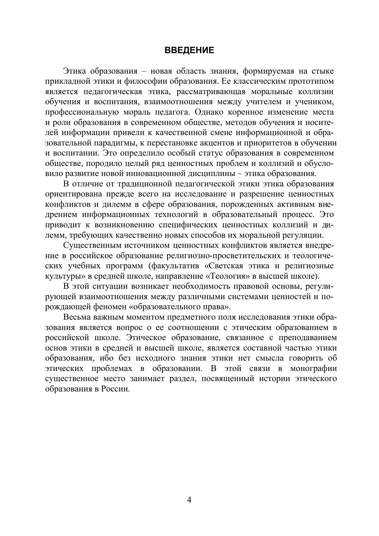 Монография посвящена обоснованию предмета «Этика образования», методам обучения в этой новой области знания, формирующейся в системе дисциплин прикладной этики. Рассматриваются конфликты ценностей в сфере образования, моральные принципы и дилеммы медиапедагогики. Особое внимание уделено основным проблемным областям исследования, определяющим соотношение этики и религии, этики и права в системе современного российского образования. Отдельный раздел монографии посвящен истории этического образования в России.