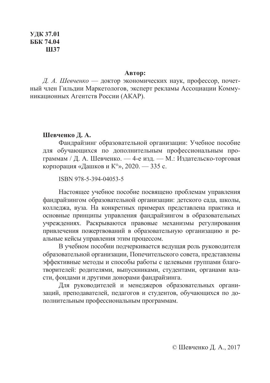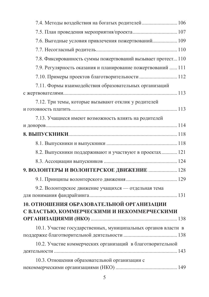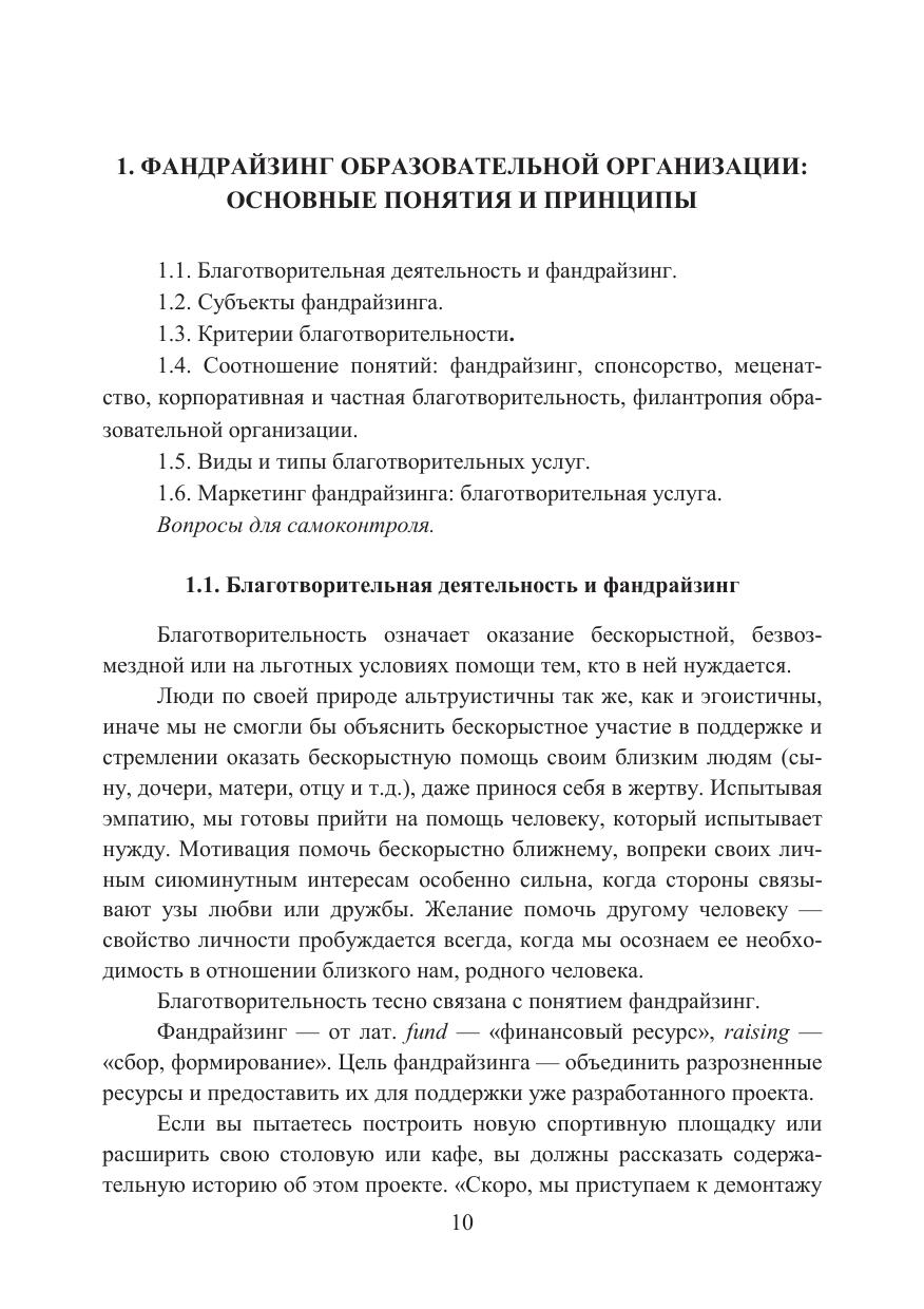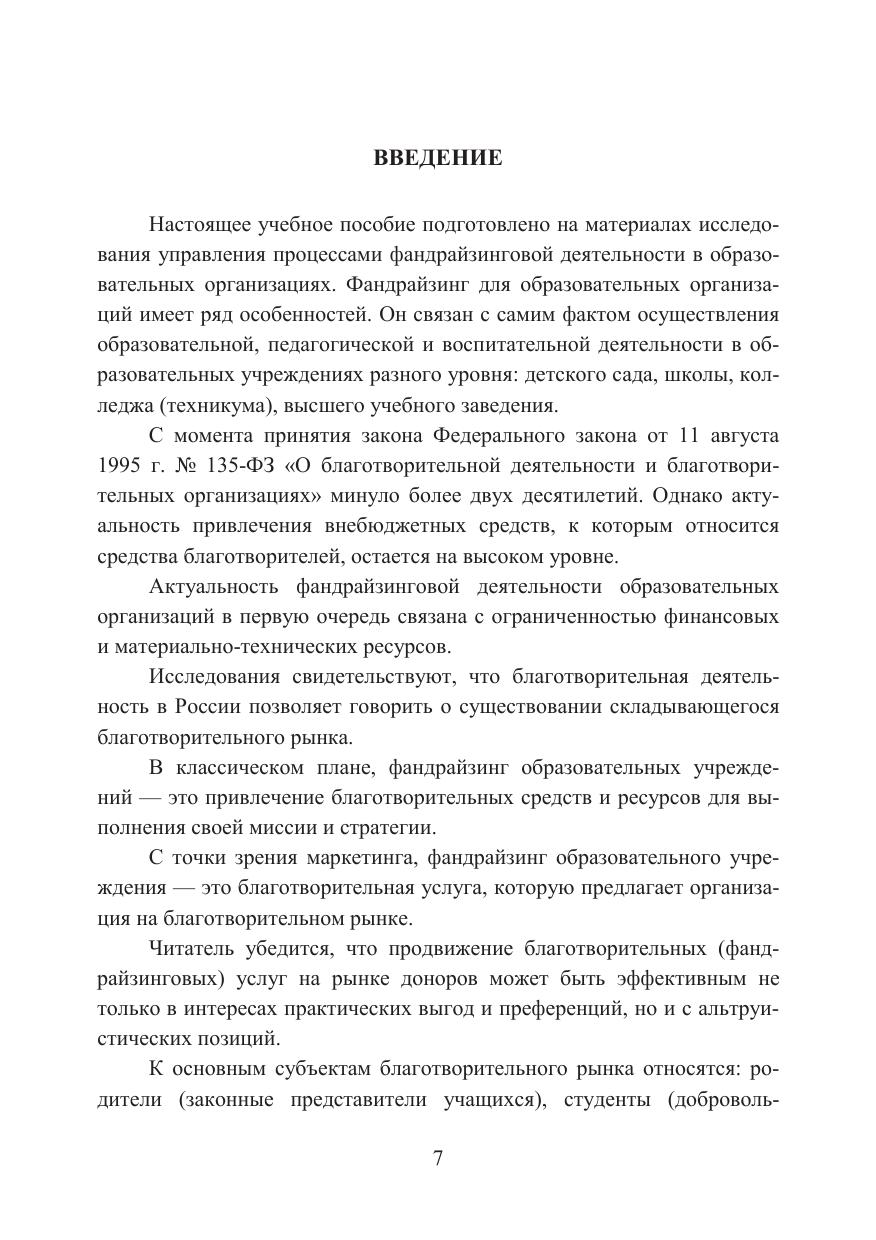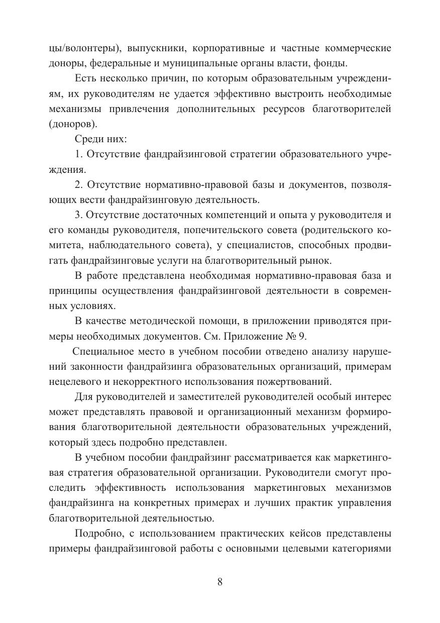 Настоящее учебное пособие посвящено проблемам управления фандрайзингом образовательной организации: детского сада, школы, колледжа, вуза. На конкретных примерах представлена практика и основные принципы управления фандрайзингом в образовательных учреждениях. Раскрываются правовые механизмы регулирования привлечения пожертвований в образовательную организацию и реальные кейсы управления этим процессом. В учебном пособии подчеркивается ведущая роль руководителя образовательной организации, Попечительского совета, представлены эффективные методы и способы работы с целевыми группами благотворителей: родителями, выпускниками, студентами, органами власти, фондами и другими донорами фандрайзинга. Для руководителей и менеджеров образовательных организаций, преподавателей, педагогов и студентов, обучающихся по дополнительным профессиональным программам.