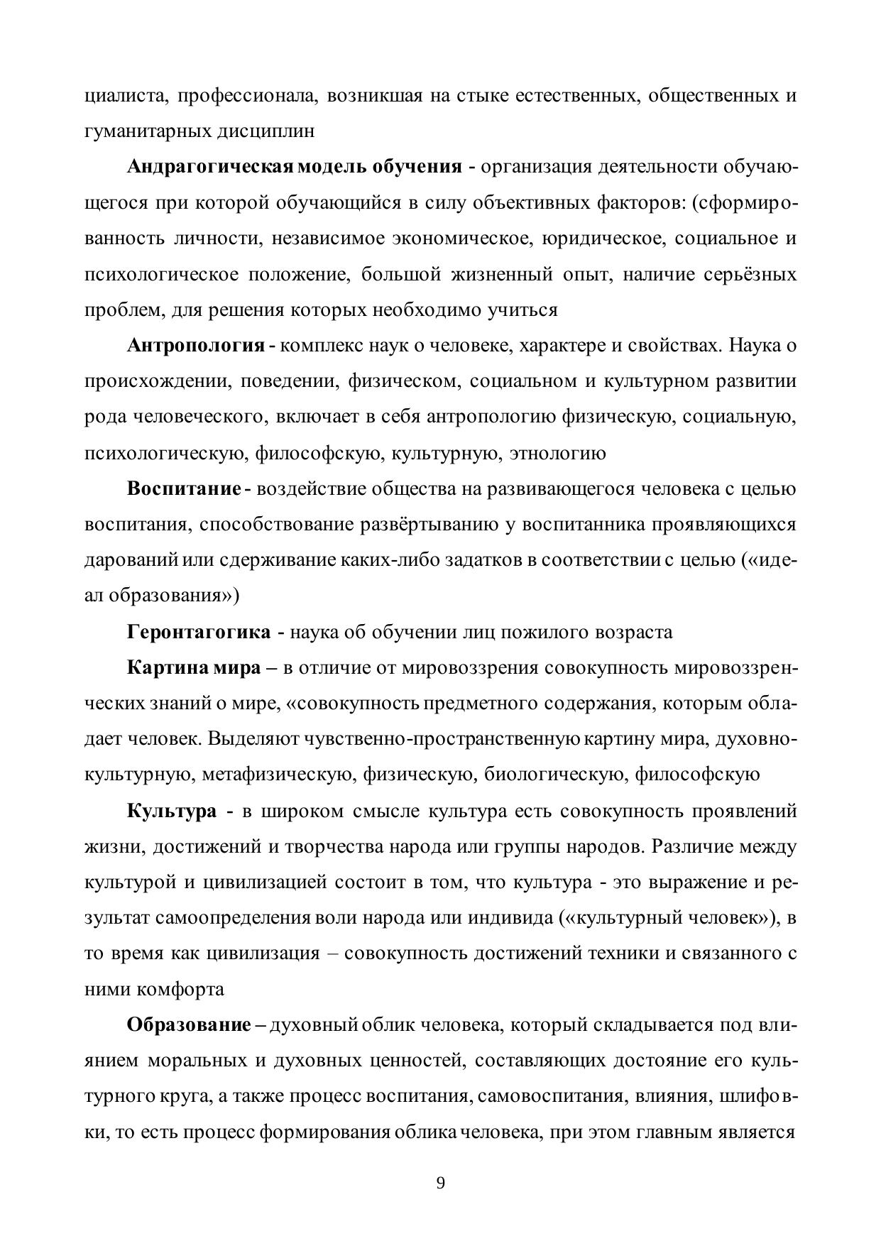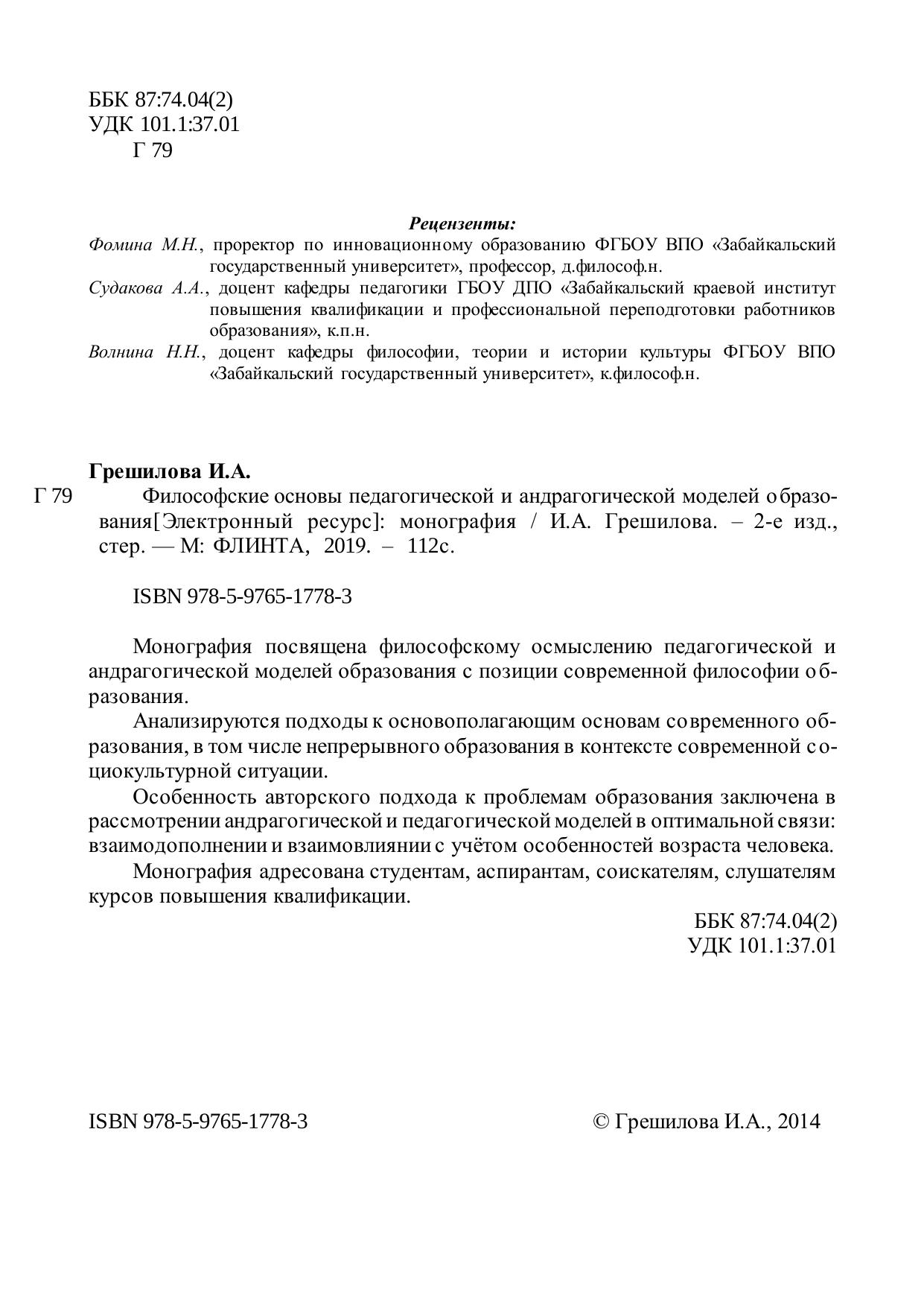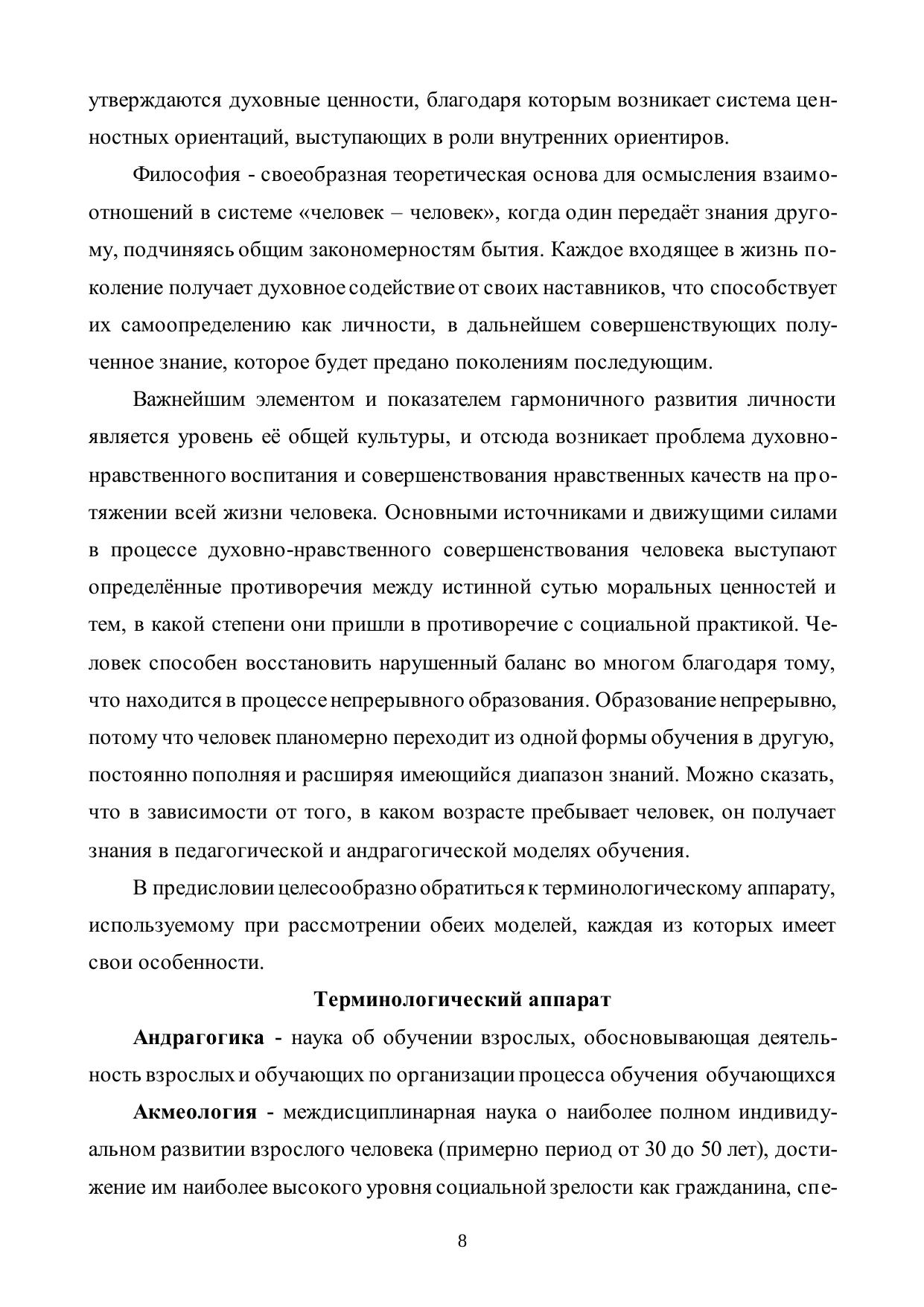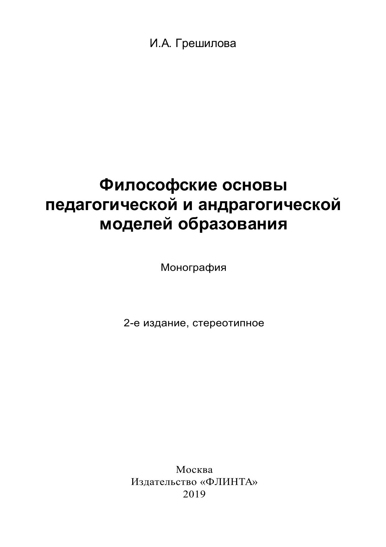 Монография посвящена философскому осмыслению педагогической и андрагогической моделей образования с позиции современной философии образования. Анализируются подходы к основополагающим основам со временного образования, в том числе непрерывного образования в контексте современной социокультурной ситуации. Особенность авторского подхода к проблемам образования заключена в рассмотрении андрагогической и педагогической моделей в оптимальной связи: взаимодополнении и взаимовлиянии с учѐтом особенностей возраста человека. Монография адресована студентам, аспирантам, соискателям, слушателям курсов повышения квалификации.