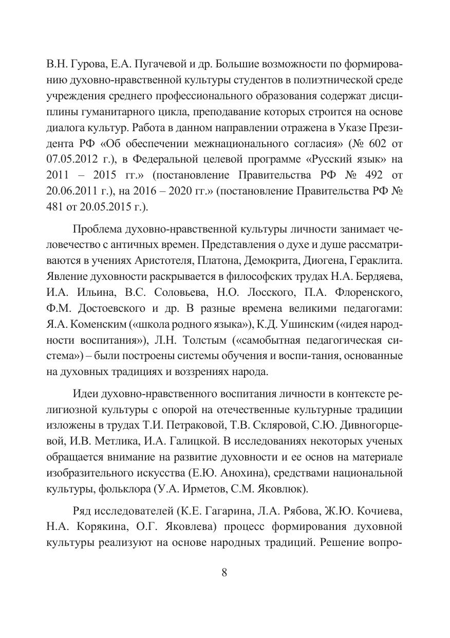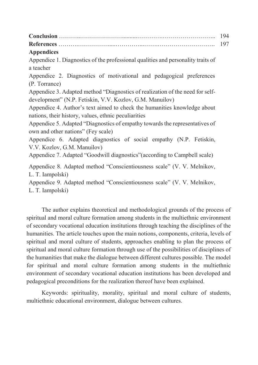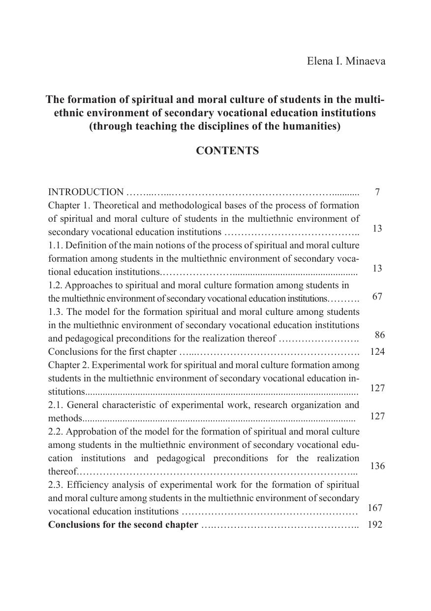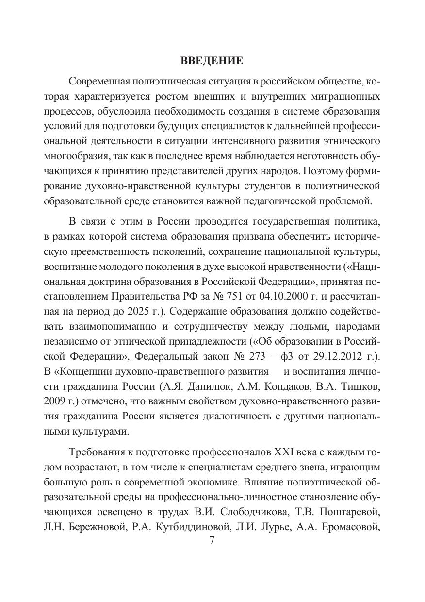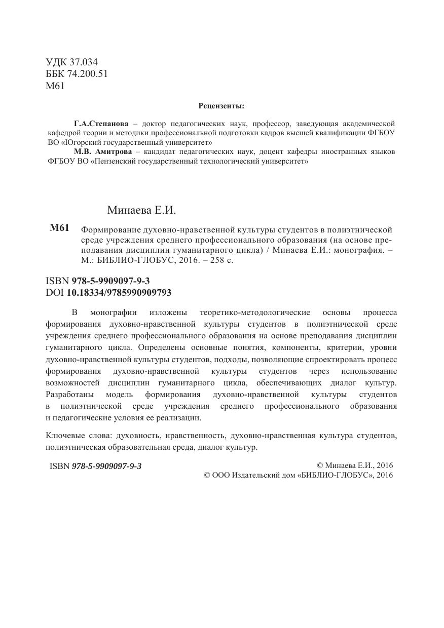 В монографии изложены теоретико-методологические основы процесса формирования духовно-нравственной культуры студентов в полиэтнической среде учреждения среднего профессионального образования на основе преподавания дисциплин гуманитарного цикла. Определены основные понятия, компоненты, критерии, уровни духовно-нравственной культуры студентов, подходы, позволяющие спроектировать процесс формирования духовно-нравственной культуры студентов через использование возможностей дисциплин гуманитарного цикла, обеспечивающих диалог культур. Разработаны модель формирования духовно-нравственной культуры студентов в полиэтнической среде учреждения среднего профессионального образования и педагогические условия ее реализации.