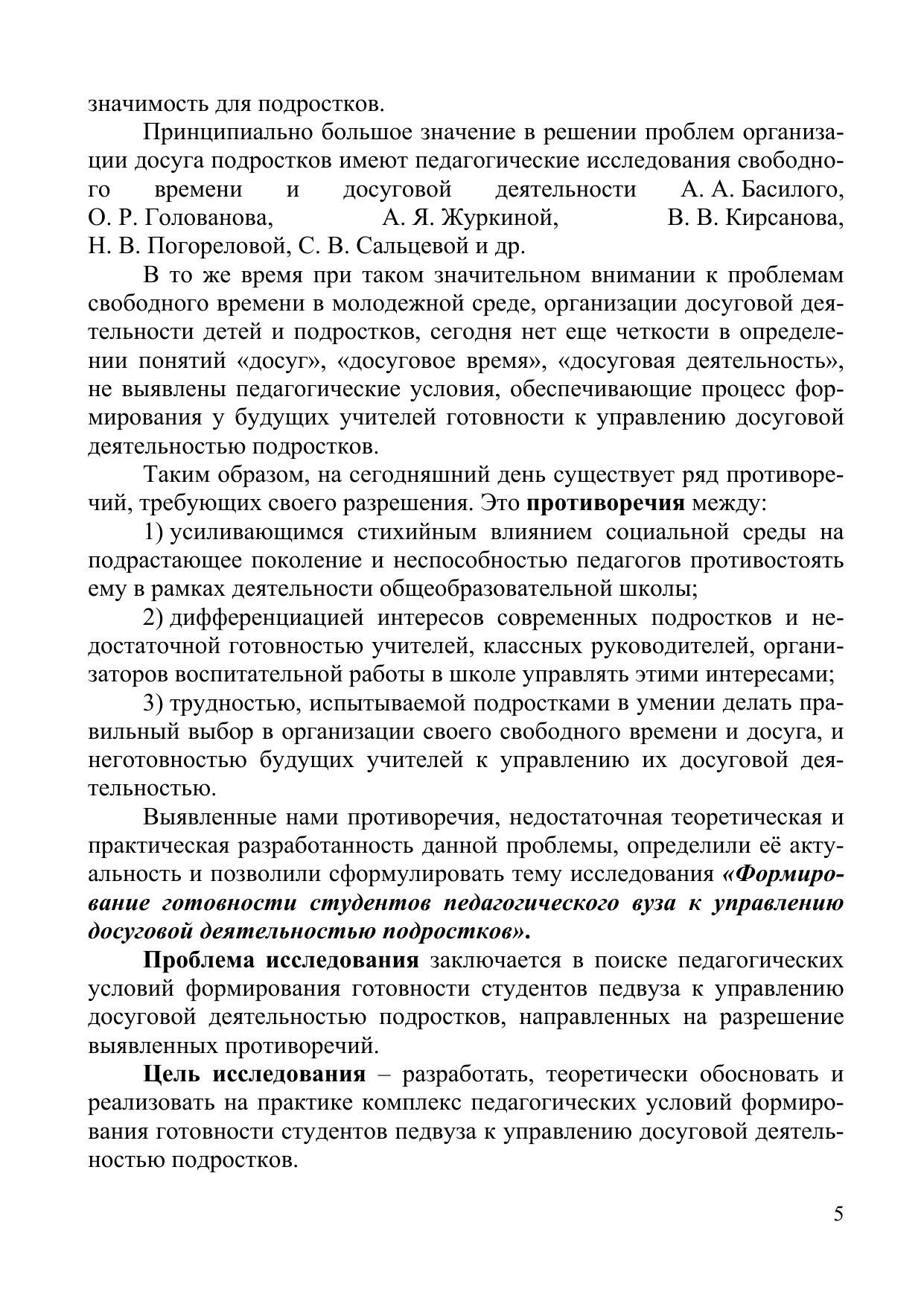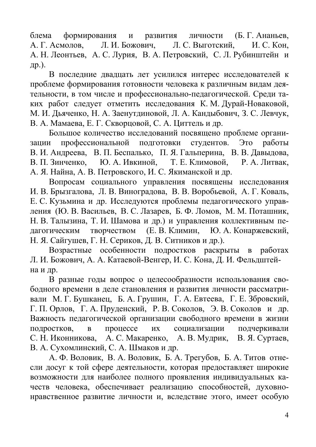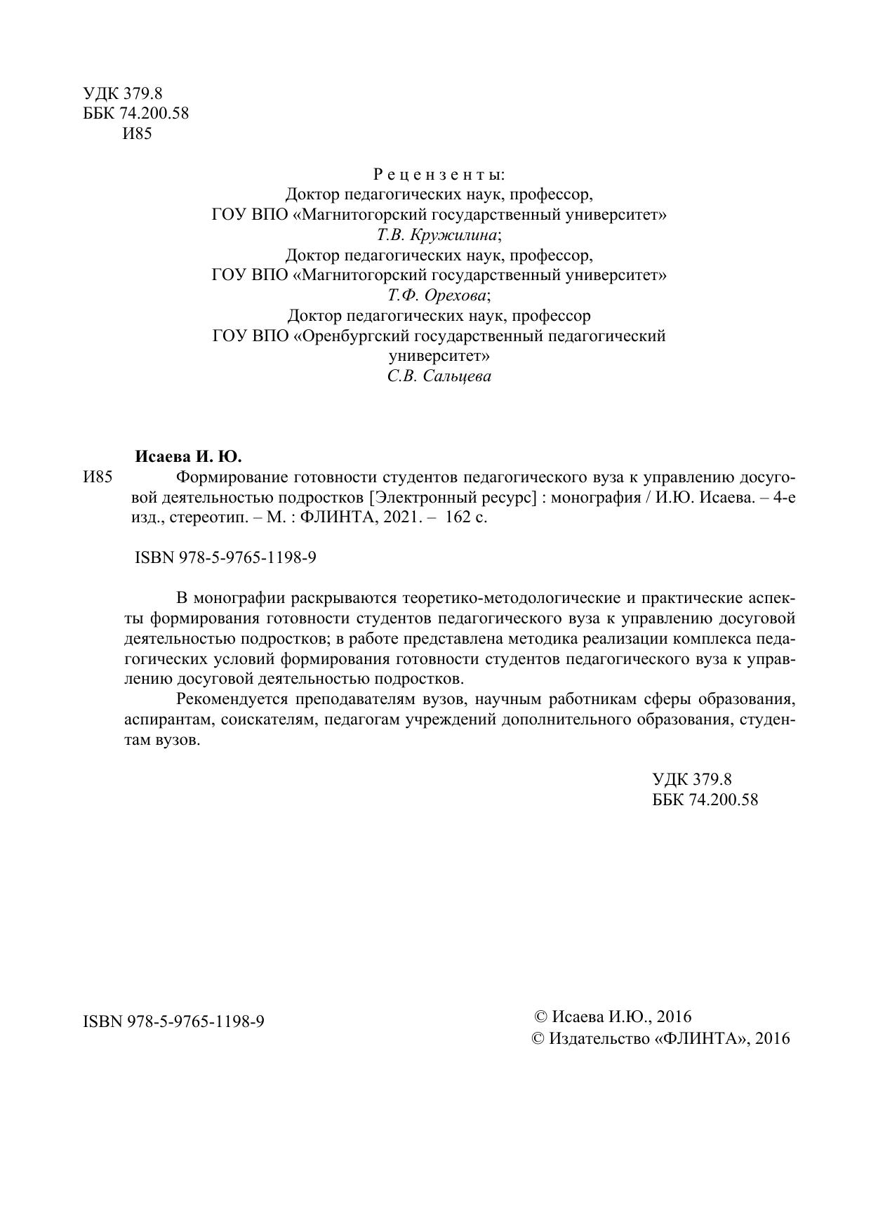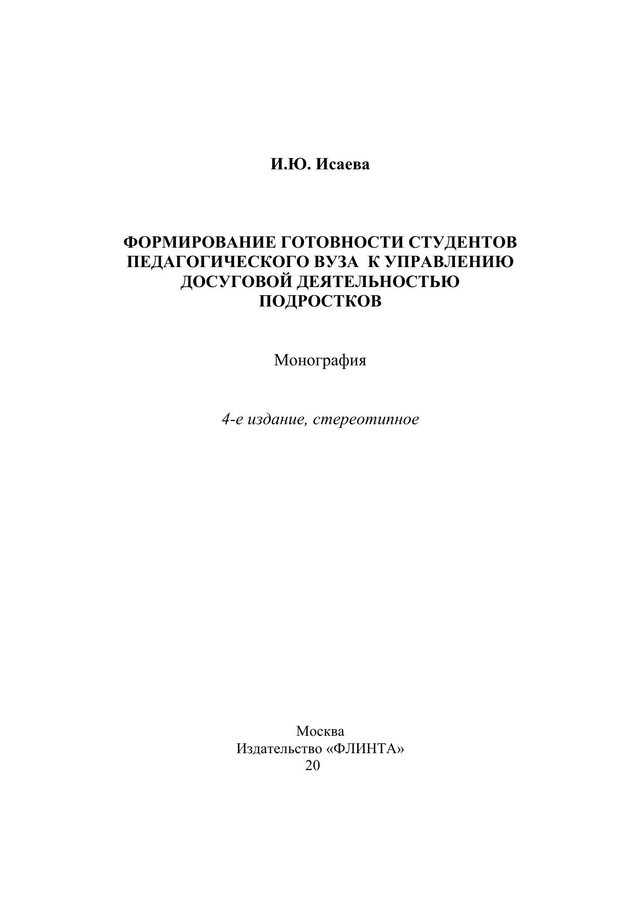 В монографии раскрываются теоретико-методологические и практические аспекты формирования готовности студентов педагогического вуза к управлению досуговой деятельностью подростков; в работе представлена методика реализации комплекс педагогических условий формирования готовности студентов педагогического вуза к управлению досуговой деятельностью подростков.