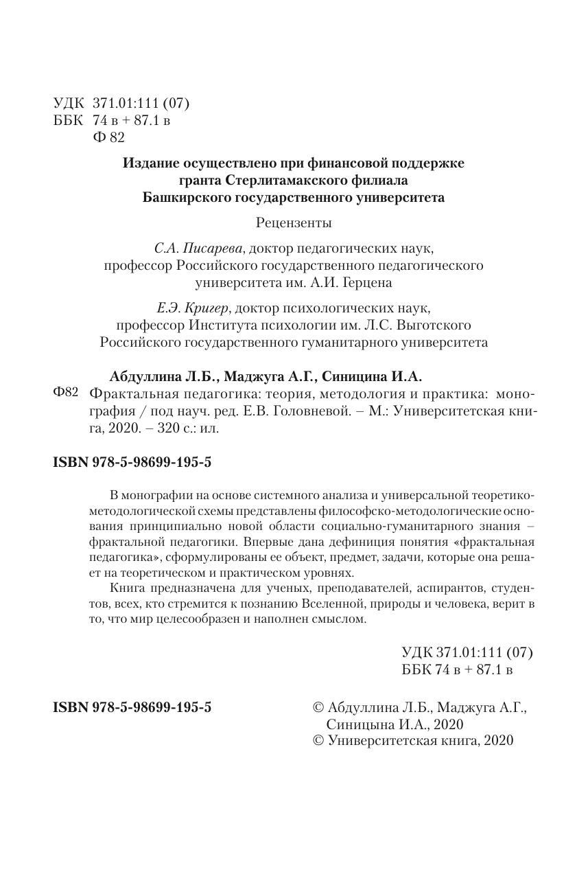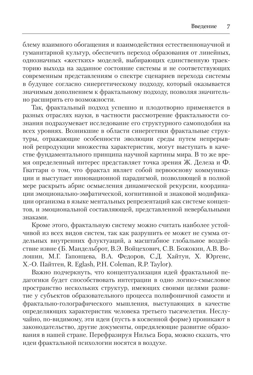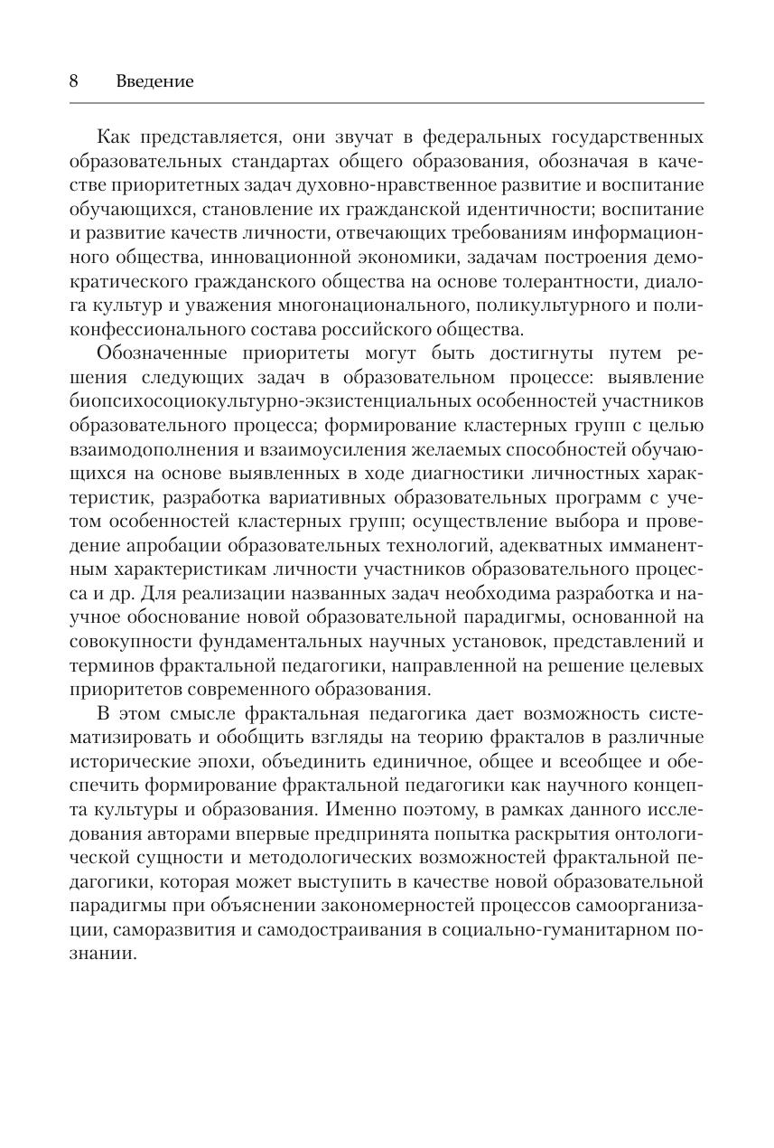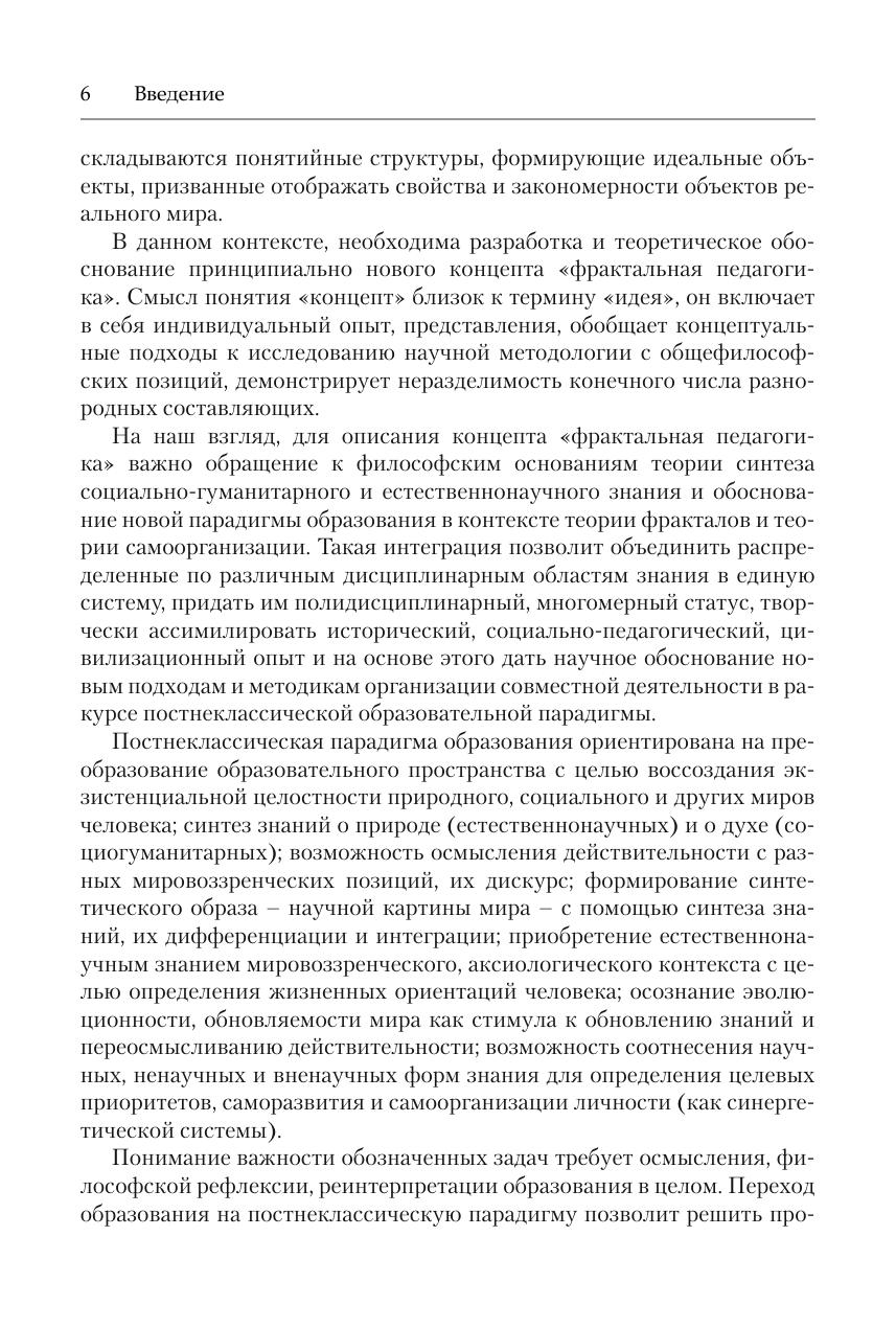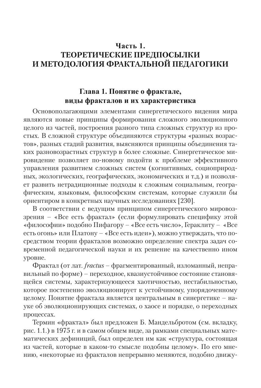 В монографии на основе системного анализа и универсальной теоретикометодологической схемы представлены философско-методологические основания принципиально новой области социально-гуманитарного знания – фрактальной педагогики. Впервые дана дефиниция понятия «фрактальная педагогика», сформулированы ее объект, предмет, задачи, которые она решает на теоретическом и практическом уровнях. Книга предназначена для ученых, преподавателей, аспирантов, студентов, всех, кто стремится к познанию Вселенной, природы и человека, верит в то, что мир целесообразен и наполнен смыслом.