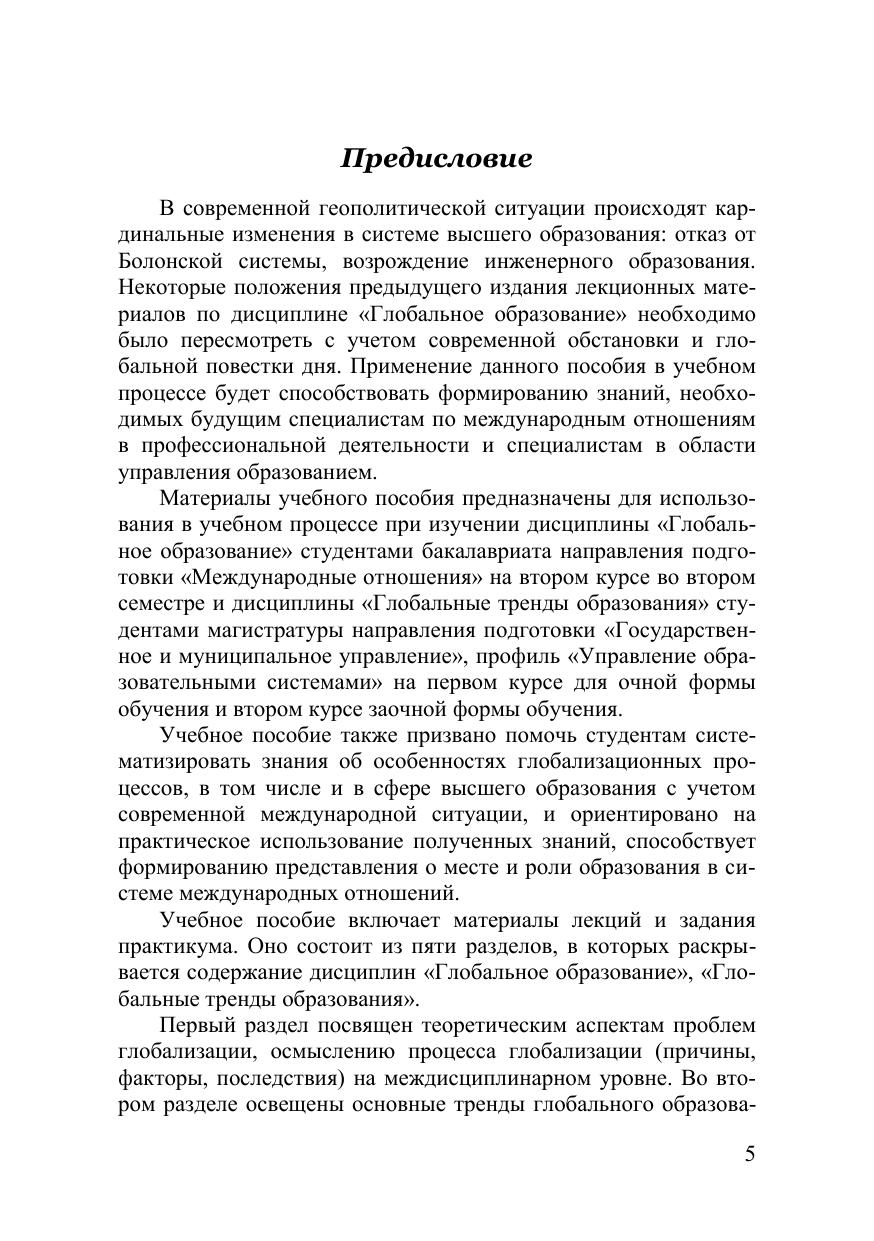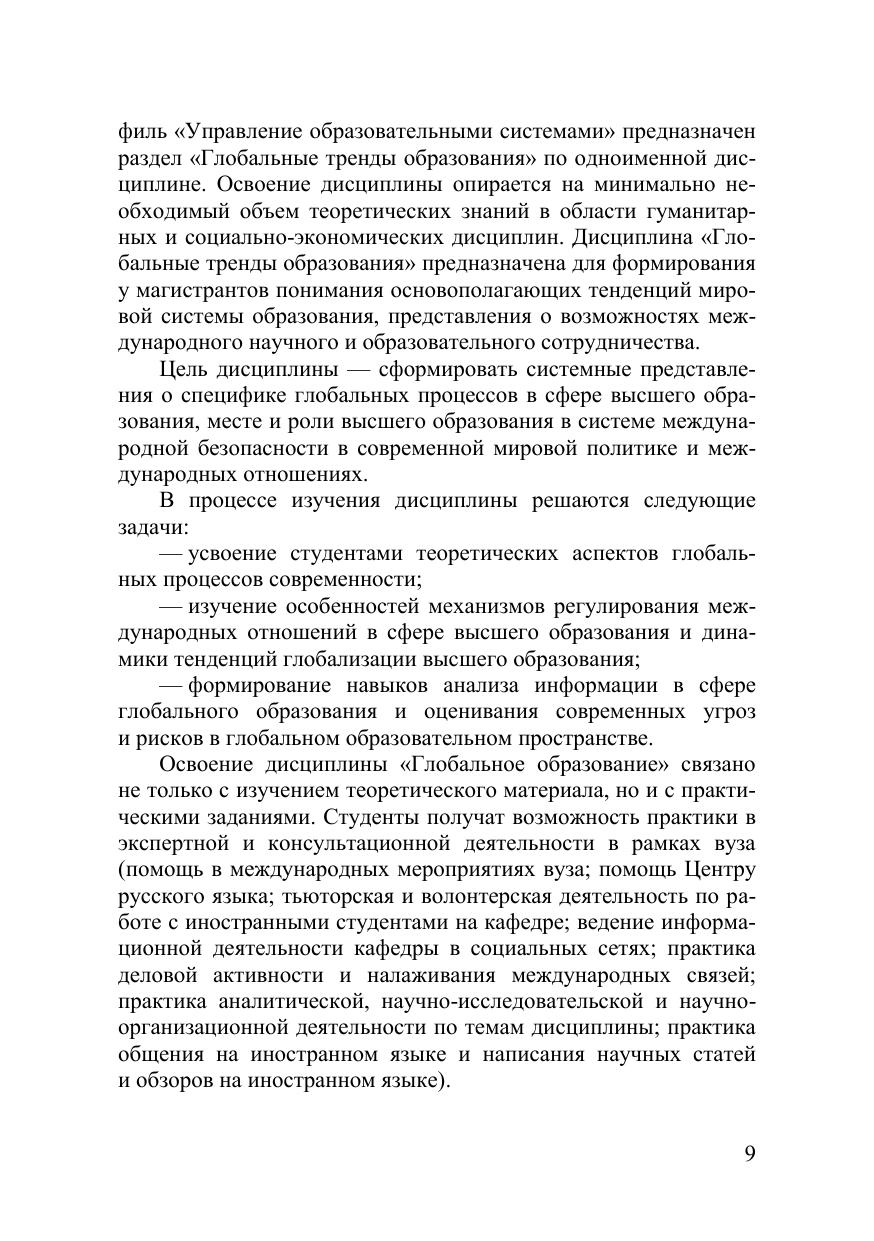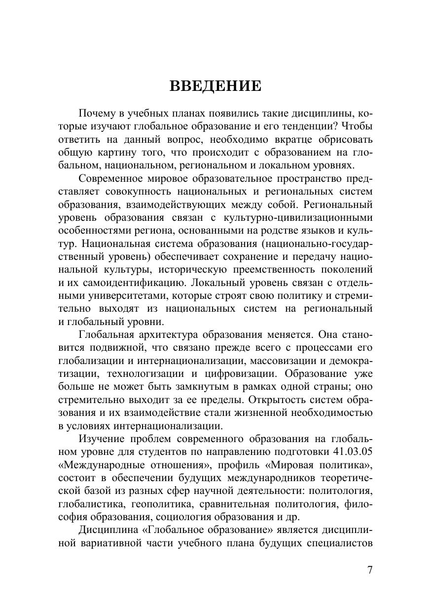 Учебное пособие затрагивает глобальные тренды образования как си-стемного явления, вопросы образовательной политики университетов на гло-бальном уровне, интернационализации высшего образования в условиях глоба-лизации, характеристики систем высшего образования России, США, Герма-нии, Великобритании, Австралии, Японии и Китая, особенности международ-ной консалтинговой деятельности в сфере высшего образования. Учебное пособие предназначено для студентов очной формы обучения направления подготовки 41.03.05 «Международные отношения», профиль «Мировая политика», отдельные главы посвящены темам для студентов маги-стратуры очной и заочной форм обучения направления подготовки 38.04.04 «Государственное и муниципальное управление», профиль «Управление обра-зовательными системами», для специалистов по международным отношениям, образованию, преподавателей соответствующих дисциплин и аспирантам.