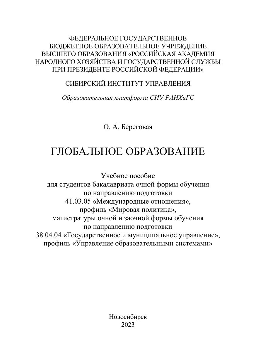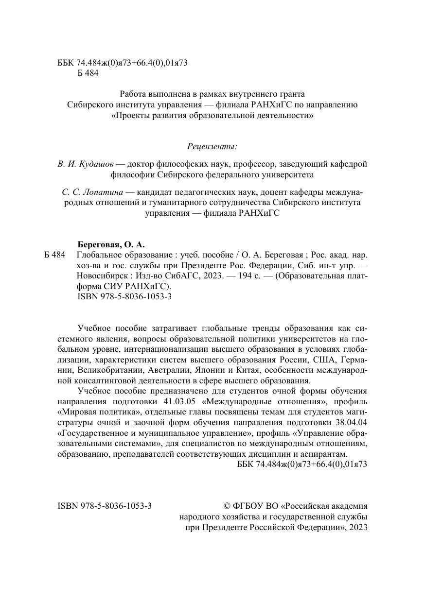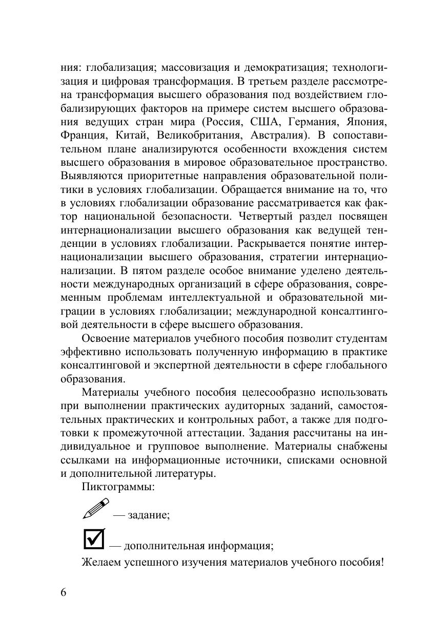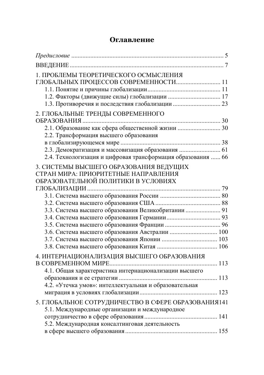 Учебное пособие затрагивает глобальные тренды образования как си-стемного явления, вопросы образовательной политики университетов на гло-бальном уровне, интернационализации высшего образования в условиях глоба-лизации, характеристики систем высшего образования России, США, Герма-нии, Великобритании, Австралии, Японии и Китая, особенности международ-ной консалтинговой деятельности в сфере высшего образования. Учебное пособие предназначено для студентов очной формы обучения направления подготовки 41.03.05 «Международные отношения», профиль «Мировая политика», отдельные главы посвящены темам для студентов маги-стратуры очной и заочной форм обучения направления подготовки 38.04.04 «Государственное и муниципальное управление», профиль «Управление обра-зовательными системами», для специалистов по международным отношениям, образованию, преподавателей соответствующих дисциплин и аспирантам.