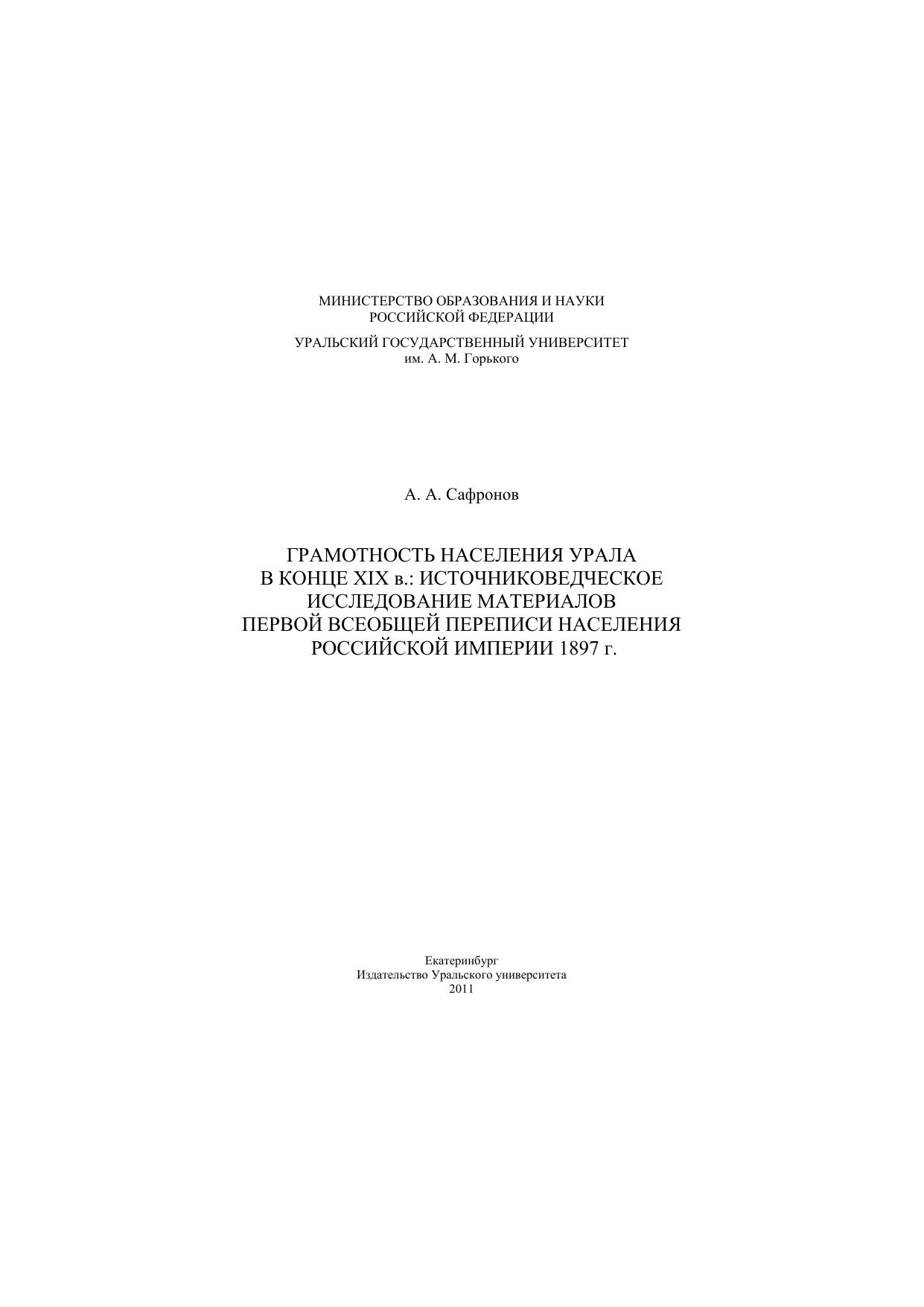 Грамотность населения Урала в конце XIX в.: источниковедческое исследование материалов Первой всеобщей переписи населения Российской империи 1897 г.