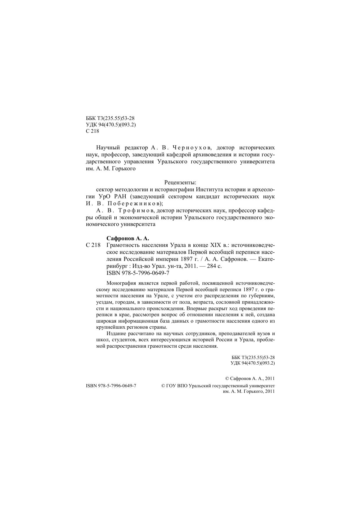 Монография является первой работой, посвященной источниковедческому исследованию материалов Первой всеобщей переписи 1897 г. о грамотности населения на Урале, с учетом его распределения по губерниям, уездам, городам, в зависимости от пола, возраста, сословной принадлежности и национального происхождения. Впервые раскрыт ход проведения переписи в крае, рассмотрен вопрос об отношении населения к ней, создана широкая информационная база данных о грамотности населения одного из крупнейших регионов страны. Издание рассчитано на научных сотрудников, преподавателей вузов и школ, студентов, всех интересующихся историей России и Урала, проблемой распространения грамотности среди населения.