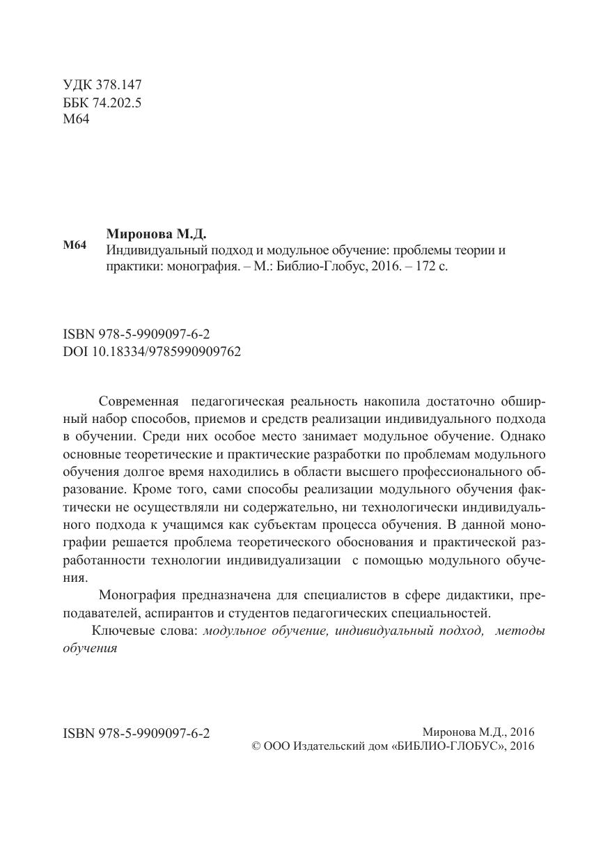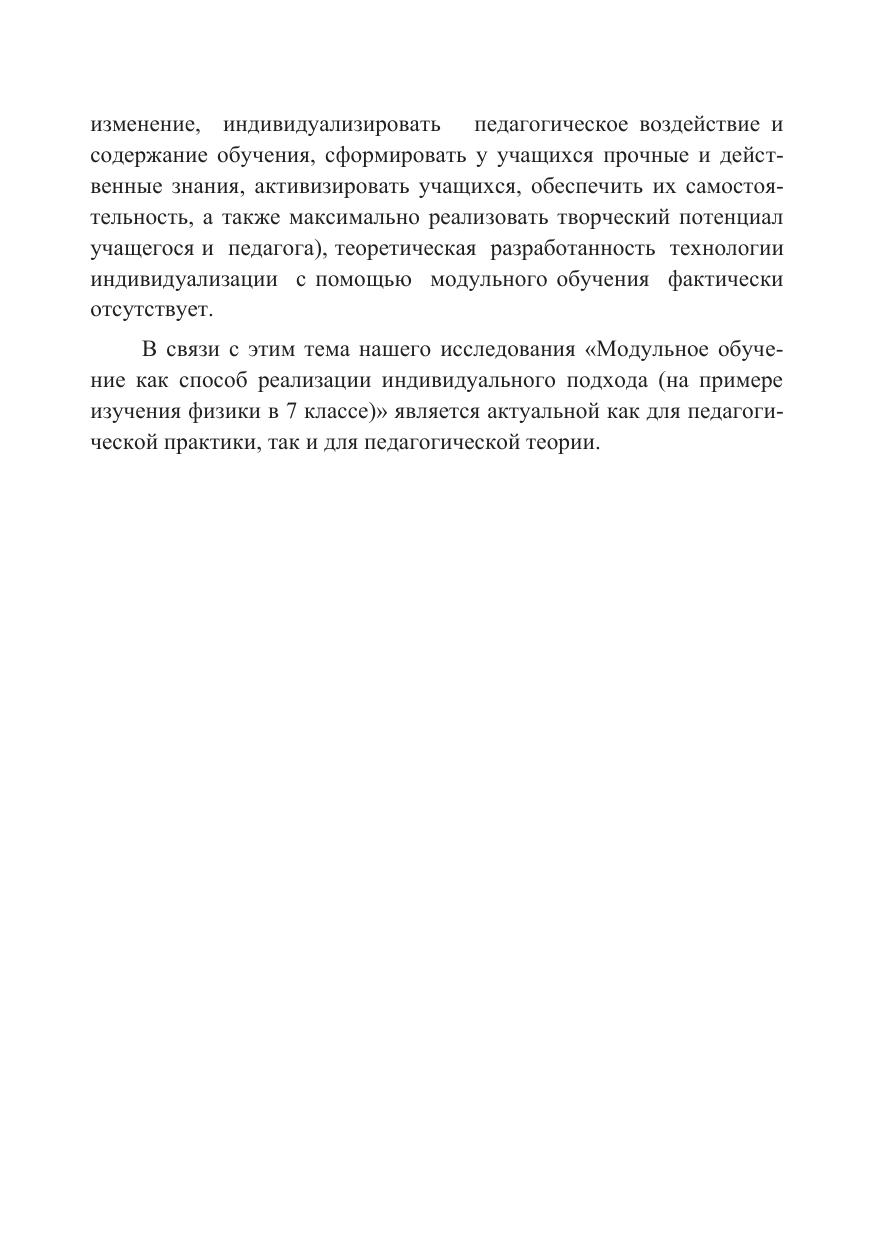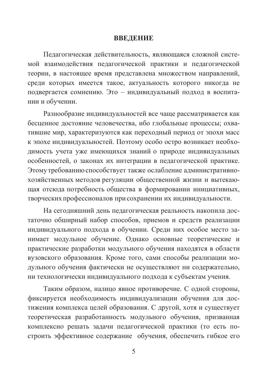 Современная педагогическая реальность накопила достаточно обширный набор способов, приемов и средств реализации индивидуального подхода в обучении. Среди них особое место занимает модульное обучение. Однако основные теоретические и практические разработки по проблемам модульного обучения долгое время находились в области высшего профессионального образование. Кроме того, сами способы реализации модульного обучения фактически не осуществляли ни содержательно, ни технологически индивидуального подхода к учащимся как субъектам процесса обучения. В данной монографии решается проблема теоретического обоснования и практической разработанности технологии индивидуализации с помощью модульного обучения.