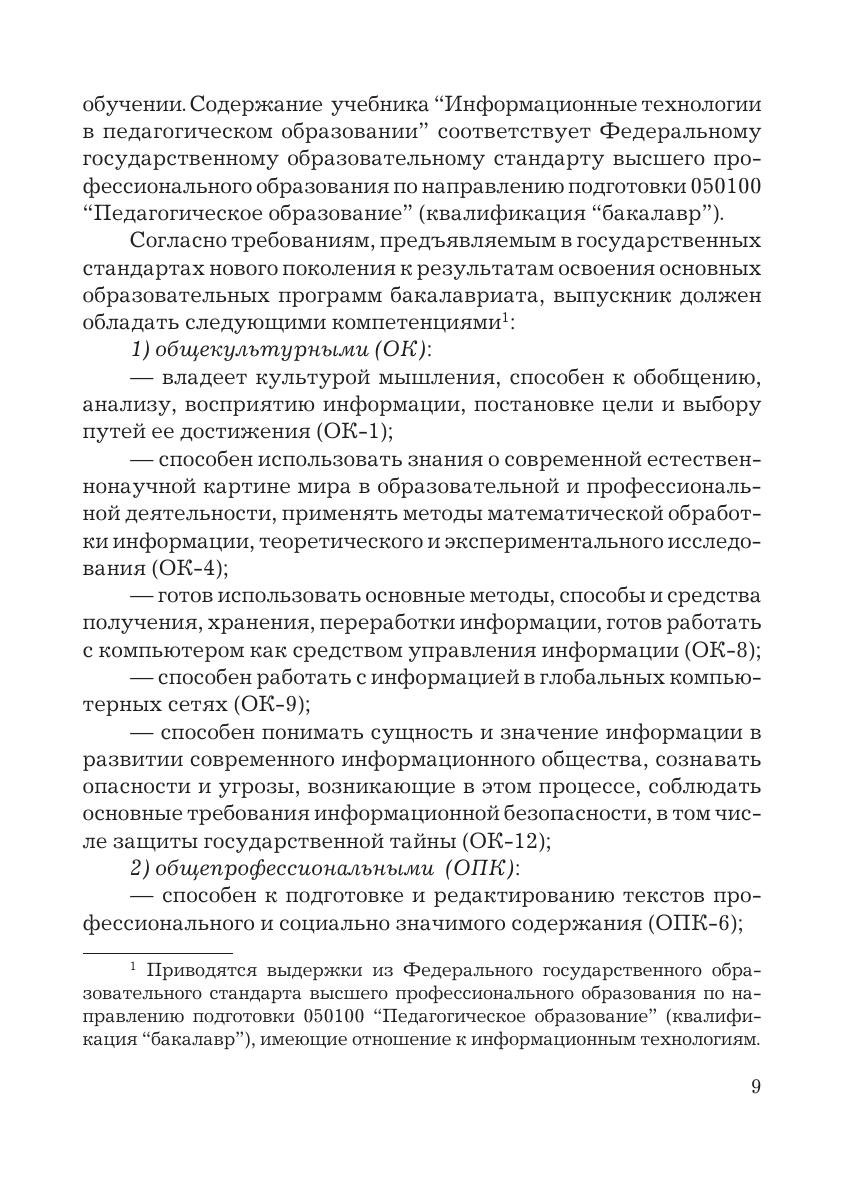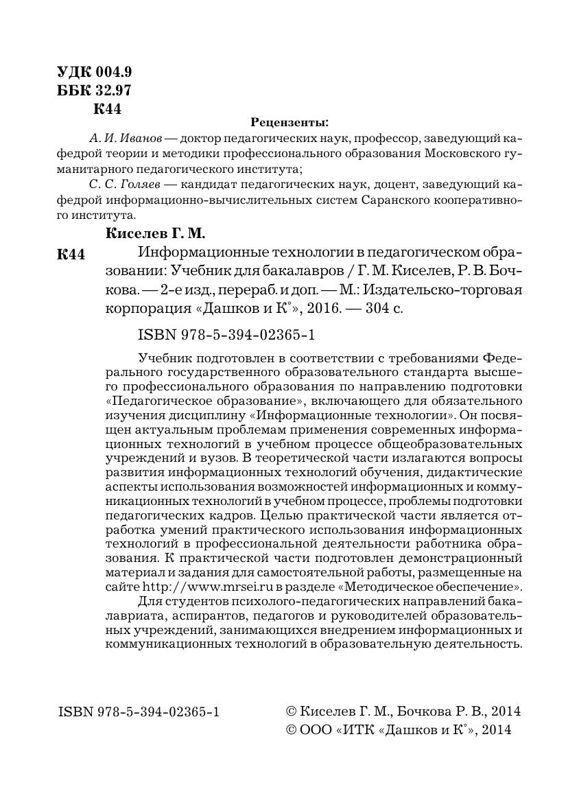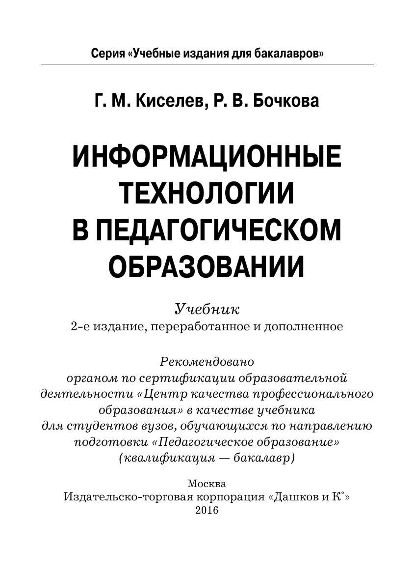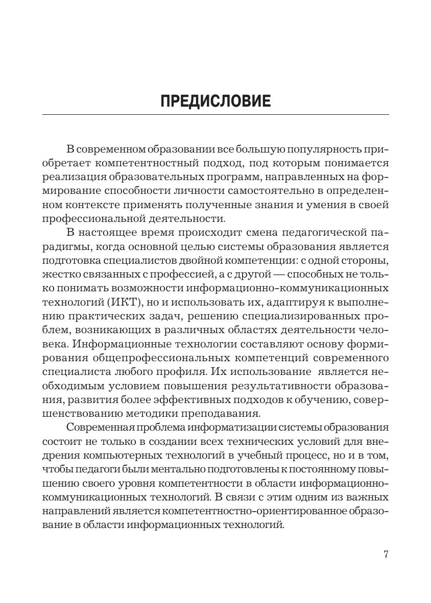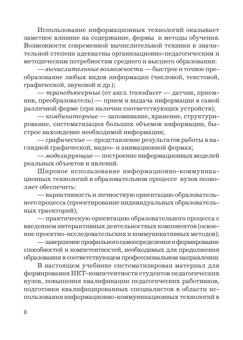 Учебник подготовлен в соответствии с требованиями ФГОС ВПО по направлению подготовки "Педагогическое образование", включающего для обязательного изучения дисциплину "Информационные технологии". Он посвящен актуальным проблемам применения современных информационных технологий в учебном процессе общеобразовательных учреждений и вузов. В теоретической части излагаются вопросы развития информационных технологий обучения, дидактические аспекты использования возможностей информационных и коммуникационных технологий в учебном процессе, проблемы подготовки педагогических кадров. Целью практической части является отработка умений практического использования информационных технологий в профессиональной деятельности работника образования.