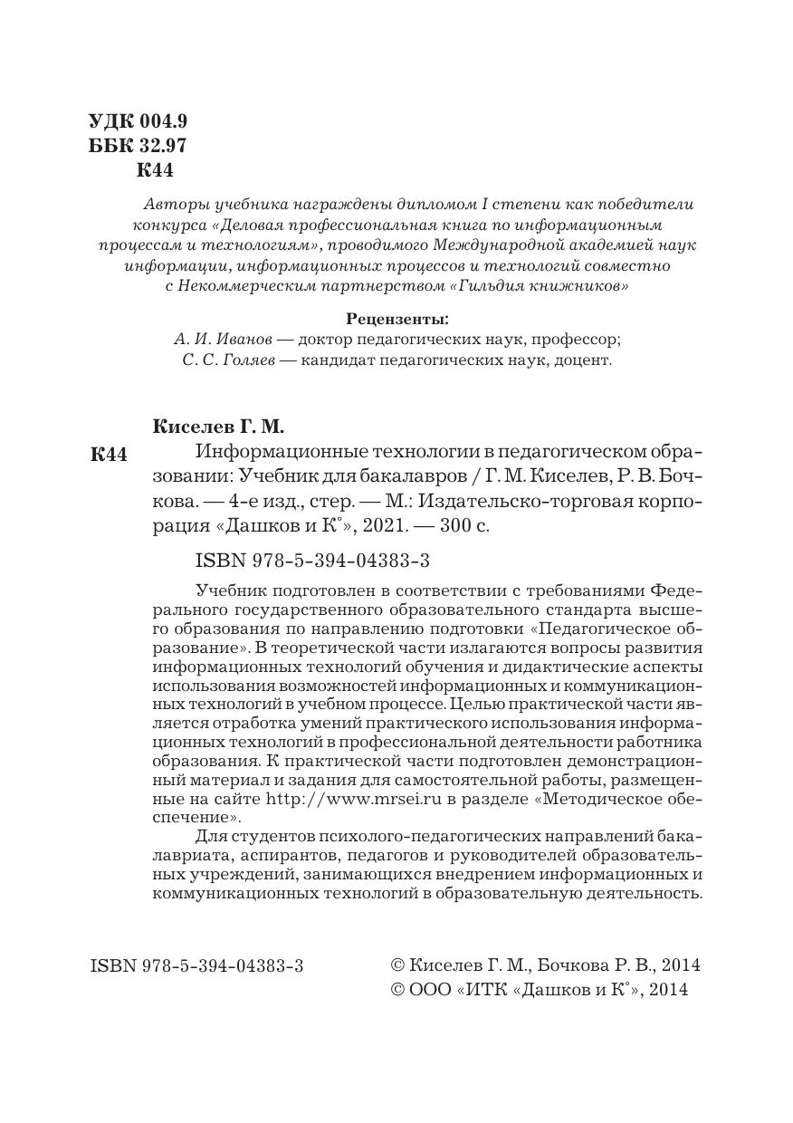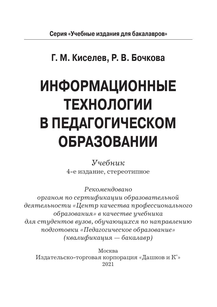 Учебник подготовлен в соответствии с требованиями ФГОС ВПО по направлению подготовки "Педагогическое образование", включающего для обязательного изучения дисциплину "Информационные технологии". Он посвящен актуальным проблемам применения современных информационных технологий в учебном процессе общеобразовательных учреждений и вузов. В теоретической части излагаются вопросы развития информационных технологий обучения, дидактические аспекты использования возможностей информационных и коммуникационных технологий в учебном процессе, проблемы подготовки педагогических кадров. Целью практической части является отработка умений практического использования информационных технологий в профессиональной деятельности работника образования. Для студентов психолого-педагогических направлений бакалавриата, аспирантов, педагогов и руководителей образовательных учреждений, занимающихся внедрением информационных и коммуникационных технологий в образовательную деятельность.