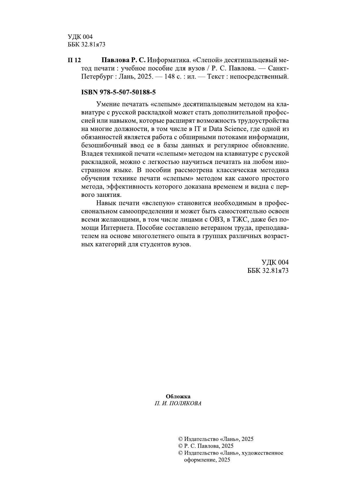 Умение печатать «слепым» десятипальцевым методом на клавиатуре с русской раскладкой может стать дополнительной профессией или навыком, которые расширят возможность трудоустройства на многие должности, в том числе в IT и Data Science, где одной из обязанностей является работа с обширными потоками информации, безошибочный ввод ее в базы данных и регулярное обновление. Владея техникой печати «слепым» методом на клавиатуре с русской раскладкой, можно с легкостью научиться печатать на любом иностранном языке. В пособии рассмотрена классическая методика обучения технике печати «слепым» методом как самого простого метода, эффективность которого доказана временем и видна с первого занятия. Навык печати «вслепую» становится необходимым в профессиональном самоопределении и может быть самостоятельно освоен всеми желающими, в том числе лицами с ОВЗ, в ТЖС, даже без помощи Интернета. Пособие составлено ветераном труда, преподавателем на основе многолетнего опыта в группах различных возрастных категорий для студентов вузов.