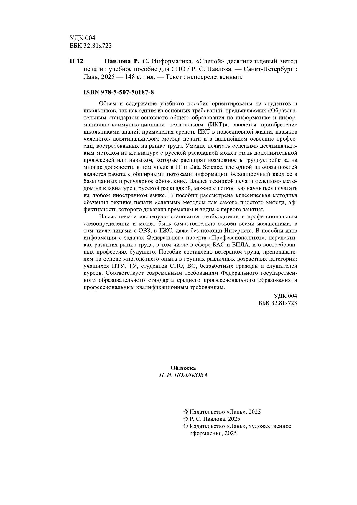 Объем и содержание учебного пособия ориентированы на студентов и школьников, так как одним из основных требований, предъявляемых «Образовательным стандартом основного общего образования по информатике и информационно-коммуникационным технологиям (ИКТ)», является приобретение школьниками знаний применения средств ИКТ в повседневной жизни, навыков «слепого» десятипальцевого метода печати и в дальнейшем освоение профессий, востребованных на рынке труда. Умение печатать «слепым» десятипальцевым методом на клавиатуре с русской раскладкой может стать дополнительной профессией или навыком, которые расширят возможность трудоустройства на многие должности, в том числе в IT и Data Science, где одной из обязанностей является работа с обширными потоками информации, безошибочный ввод ее в базы данных и регулярное обновление. Владея техникой печати «слепым» методом на клавиатуре с русской раскладкой, можно с легкостью научиться печа-тать на любом иностранном языке. В пособии рассмотрена классическая методика обучения технике печати «слепым» методом как самого простого метода, эффективность которого доказана временем и видна с первого занятия. Навык печати «вслепую» становится необходимым в профессиональном самоопределении и может быть самостоятельно освоен всеми желающими, в том числе лицами с ОВЗ, в ТЖС, даже без помощи Интернета. В пособии дана информация о задачах Федерального проекта «Профессионалитет», перспективах развития рынка труда, в том числе в сфере БАС и БПЛА, и о востребованных профессиях будущего. Пособие составлено ветераном труда, преподавателем на основе многолетнего опыта в группах различных возрастных категорий: учащихся ПТУ, ТУ, студентов СПО, ВО, безработных граждан и слушателей курсов. Соответствует современным требованиям Федерального государственного образовательного стандарта среднего профессионального образования и профессиональным квалификационным требованиям.